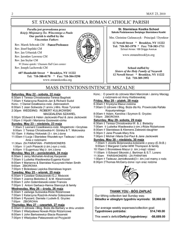 MAY 23, 2010 2 ST. STANISLAUS KOSTKA ROMAN CATHOLIC PARISH St. Stanislaus Kostka School Parafia jest prowadzona przez Księży Misjonarzy Św. Wincentego a Paulo Our parish is staffed by the Vincentian Fathers Szkoła Podstawowa Świętego Stanisława Kostki Mrs. Christine Cieloszczyk - Principal / Dyrektor 12 Newell Street * Brooklyn, NY 11222 Tel: 718-383-1970 * Fax: 718-383-1711 Rev. Marek Sobczak CM - Pastor/Proboszcz Rev. Józef Szpilski CM Rev. Jan Urbaniak CM Rev. Jarosław Lawrenz CM Rev. Jan Szylar CM School Annex: 189 Driggs Avenue www.ststansbrooklyn.org W Domu opieki / Ozanam Hall Care center: School staffed by Sisters of the Holy Family of Nazareth 12 Newell Street * Brooklyn, NY 11222 Tel: 718-389-3991 Rev. Joseph Lachowski CM 607 Humboldt Street * Brooklyn, NY 11222 Tel: 718-388-0170 * Fax: 718-384-5290 www.ststanskostka.org MASS INTENTIONS/INTENCJE MSZALNE Saturday, May 22 - sobota, 22 maja 6:30am † Teresa Chrostowska-Teresa Bagiński 7:00am † Katarzyna Rzeźnik-Jan & Richard Sudol Konc.: † Daniel Dziatłowicz-rodz. Zebrowskich 8:00am † Jean Soliwoda (1 anniv.)-Mrs. Rose Tyranski Konc.: O powrót do zdrowia Marii Marciniak i Janiny Maciąg z rodzinami-od Anny Kielbiowskiej Friday, May 28 – piątek, 28 maja 2:30pm WEDDING: ROBERT KULIKOWSKI MAGDALENA SZAWIEL 6:30am † Krystyna Mazur-rodzina 7:00am O zdrowie i Błog. Boże dla Ks. Prowinciała Rafała Kopystynskiego 8:00am † Adam, Karolina i Szymon-S. Gryziec 5:30pm †Edward & Helen Jackowski-Paul & Jane Jackowski 7:00pm † Hipolit i Marianna Gosiewski-córka Saturday, May 29- sobota, 29 maja Sunday, May 23 – niedziela, 23 maja 7:30am † Leonard Czastkiewicz-rodz. Mogielnicki i Grzybias 9:00am † Teresa Chrostowska-H. Górska & T. Makowska 10:15am † Aleksy Hołowiak (3 r. śm.)-żona 11:00am † Łucja i Stanisław Wszołek-syn Tadeusz i córka Ania z rodzinami 11:30am ZA PARAFIAN - PARISHIONERS 1:00pm † Lech Piasecki (r.śm.)-syn z rodz. 8:00pm † Eugeniusz Maj (r. śm.)-żona Monday, May 24 – poniedziałek, 24 maja 6:30am † Jerzy Michalski-Andrzej Kacperski 7:00am † Ludwika Wasilewska-Eugenia Kozioł 8:00am † Marianna & Stanisław Kuczynski-Helen Smith 7:00pm ZBIOROWA 6:30am † Teresa Chrostowska-W. & J. Bieladzy 7:00am † Ludwika Wasilewska (r.śm.)-Róże Różańcowe 8:00am † Stanisława & Klemens Zalewski-daughter 5:30pm † Jane Prusak-Mary Kris 7:00pm † Michał i Maria Dul-Paul & Jane Jackowski Sunday, May 30 – niedziela, 30 maja 7:30am † Józefa Bolanowska-koleżanki z pracy (E.St.B.) 9:00am † Margaret Carter-M/M Thompson & family 10:15am † Bronisława Mazur (r. śm.)-mąż i dzieci 11:00am † Edward Sikorski-J. Bertman & S.T. Lorenc 11:30am PARISHIONERS - ZA PARAFIAN 1:00pm † Tadeusz Jamiołkowski(3 r. śm.)-od mamy z rodz. 8:00pm †Thomas McGarry-żona i syn oraz rodzina 9:00am ZBIOROWA 7:00pm † Bolesława Lepicka-Stanisława Ingram Tuesday, May 25 – wtorek, 25 maja 6:30am † Czesław Gołaszewski-G.J. Mościcki 7:00am † Joanna Bielonko-Z. & M. Klewinowski 8:00am † John Gołembiewski-sister Frances 7:00pm † Antoni Garbacz-Hanna Stanczyk & family Wednesday, May 26 – środa, 26 maja 6:30am † Jadwiga Sutowska-Róże Różańcowe 7:00am † Katarzyna Rzeźnik-Amelia Gołaszewska 8:00am † Ryszard, Daniela i Ludwik-S. Gryziec 7:00pm ZBIOROWA Thursday, May 27 – czwartek, 27 maja 6:30am O zdrowie i Błog. Boże dla Barbary w dniu urodzin 7:00am † Władysława Nowak-Róże Różańcowe 8:00am † John Bartosiewicz-Stacia Rozanski 7:00pm † Władysław Pałaszewski-od Przyjaciół THANK YOU - BÓG ZAPŁAĆ Our tithing collection last Sunday was: Składka w ubiegłym tygodniu wyniosła: $8,060.00 Our average weekly expenses/collection goal: Tygodniowo potrzeba: $14,749.00 This week’s deficit/Deficyt tygodniowy: -$6,689.00 PATRON 3 PARISH ANNOUNCEMENTS OGŁOSZENIA PARAFIALNE PENTECOST SUNDAY ZESŁANIE DUCHA ŚWIĘTEGO May 23, 2010 SUNDAY: The second collection next Sunday is the monthly collection for our parish school. Our school needs your financial help. Your support of our school is greatly appreciated. MONDAY: May devotions in the English language with adoration of the Blessed Sacrament will be conducted at 6:30PM on Mondays followed by Mass and Novena. Tuesday through Friday May Devotions in Polish will be conducted after the 7:00PM Mass. NEXT SUNDAY: Next Sunday, May 30 at 9:00am a special Mass of Thanksgiving will be celebrated by Fr. Edmund Gutowski, CM to commemorate his 50th Anniversary in the Priesthood. We encourage everyone to participate in this special Anniversary Mass of a Priest who is a member of the Congregation of the Mission, who spent many years ministering at this parish, and is a parishioner of St. Stanislaus Kostka Parish since birth. We extend to Fr. Ed our best wishes and assure him of our prayerful support. May the Good Lord grant him many more years in ministry and his priestly mission. The second collection next Sunday is for the Annual Catholic Appeal 2010. To date we have collected $13,472 of our goal of $55,000 goal assigned to our parishioners by the Bishop. Please help us to collect the balance of $41,528 as soon as possible. INFORMATION: The repairs to the lightning rods on the tallest steeple of the the church have been completed. During the most recent electrical storms the lightning rods were so severely damaged that they needed to be replaced. This was a very dangerous and difficult job technically. Thank God that everything went well, and we are again protected from the possibility of this natural disaster. Unfortunately, the cost of this replacement was very expensive. The total cost of the project cost over $20,000. In the special collection designated for this purpose, we collected $4,700 (i.e., an average of about $1.60 per person attending Sunday Mass on that day). Anyone still interested in making a donation can do so at the rectory office. As always, thank you for your generosity for the good of the pari