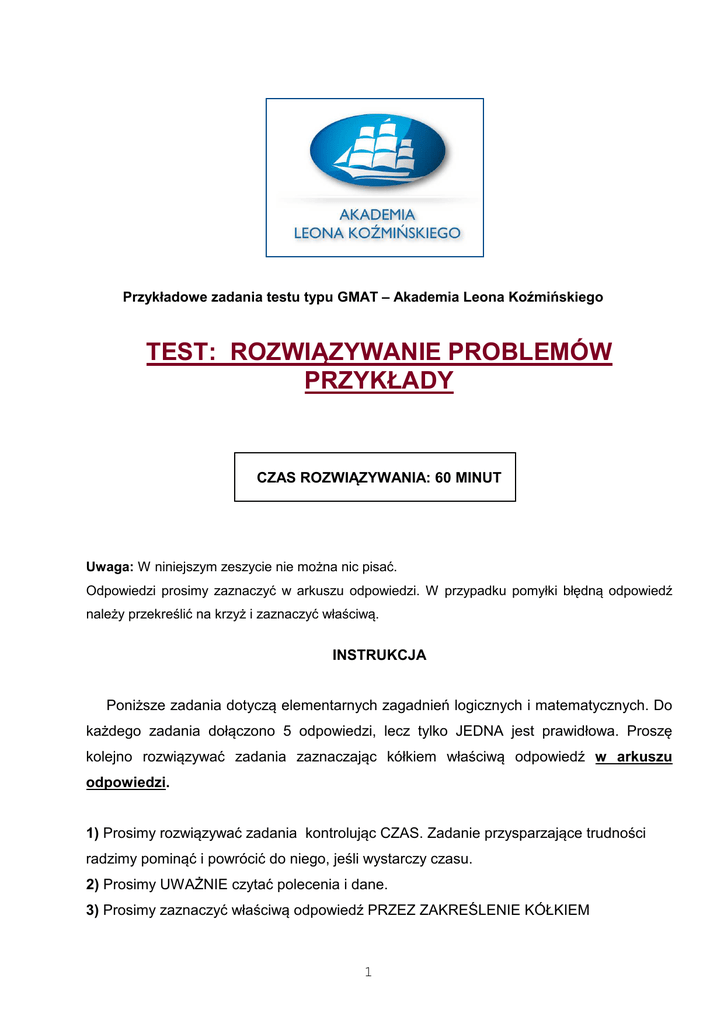 Przykładowe zadania testu typu GMAT – Akademia Leona Koźmińskiego TEST: ROZWIĄZYWANIE PROBLEMÓW PRZYKŁADY CZAS ROZWIĄZYWANIA: 60 MINUT Uwaga: W niniejszym zeszycie nie można nic pisać. Odpowiedzi prosimy zaznaczyć w arkuszu odpowiedzi. W przypadku pomyłki błędną odpowiedź należy przekreślić na krzyż i zaznaczyć właściwą. INSTRUKCJA Poniższe zadania dotyczą elementarnych zagadnień logicznych i matematycznych. Do każdego zadania dołączono 5 odpowiedzi, lecz tylko JEDNA jest prawidłowa. Proszę kolejno rozwiązywać zadania zaznaczając kółkiem właściwą odpowiedź w arkuszu odpowiedzi. 1) Prosimy rozwiązywać zadania kontrolując CZAS. Zadanie przysparzające trudności radzimy pominąć i powrócić do niego, jeśli wystarczy czasu. 2) Prosimy UWAŻNIE czytać polecenia i dane. 3) Prosimy zaznaczyć właściwą odpowiedź PRZEZ ZAKREŚLENIE KÓŁKIEM 1 Uwaga: RYSUNKI NIE SĄ WYMIAROWE ! PRZYKŁAD: W ciągu ośmiu miesięcy Jan zaoszczędził 35 200 zł. Ile średnio pieniędzy miesięcznie udawało się Janowi zaoszczędzić ? A) 4100 D) 4600 B) 4350 E) 4900 C) 4400 Rozwiązanie: Na osiem miesięcy oszczędzania przypada kwota 35 200 czyli na miesiąc 32 500 : 8 = 4400 zł. Prawidłową odpowiedzią jest C. 2 TEST: ROZWIĄZYWANIE PROBLEMÓW 1) Stosunek długości krawędzi sześcianu A, do długości krawędzi sześcianu B wynosi 2:1. Jaki jest stosunek sumy pól powierzchni ścian bocznych sześcianu A do sumy pól powierzchni ścian bocznych sześcianu B ? A) 1:2 D) 4:1 B) 2:1 E) 8:1 C) 3:1 Poprawna odpowiedź: D 2) 1970 1972 1974 1976 1978 1980 A 4,20 4,60 5,00 5,40 5,80 6,20 B 6,30 6,45 6,60 6,75 6,90 7,05 Powyższa tabela pokazuje wzrost cen produktów A i B (w zł.) w latach 1970-1980. W którym roku produkt A będzie kosztował o 40gr więcej niż produkt B ? A) 1984 D) 1988 B) 1986 E) 1990 C) 1987 Poprawna odpowiedź: E 3 3) Jan ma wystarczającą ilość pieniędzy, aby zakupić 45 żetonów. Gdyby każdy żeton kosztował o 10 gr mniej Jan mógłby kupić o 5 żetonów więcej. Jaką sumę pieniędzy Jan przeznaczył na zakup żetonów ? A) 100 zł D) 40 zł B) 50 zł E) 30 zł C) 45 zł Poprawna odpowiedź: C 4) ←60→ ←70→ ←80→ ← y→ ←x→ ←80→ Na rysunku zaznaczone są długości ( poziome ) każdego z prostokątów. Jaka jest suma długości x+y ? A) 40 D) 90 B) 50 E) nie można tego określić C) 80 Poprawna odpowiedź: E 4 5) Który z poniższych ciężarów nie może być odważony na wadze szalkowej przy użyciu następujących odważników: 1g, 4g, 7g, 10g ( każdego odważnika można użyć tylko raz )? A) 13 g D) 19 g B) 15 g E) 21 g C) 17 g Poprawna odpowiedź: D 6) The firs 100 copies of a poster cost x cents each; after the first 100 copies have been made, extra copies cost x cents each. How many cents will it cost to make 300 4 copies of a poster? A) 100x D) 300x B) 150x E) 400x C) 200x Poprawna odpowiedź: B 5 7) John weighs twice as much as Mark. Mark’s weight is 60% of Bob’s weight. David weighs 50% of Luke weight. Luke weighs 190% of John’s weight. Which of these 5 persons weighs the least? A) Bob D) Luke B) David E) Mark C) John Poprawna odpowiedź: E 8) If in 2006, 2007 and 2008 a worker received 10% more in salary each year than he did the previous year, how more did he receive in 2008 than in 2006? A) 10% D) 21% B) 11% E) 30% C) 20% Poprawna odpowiedź: D 6 9) If 8a = 6b, and 3a = 0, then: A) a and b are equal B) a=6 C) b 4 = a 3 D) E) a = 6, b = 8 a 3 = b 4 Poprawna odpowiedź: A 10) What is the maximum number of points of intersection of two circles which have unequal radius? A) none D) 3 B) 1 E) infinite C) 2 Poprawna odpowiedź: C 7 TEST: UŻYTECZNOŚĆ DANYCH PRZYKŁADY CZAS ROZWIĄZYWANIA: 60 MINUT Uwaga: W niniejszym zeszycie nie można nic pisać. Proszę kolejno rozwiązywać zadania zaznaczając kółkiem właściwą odpowiedź w arkuszu odpowiedzi. PROSZĘ NIE SZUKAĆ ROZWIĄZANIA MATEMATYCZNEGO TYCH ZADAŃ ! RYSUNKI NIE SĄ WYMIAROWE ! INSTRUKCJA W tej części testu każde zadanie uzupełnione jest dwiema informacjami oznaczonymi liczbami I i II. Należy podjąć decyzję czy informacje te są wystarczające, aby odpowiedzieć na postawione pytanie. Do wyboru jest pięć odpowiedzi: A) wykorzystanie informacji I wystarcza do odpowiedzi na pytanie B) wykorzystanie informacji II wystarcza do odpowiedzi na pytanie C) obie informacje I i II razem pozwolą odpowiedzieć na pytanie D) zarówno informacja I jak i informacja II niezależnie od siebie pozwalają odpowiedzieć na pytanie E) obie informacje I i II nie są wystarczające aby odpowiedzieć na pytanie 1 PRZYKŁAD: P x W trójkącie PQR jaka jest wartość kąta x ? I) PQ = PR y II) y = 40 Q z R Rozwiązanie : Z informacji I wynika, że PQ = PR to znaczy że trójkąt ten jest równoramienny, czyli y = z. Wiadomo, że suma kątów trójkąta wynosi 1800, więc x + 2y = 180. Informacja I nie podaje miary kąta y, a więc informacja ta nie wystarcza , aby udzielić odpowiedzi. Informacja II sama w sobie, y = 40, nie pozwala na wnioskowanie o wartości innych kątów, więc nie wystarcza do odpowiedzi na pytanie. Jeśli jednak znamy obie informacje: I i II, to możemy znaleźć miarę kąta x. Prawidłową odpowiedzią jest C. 2 TEST : UŻYTECZNOŚĆ DANYCH 1) Jaka jest odległość pomiędzy Paryżem a Warszawą ? I) Samolot lecący z prędkością 750 km/h potrzebuje 3 1/2 godziny na przebycie tego dystansu. II) Samolot ten zużywa 12 litrów paliwa na 1km lotu. Poprawna odpowiedź: A 2) Który z czterech mężczyzn jest najwyższy ? I) Jakub jest niższy od Stefana. II) Marek i Stefan są niżsi od Karola. Poprawna odpowiedź: C 3) Ile stopni Celcjusza odpowiada 1000 Fahrenheit’a 5 I) stopnie Celcjusza = 9 ( stopnie Fahrenheit’a -32 ) 9 II) stopnie Fahrenheit’a = 5 stopnie Celcjusza + 32 Poprawna odpowiedź: D 4) Przyjmując, że m i n są różne od zera, czy wynik działania m2n jest dodatni? 3 I) m > 0 II) n > 0 Poprawna 