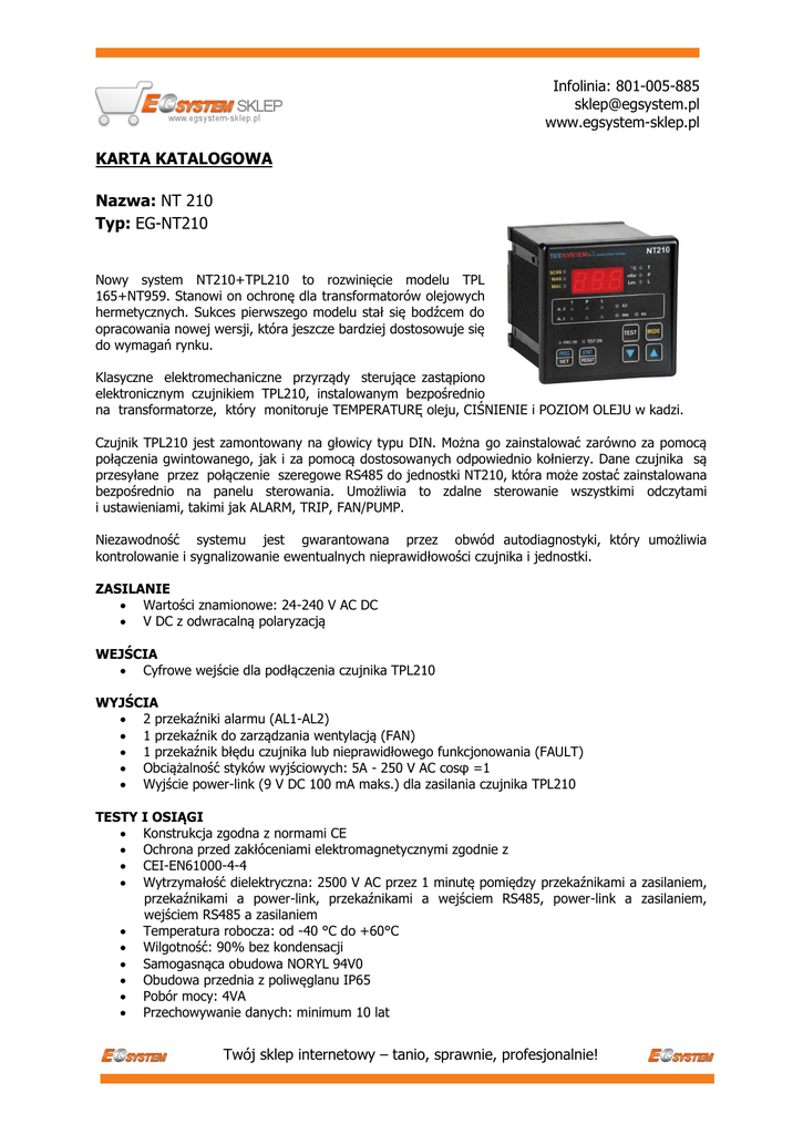 KARTA KATALOGOWA Nazwa: NT 210 Typ: EG - egsystem