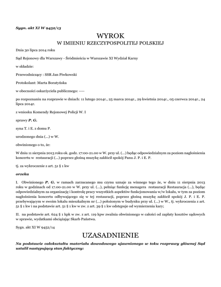 Sygn. akt XI W 9452/13 WYROK W IMIENIU RZECZYPOSPOLITEJ POLSKIEJ Dnia 30 lipca 2014 roku Sąd Rejonowy dla Warszawy - Śródmieścia w Warszawie XI Wydział Karny w składzie: Przewodniczący : SSR Jan Piwkowski Protokolant: Marta Boratyńska w obecności oskarżyciela publicznego: ---po rozpoznaniu na rozprawie w dniach: 11 lutego 2014r., 25 marca 2014r., 29 kwietnia 2014r., 05 czerwca 2014r., 24 lipca 2014r. z wniosku Komendy Rejonowej Policji W. I sprawy P. G. syna T. i E. z domu P. urodzonego dnia (...) w W. obwinionego o to, że: W dniu 11 sierpnia 2013 roku ok. godz. 17:00-21.00 w W. przy ul. (...) będąc odpowiedzialnym za poziom nagłośnienia koncertu w restauracji (...) poprzez głośną muzykę zakłócił spokój Panu J. P. i E. P. tj. za wykroczenie z art. 51 § 1 kw orzeka I. Obwinionego P. G. w ramach zarzucanego mu czynu uznaje za winnego tego że, w dniu 11 sierpnia 2013 roku w godzinach od 17.00-21.00 w W. przy ul. (...), pełniąc funkcję menagera restauracji Restauracja (...), będąc odpowiedzialnym za organizację i kontrolę pracy wszystkich aspektów funkcjonowania w/w lokalu, w tym za poziom nagłośnienia koncertu odbywającego się w tej restauracji, poprzez głośną muzykę zakłócił spokój J. P. i E. P. przebywającym w swoim lokalu mieszkalnym nr (...) położonym w budynku przy ul. (...) w W., tj. wykroczenia z art. 51 § 1 kw i na podstawie art. 51 § 1 kw w zw. z art. 39 § 1 kw odstępuje od wymierzenia kary; II. na podstawie art. 624 § 1 kpk w zw. z art. 119 kpw zwalnia obwinionego w całości od zapłaty kosztów sądowych w sprawie, wydatkami obciążając Skarb Państwa. Sygn. akt XI W 9452/14 UZASADNIENIE Na podstawie całokształtu materiału dowodowego ujawnionego w toku rozprawy głównej Sąd ustalił następujący stan faktyczny: W budynku na ulicy (...) w W. - nieruchomości należącej do (...)funkcjonuje restauracja o nazwie Restauracja (...), której właścicielem jest J. J. (1), jednocześnie właściciel firmy (...) Sp. z o.o., Sp. k. Na tyłach powyższego budynku znajduje się patio - ogródek o powierzchni około 500 m, który na podstawie umowy popisanej przez w/w lokal wraz z (...) właścicielem kamienicy jest wynajmowany przez Restaurację (...), celem prowadzenia letniego ogrodu artystycznego (zeznania świadka J. J. (1) k. 162). Osobą pełniącą funkcję menagera w powyżej restauracji jest P. G. – będący odpowiedzialnym za organizację i kontrolę pracy wszystkich aspektów funkcjonowania lokalu, w tym za poziom nagłośnienia koncertu odbywającego się w tej restauracji ( wydruk ze strony internetowej dot. obowiązku menagera k. 106, zeznania świadka J. J. (1) k. 162). Ogródek lokalu Restauracja (...) położony jest na tyłach budynku, który jest częścią Osiedla (...), osiedla praktycznie zamkniętego; otoczony zwartą zabudową ze wszystkich stron – w bezpośrednim sąsiedztwie lokali mieszkalnych (zeznania świadka J. P. k. 61). W budynku przy ul. (...) w lokalu (...) (I p.) zamieszkują E. P. i J. P.. W mieszkaniu tym okna znajdują się z obu stron budynku, dwa z nich usytuowane są od strony ul. (...), a cztery okna wychodzą na ogród przedszkolny, który jest połączony przesmykiem z ogrodem, w którym funkcjonuje ogródek restauracji (...) (zeznania świadka J. P. k. 74), w odległości około 20 metrów od okien mieszkania J. i E. P. (zeznania świadka E. P. k. 77). Podczas działalności restauracji (...), latem 2013 roku organizowano w lokalu cykl spotkań, które miały na celu propagowanie kultury i sztuki okresu XX- lecia międzywojennego. Elementem tych spotkań były różnego rodzaju projekcie filmów, pokazy mody z tamtego okresu oraz koncerty. Wykonanie koncertów zostało zlecone profesjonalnej grupie muzyków z zespołu (...). (zeznania świadka J. J. (1) k. 161, 162 kserokopie umów dotyczących organizacji koncertu k. 50-52 zeznania świadka T. B. (1) k. 139). Projekt dotyczący nawiązującego do lat 20 i 30 W. przedwojennej współtworzyło Telewizja (...) oraz wspierała Fundacja (...), z której ramienia jako pomysłodawca występowała K. C. (1). Projekt ten był inicjatywą, która nawiązywała do tradycji przedwojennej W. – lata 20 i 30. Miał za zadanie przywrócić, przypomnieć W. tradycje i historię W., anturaż związany z klimatem przedwojennej W. w zakresie nawiązania do tradycji muzycznej tego okresu, w nawiązaniu do klimatu, atmosfery, elegancji, kindersztuby oraz do tradycji tańca. Projekt (wydarzenia) miało być alternatywą dla wszystkich klubowych przedsięwzięć muzycznych. Było stworzone dla starszych ludzi, dla artystów, aktorów, seniorów, cudzoziemców – chcących zobaczyć kawałek polskiej historii (zeznania świadka K. C. (1) k. 123). W związku z powyższą inicjatywą w lokalu Restauracja (...) rozpoczęto organizację koncertów muzycznych. Podczas nich nawiązywano do tzw. „five’ ów” wydarzeń muzycznych z okresu międzywojennego, które rozpoczynały się o godz. 17.00 i kończyły o godzinie 21.00. Spotkanie te organizowane były co niedziele w okresie letnim 2013 roku (wyjaśnienia obwinionego k. 58, zeznania świadka K. C. (1) k. 123). Koncerty muzyczne odbywały się następujących dniach: 14.07, 21.07, 28.07, 04.08, 11.08, 18.08, 25.08.2013r. (kserokopie umów dot. organizacji koncertu k. 50-52). Wszystkie koncerty były grane przez zespół (...). W skład tejże orkiestry wchodziło 5 muzyków. Były to koncerty typu odeonowego, takie jak grało się w okresie międzywojennym. Zespół był zawężony w stopniu minimalnym, przy zachowaniu brzmienia okresu międzywojennego. Były to tzw. rauty dancingowe od godz. 17.00 do 21.00. Wśród instrumentów była perkusja, kontrabas, pianino, trąbka, flet na zmianę z saksofonem. Pianino grało na swoich wewnętrznych głośnikach, pozostałe instrumenty nie były nagłośnione aby brzmienie nie traciło międzywojennego charakteru. Wraz z zespołem występowała również wok