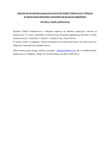 Zaproszenie do złożenia propozycji cenowej dla Szkoły Podstawowej w Długiem na dostarczenie materiałów ćwiczeniowych do języka angielskiego dla klasy I szkoły podstawowej Dyrektor Szkoły Podstawowej w Długiem zaprasza do złożenia propozycji cenowej na dostarczenie 14 sztuk materiałów ćwiczeniowych do języka angielskiego dla klasy I szkoły podstawowej pt.„ Fairyland 1” autorów: Virginia Evans, Jenny Dooley . W ofercie należy uwzględnić wartość materiałów ćwiczeniowych brutto. Do oferty musi być dołączony zaakceptowany projekt umowy. Oferty należy złożyć drogą e-mailową na adres: [email protected] lub w siedzibie Szkoły Podstawowej w Długiem, Długie 10, 38-460 Jedlicze do dnia 10.09.2014 r. UMOWA Nr 20/2014 zawarta w dniu ……………………… 2014 r. w Długiem pomiędzy: Szkołą Podstawową w Długiem, Długie 10, 38-460 Jedlicze, NIP: 684 16 69 710 reprezentowaną przez Elżbietę Leszczyńską - Dyrektora , zwanym w dalszej części umowy Zamawiającym, a …………………………………………………………………………………………………………… …………………………………………………………………………………………………………… …………………………………………………………………………………………………………. zwanym w dalszej części umowy Wykonawcą, o następującej treści: §1 Przedmiotem umowy jest dostawa 14 sztuk materiałów ćwiczeniowych do języka angielskiego dla klasy I szkoły podstawowej pt.„ Fairyland 1” autorów: Virginia Evans, Jenny Dooley . §2 1. Umowa będzie realizowana w terminie do siedmiu dni od dnia jej podpisania. Jednocześnie Wykonawca zobowiązuje się do zabezpieczenia w okresie roku szkolnego 2014/2015 dodatkowego zakupu przez Zamawiającego materiałów ćwiczeniowych w kwocie jednostkowej nie wyższej niż podana w §3. 2. Miejsce realizacji umowy: Szkoła Podstawowa w Długiem, Długie 10, 38-460 Jedlicze, 14 kompletów materiałów ćwiczeniowych . §3 Cena jednostkowa brutto: …………………………(słownie: ……………………………………..) Cena brutto przedmiotu umowy : …………………………….. (słownie: ………………………….) §4 1. Wykonawca oświadcza, że dostarczone materiały ćwiczeniowe są nowe, nienoszące znamion użytkowania , są wolne od wad i korzystanie z nich zgodnie z przeznaczeniem nie narusza prawa, w tym również praw osób trzecich. 2. Wykonanie umowy odbywa się na koszt i ryzyko Wykonawcy. 3. Na Wykonawcy spoczywa odpowiedzialność z tytułu uszkodzenia lub utraty materiałów ćwiczeniowych składających się na przedmiot zamówienia do chwili wydania ich Zamawiającemu. 4. Wydanie przedmiotu umowy Zamawiającemu odbędzie się na podstawie prawidłowo wystawionej faktury VAT. 5. Potwierdzeniem wykonania umowy jest podpisany przez obie strony umowy protokół odbioru materiałów ćwiczeniowych . §5 1. Podstawą zapłaty za realizację umowy będzie prawidłowo wystawiona faktura VAT oraz protokół odbioru materiałów ćwiczeniowych . 2. Za wykonanie przedmiotu umowy Zamawiający zapłaci Wykonawcy przelewem na rachunek wskazany w treści faktury, w terminie 30 dni od daty otrzymania przez Zamawiającego faktury i dokumentów, o których mowa w ust. 1. 3. Za datę dokonania płatności uznaje się dzień obciążenia rachunku bankowego Zamawiającego. §6 1. Wykonawca zapłaci Zamawiającemu kary umowne: a) z tytułu odstąpienia od umowy z powodu okoliczności, za które odpowiada Wykonawca, w wysokości 10 % kwoty, o której mowa w § 3 umowy, b) z tytułu opóźnienia w dostawie materiałów ćwiczeniowych w stosunku do terminu określonego w § 2 ust. 1 w wysokości 0,1 % kwoty, o której mowa w § 3 umowy za każdy dzień opóźnienia, c) z tytułu opóźnienia w usunięciu wad dostarczonych materiałów ćwiczeniowych w wysokości 0,1 % kwoty, o której mowa w § 3 umowy za każdy dzień opóźnienia, 2. Zamawiający zastrzega sobie prawo potrącenia kar umownych z wynagrodzenia, na co Wykonawca wyraża zgodę. 3. Jeżeli kara umowna nie pokrywa szkody w pełnej wysokości, każda ze stron może dochodzić odszkodowania na zasadach ogólnych. §7 Strony zgodnie ustalają, że każda zmiana postanowień niniejszej umowy, wymaga zgody obydwu stron i formy pisemnej w postaci aneksu pod rygorem nieważności. §8 1. Strony umowy zobowiązują się wzajemnie informować o wszelkich zmianach mogących mieć wpływ na wykonanie treści umowy, w tym w szczególności zmianie adresu miejsca zamieszkania lub siedziby, a wysłanie pisma na ostatni znany adres strony uznają za skuteczne doręczenie. 2. Wykonawca nie może, bez pisemnej zgody Zamawiającego, przenosić wierzytelności wynikających z niniejszej umowy na osoby trzecie , w tym również na rzecz banków. 3. W przypadku zaistnienia sporów na tle wykonania niniejszej umowy właściwym do ich rozstrzygnięcia będzie sąd właściwy dla siedziby Zamawiającego. §9 W sprawach nieuregulowanych niniejszą umową stosuje się przepisy kodeksu cywilnego oraz inne przepisy szczególne. § 10 Umowę sporządzono w dwóch jednobrzmiących egzemplarzach, jeden egzemplarz dla Wykonawcy, drugi dla Zamawiającego. ZAMAWIAJĄCY: WYKONAWCA: