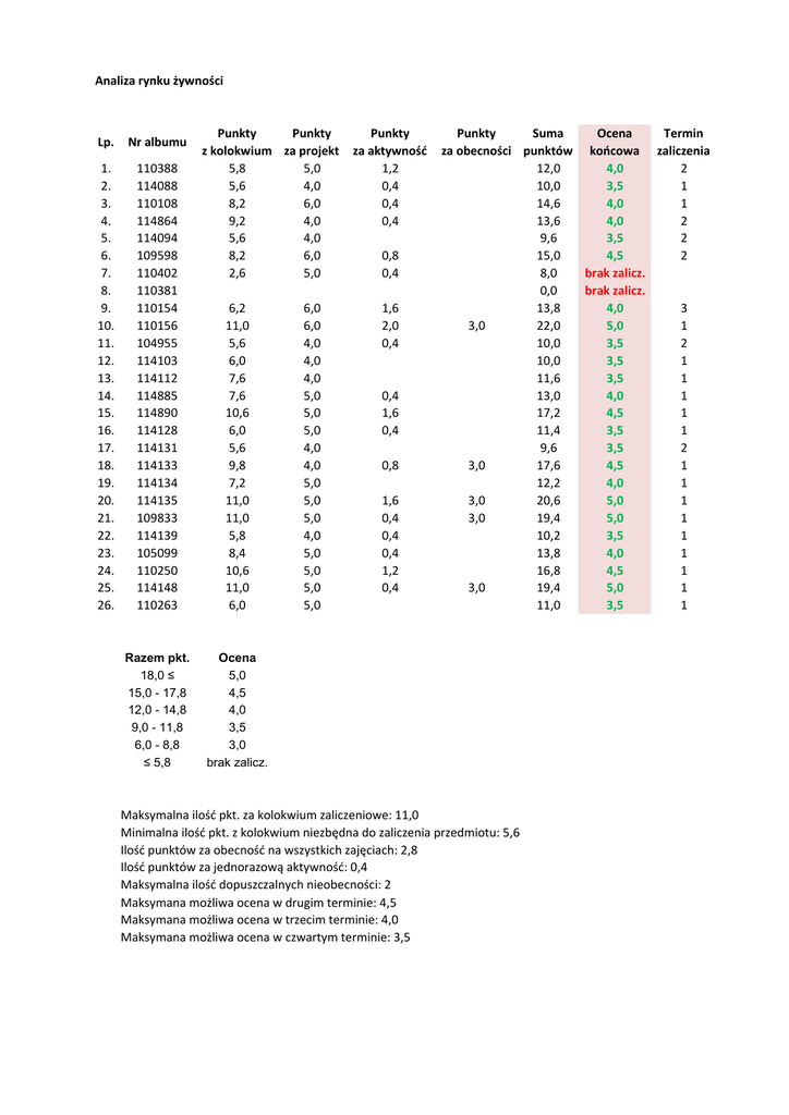 Analiza rynku żywności Lp. Nr albumu 1. 2. 3. 4. 5. 6. 7. 8. 9. 10. 11. 12. 13. 14. 15. 16. 17. 18. 19. 20. 21. 22. 23. 24. 25. 26. 110388 114088 110108 114864 114094 109598 110402 110381 110154 110156 104955 114103 114112 114885 114890 114128 114131 114133 114134 114135 109833 114139 105099 110250 114148 110263 Razem pkt. 18,0 ≤ 15,0 - 17,8 12,0 - 14,8 9,0 - 11,8 6,0 - 8,8 ≤ 5,8 Punkty Punkty z kolokwium za projekt 5,8 5,0 5,6 4,0 8,2 6,0 9,2 4,0 5,6 4,0 8,2 6,0 2,6 5,0 6,2 11,0 5,6 6,0 7,6 7,6 10,6 6,0 5,6 9,8 7,2 11,0 11,0 5,8 8,4 10,6 11,0 6,0 6,0 6,0 4,0 4,0 4,0 5,0 5,0 5,0 4,0 4,0 5,0 5,0 5,0 4,0 5,0 5,0 5,0 5,0 Punkty za aktywnośd 1,2 0,4 0,4 0,4 0,8 0,4 1,6 2,0 0,4 0,4 1,6 0,4 0,8 1,6 0,4 0,4 0,4 1,2 0,4 Punkty Suma Ocena Termin za obecności punktów końcowa zaliczenia 12,0 4,0 2 10,0 3,5 1 14,6 4,0 1 13,6 4,0 2 9,6 3,5 2 15,0 4,5 2 8,0 brak zalicz. 0,0 brak zalicz. 13,8 4,0 3 3,0 22,0 5,0 1 10,0 3,5 2 10,0 3,5 1 11,6 3,5 1 13,0 4,0 1 17,2 4,5 1 11,4 3,5 1 9,6 3,5 2 3,0 17,6 4,5 1 12,2 4,0 1 3,0 20,6 5,0 1 3,0 19,4 5,0 1 10,2 3,5 1 13,8 4,0 1 16,8 4,5 1 3,0 19,4 5,0 1 11,0 3,5 1 Ocena 5,0 4,5 4,0 3,5 3,0 brak zalicz. Maksymalna ilośd pkt. za kolokwium zaliczeniowe: 11,0 Minimalna ilośd pkt. z kolokwium niezbędna do zaliczenia przedmiotu: 5,6 Ilośd punktów za obecnośd na wszystkich zajęciach: 2,8 Ilośd punktów za jednorazową aktywnośd: 0,4 Maksymalna ilośd dopuszczalnych nieobecności: 2 Maksymana możliwa ocena w drugim terminie: 4,5 Maksymana możliwa ocena w trzecim terminie: 4,0 Maksymana możliwa ocena w czwartym terminie: 3,5