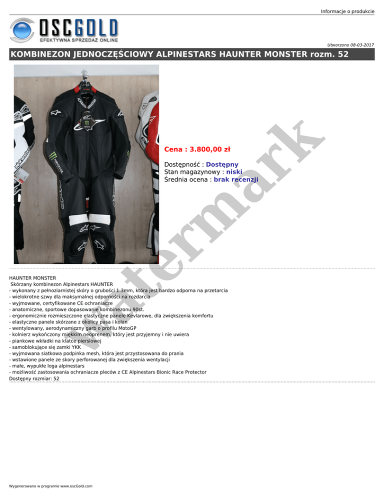 Informacje o produkcie Utworzono 08-03-2017 er m ar k KOMBINEZON JEDNOCZĘŚCIOWY ALPINESTARS HAUNTER MONSTER rozm. 52 Cena : 3.800,00 zł Dostępność : Dostępny Stan magazynowy : niski Średnia ocena : brak recenzji w at HAUNTER MONSTER Skórzany kombinezon Alpinestars HAUNTER - wykonany z pełnoziarnistej skóry o grubości 1.3mm, która jest bardzo odporna na przetarcia - wielokrotne szwy dla maksymalnej odporności na rozdarcia - wyjmowane, certyfikowane CE ochraniacze - anatomiczne, sportowe dopasowanie kombinezonu 90st. - ergonomicznie rozmieszczone elastyczne panele Kevlarowe, dla zwiększenia komfortu - elastyczne panele skórzane z okolicy pasa i kolan - wentylowany, aerodynamiczny garb o profilu MotoGP - kolnierz wykończony miękkim neoprenem, który jest przyjemny i nie uwiera - piankowe wkładki na klatce piersiowej - samoblokujące się zamki YKK - wyjmowana siatkowa podpinka mesh, która jest przystosowana do prania - wstawione panele ze skory perforowanej dla zwiększenia wentylacji - małe, wypukłe loga alpinestars - możliwość zastosowania ochraniacze pleców z CE Alpinestars Bionic Race Protector Dostępny rozmiar: 52 Wygenerowano w programie www.oscGold.com