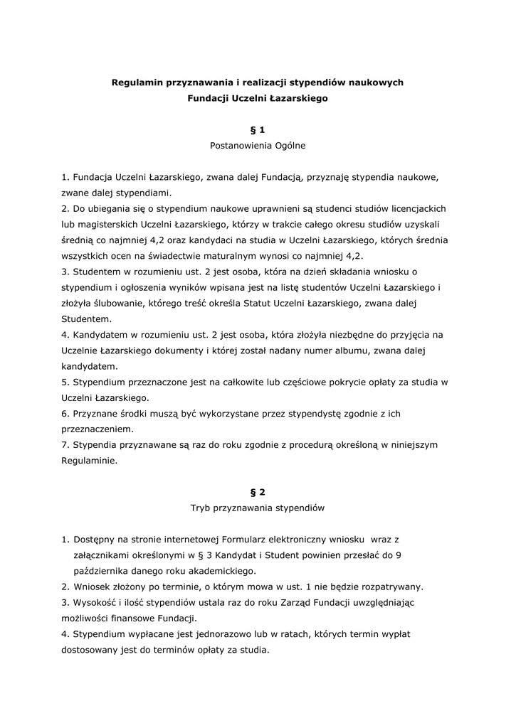 Regulamin przyznawania i realizacji stypendiów naukowych Fundacji Uczelni Łazarskiego §1 Postanowienia Ogólne 1. Fundacja Uczelni Łazarskiego, zwana dalej Fundacją, przyznaję stypendia naukowe, zwane dalej stypendiami. 2. Do ubiegania się o stypendium naukowe uprawnieni są studenci studiów licencjackich lub magisterskich Uczelni Łazarskiego, którzy w trakcie całego okresu studiów uzyskali średnią co najmniej 4,2 oraz kandydaci na studia w Uczelni Łazarskiego, których średnia wszystkich ocen na świadectwie maturalnym wynosi co najmniej 4,2. 3. Studentem w rozumieniu ust. 2 jest osoba, która na dzień składania wniosku o stypendium i ogłoszenia wyników wpisana jest na listę studentów Uczelni Łazarskiego i złożyła ślubowanie, którego treść określa Statut Uczelni Łazarskiego, zwana dalej Studentem. 4. Kandydatem w rozumieniu ust. 2 jest osoba, która złożyła niezbędne do przyjęcia na Uczelnie Łazarskiego dokumenty i której został nadany numer albumu, zwana dalej kandydatem. 5. Stypendium przeznaczone jest na całkowite lub częściowe pokrycie opłaty za studia w Uczelni Łazarskiego. 6. Przyznane środki muszą być wykorzystane przez stypendystę zgodnie z ich przeznaczeniem. 7. Stypendia przyznawane są raz do roku zgodnie z procedurą określoną w niniejszym Regulaminie. §2 Tryb przyznawania stypendiów 1. Dostępny na stronie internetowej Formularz elektroniczny wniosku wraz z załącznikami określonymi w § 3 Kandydat i Student powinien przesłać do 9 października danego roku akademickiego. 2. Wniosek złożony po terminie, o którym mowa w ust. 1 nie będzie rozpatrywany. 3. Wysokość i ilość stypendiów ustala raz do roku Zarząd Fundacji uwzględniając możliwości finansowe Fundacji. 4. Stypendium wypłacane jest jednorazowo lub w ratach, których termin wypłat dostosowany jest do terminów opłaty za studia. 5. Wyplata stypendium nastąpi w terminie 14 dni od dnia podpisania umowy o stypendium pomiędzy Fundacją a stypendystą. Kwoty stypendium będą wypłacone po potraceniu przez Fundację zaliczek na podatek dochodowy, zgodnie z przepisami Ustawa z dnia 26 lipca 1991r o podatku dochodowym od osób fizycznych oraz innych należności publiczno-prawnych. 6. Umowa o której mowa w paragrafie poprzedzającym określała będzie również terminy wypłat i wysokość poszczególnych rat. 7. Podstawą wypłaty każdej raty stypendium jest posiadanie przez stypendystę statusu studenta. 8. Jeżeli stypendysta utraci status studenta Uczelni Łazarskiego wygasa jego prawo do niewypłaconej części stypendium. §3 Zasady rozpatrywania wniosków 1. Warunkiem ubiegania się o stypendium jest przesłanie do Fundacji następujących dokumentów: a) Formularza elektronicznego wniosku Kandydata lub Studenta wraz z jego uzasadnieniem w którym powinny się znaleźć m.in. motywacja osoby ubiegającej się o przyznanie stypendium, dotychczasowe osiągnięcia naukowe i organizacyjne, których potwierdzeniem jest złożenie stosownych zaświadczeń, referencji, materiałów (wycinki z prasy, internetu, filmy etc), dyplomy, certyfikaty, wyrażenie zgody na przetwarzanie przez Fundację danych osobowych Kandydata lub Studenta. b) absolwent studiów licencjackich składa dyplom ukończenia studiów wraz z suplementem, a Kandydat kopie świadectwa maturalnego; c) oświadczenia potwierdzającego wysokość średnich dochodów netto przypadających na członka rodziny za trzy miesiące poprzedzające złożenie wniosku według wzoru określonego w Załączniku nr 1.; d) innych dokumentów np. opinie profesorów, opnie nauczycieli, referencje pracodawców. §4 Kapituła Stypendialna 1. Decyzje o przyznaniu stypendium podejmuje Kapituła Stypendialna, zwana dalej Kapitułą. 2. Kapituła nie może liczyć więcej niż 10 osób, w jej skład wchodzi co najmniej 2 członków zarządu Fundacji. 3. Pozostałych członków Kapituły każdorazowo wskazuje Zarząd. 4. Spośród złożonych wniosków Kapituła wybiera kandydatów do stypendium, ilość kandydatów do stypendium nie może przekroczyć 15 osób. 5. Wybrani kandydaci do stypendium prezentują przed Kapitułą swoje ważne osiągnięcia zawodowe, zainteresowania naukowe, odpowiadają na pytania członków Kapituły. 6. Kapituła po przesłuchaniu kandydatów do stypendium podejmuje decyzje o przyznaniu lub odmowie przyznania stypendium zwykłą większością głosów, przy obecności co najmniej 3 członków. 7. W sytuacjach spornych decyduje głos Prezesa lub Wiceprezesa Fundacji. 8. Decyzje Kapituły są ostateczne i nie służy od nich odwołanie. 9. Uroczyste ogłoszenie nazwisk osób, którym przyznano stypendia następuje do 30 dni od dnia zamknięcia przyjmowania wniosków przez Fundację. Ogłoszenie następuje poprzez publikacje imion i nazwisk Stypendystów na stronie internetowej Fundacji i Uczelni. §5 Obowiązki stypendysty 1. Stypendysta odpowiada za swój rozwój intelektualny. 2. Stypendysta w sposób godny reprezentuje Fundację w swoim środowisku lokalnym oraz we wszelkich wpisach i publikacjach. 3. Stypendysta podejmuje pracę jako wolontariusz na rzecz środowiska Uczelni Łazarskiego. 4. Po wypłacie całej sumy stypendium Stypendysta ma obowiązek złożenia, w ciągu 30 dni od otrzymania ostatniej raty, pisemnego sprawozdania o uzyskanych w trakcie wypłacania stypendium wynikach w nauce oraz innych osiągnięciach. §6 Cofnięcie stypendium 1. Zarząd Fundacji ma prawo podjąć decyzję o cofnięciu stypendium, gdy Stypendysta: a) przestał spełniać kryteria wymagane do otrzymywania stypendium lub prezentuje postawę niegodną stypendysty Fundacji; b) wykorzystuje stypendium niezgodnie z jego przeznaczeniem. §7 Postanowienia końcowe 1. Złożenie wniosku o stypendium przez Studenta jest jednoznaczne z wyrażeniem zgody na wykorzystywanie i przetwarzanie danych osobowych na potrzeby Fundacji zgodnie ustawą z 29.08.1997 o Ochronie Danych Osobowych (tekst jednolity: D