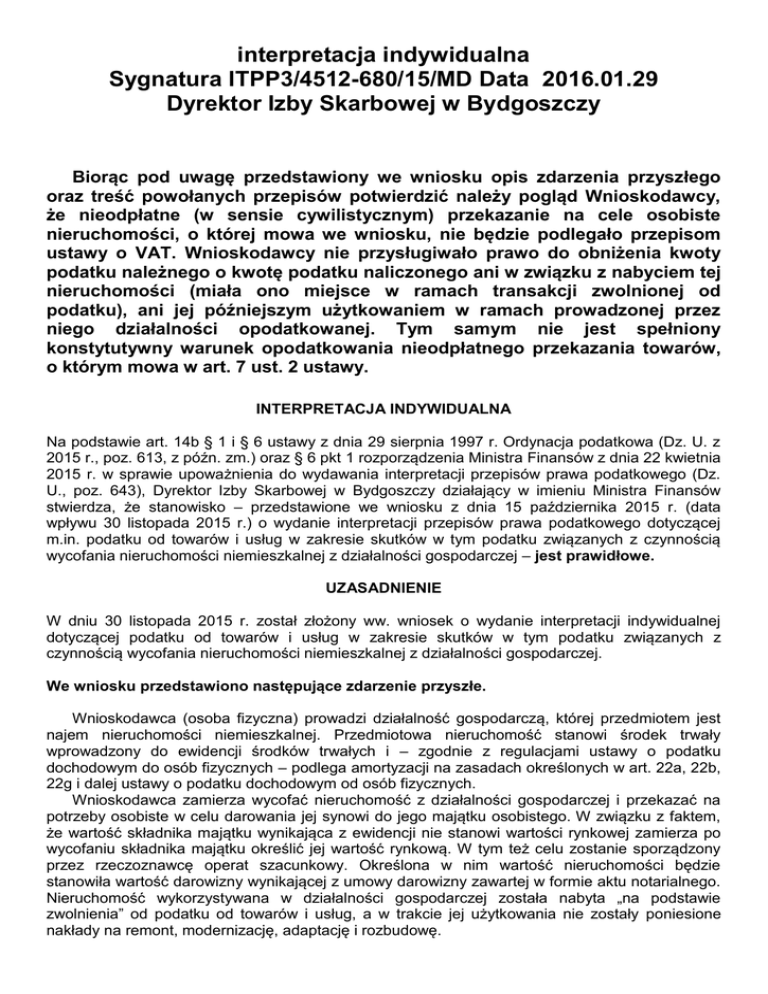 interpretacja indywidualna Sygnatura ITPP3/4512-680/15/MD Data 2016.01.29 Dyrektor Izby Skarbowej w Bydgoszczy Biorąc pod uwagę przedstawiony we wniosku opis zdarzenia przyszłego oraz treść powołanych przepisów potwierdzić należy pogląd Wnioskodawcy, że nieodpłatne (w sensie cywilistycznym) przekazanie na cele osobiste nieruchomości, o której mowa we wniosku, nie będzie podlegało przepisom ustawy o VAT. Wnioskodawcy nie przysługiwało prawo do obniżenia kwoty podatku należnego o kwotę podatku naliczonego ani w związku z nabyciem tej nieruchomości (miała ono miejsce w ramach transakcji zwolnionej od podatku), ani jej późniejszym użytkowaniem w ramach prowadzonej przez niego działalności opodatkowanej. Tym samym nie jest spełniony konstytutywny warunek opodatkowania nieodpłatnego przekazania towarów, o którym mowa w art. 7 ust. 2 ustawy. INTERPRETACJA INDYWIDUALNA Na podstawie art. 14b § 1 i § 6 ustawy z dnia 29 sierpnia 1997 r. Ordynacja podatkowa (Dz. U. z 2015 r., poz. 613, z późn. zm.) oraz § 6 pkt 1 rozporządzenia Ministra Finansów z dnia 22 kwietnia 2015 r. w sprawie upoważnienia do wydawania interpretacji przepisów prawa podatkowego (Dz. U., poz. 643), Dyrektor Izby Skarbowej w Bydgoszczy działający w imieniu Ministra Finansów stwierdza, że stanowisko – przedstawione we wniosku z dnia 15 października 2015 r. (data wpływu 30 listopada 2015 r.) o wydanie interpretacji przepisów prawa podatkowego dotyczącej m.in. podatku od towarów i usług w zakresie skutków w tym podatku związanych z czynnością wycofania nieruchomości niemieszkalnej z działalności gospodarczej – jest prawidłowe. UZASADNIENIE W dniu 30 listopada 2015 r. został złożony ww. wniosek o wydanie interpretacji indywidualnej dotyczącej podatku od towarów i usług w zakresie skutków w tym podatku związanych z czynnością wycofania nieruchomości niemieszkalnej z działalności gospodarczej. We wniosku przedstawiono następujące zdarzenie przyszłe. Wnioskodawca (osoba fizyczna) prowadzi działalność gospodarczą, której przedmiotem jest najem nieruchomości niemieszkalnej. Przedmiotowa nieruchomość stanowi środek trwały wprowadzony do ewidencji środków trwałych i – zgodnie z regulacjami ustawy o podatku dochodowym do osób fizycznych – podlega amortyzacji na zasadach określonych w art. 22a, 22b, 22g i dalej ustawy o podatku dochodowym od osób fizycznych. Wnioskodawca zamierza wycofać nieruchomość z działalności gospodarczej i przekazać na potrzeby osobiste w celu darowania jej synowi do jego majątku osobistego. W związku z faktem, że wartość składnika majątku wynikająca z ewidencji nie stanowi wartości rynkowej zamierza po wycofaniu składnika majątku określić jej wartość rynkową. W tym też celu zostanie sporządzony przez rzeczoznawcę operat szacunkowy. Określona w nim wartość nieruchomości będzie stanowiła wartość darowizny wynikającej z umowy darowizny zawartej w formie aktu notarialnego. Nieruchomość wykorzystywana w działalności gospodarczej została nabyta „na podstawie zwolnienia” od podatku od towarów i usług, a w trakcie jej użytkowania nie zostały poniesione nakłady na remont, modernizację, adaptację i rozbudowę. W związku z powyższym opisem zadano m.in. następujące pytanie. Czy w przypadku wycofania środka trwałego z działalności gospodarczej powstanie obowiązek podatkowy w podatku od towarów i usług... Zdaniem Wnioskodawcy, wycofanie nieruchomości na cele osobiste nie rodzi skutków podatkowych w VAT, gdyż nie jest czynnością, o której mowa w art. 5 ust. 1 pkt 1 ustawy o VAT, a w szczególności nie jest to dostawa określona w art. 7 ust. 1 i ust. 2 tej ustawy. W świetle obowiązującego stanu prawnego stanowisko Wnioskodawcy w sprawie oceny prawnej przedstawionego zdarzenia przyszłego jest prawidłowe. Zgodnie z art. 5 ust. 1 pkt 1 ustawy z dnia 11 marca 2004 r. o podatku od towarów i usług (Dz. U. z 2011 r. Nr 177, poz. 1054, z późn. zm.) – zwanej dalej „ustawą” – opodatkowaniu podatkiem od towarów i usług podlegają odpłatna dostawa towarów i odpłatne świadczenie usług na terytorium kraju (…). Przez towary, stosownie do art. 2 pkt 6 ustawy, rozumie się rzeczy oraz ich części, a także wszelkie postacie energii. Zgodnie z art. 45 ustawy z dnia 23 kwietnia 1964 r. Kodeks cywilny (Dz. U. z 2014 r, poz. 121, z późn. zm.) – dalej jako „K.c.” – rzeczami w rozumieniu niniejszego kodeksu są tylko przedmioty materialne. Według art. 46 § 1 K.c., nieruchomościami są części powierzchni ziemskiej stanowiące odrębny przedmiot własności (grunty), jak również budynki trwale z gruntem związane lub części takich budynków, jeżeli na mocy przepisów szczególnych stanowią odrębny od gruntu przedmiot własności. W myśl art. 7 ust. 1 ustawy, przez dostawę towarów, o której mowa w art. 5 ust. 1 pkt 1, należy rozumieć przeniesienie prawa do rozporządzania towarami jak właściciel (…). Zgodnie z art. 7 ust. 2 ustawy, przez dostawę towarów, o której mowa w art. 5 ust. 1 pkt 1, rozumie się również przekazanie nieodpłatnie przez podatnika towarów należących do jego przedsiębiorstwa, w szczególności: 1. przekazanie lub zużycie towarów na cele osobiste podatnika lub jego pracowników, w tym byłych pracowników, wspólników, udziałowców, akcjonariuszy, członków spółdzielni i ich domowników, członków organów stanowiących osób prawnych, członków stowarzyszenia, 2. wszelkie inne darowizny – jeżeli podatnikowi przysługiwało, w całości lub w części, prawo do obniżenia kwoty podatku należnego o kwotę podatku naliczonego z tytułu nabycia, importu lub wytworzenia tych towarów lub ich części składowych. Według art. 2 pkt 14a ustawy, przez wytworzenie nieruchomości rozumie się wybudowanie budynku, budowli lub ich części, lub ich ulepszenie w rozumieniu przepisów o podatku dochodowym.