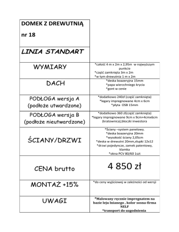 DOMEK Z DREWUTNIĄ nr 18 LINIA STANDART WYMIARY DACH *całość 4 m x 2m x 2,95m w najwyższym punkcie *część zamknięta 3m x 2m *w tym drewutnia 1 m x 2m *deska boazeryjna 15mm *papa wierzchniego krycia *gont w cenie PODŁOGA wersja A (podłoże utwardzone) *dodatkowo 240zł (część zamknięta) *legary impregnowane 4cm x 6cm *płyta OSB 15mm PODŁOGA wersja B (podłoże nieutwardzone) *dodatkowo 360 zł(część zamknięta) *legary impregnowane 9cm x 9cm+4cmx6cm (kratownica),bloczki inwestora ŚCIANY/DRZWI *Ściany –system panelowy. *deska boazeryjna 20mm *wysokość ściany 2,05cm *deska w drewutni 20mm,słupki 12x12 *drzwi pojedyncze, zamek patentowy, klamka *okna PCV 80/60 1szt CENA brutto 4 850 zł MONTAŻ +15% *do ceny wyjściowej w zależności od wersji UWAGI *Malowany ręcznie impregnatem na bazie leju lnianego , kolor sosna-firma NELF *transport do uzgodnienia