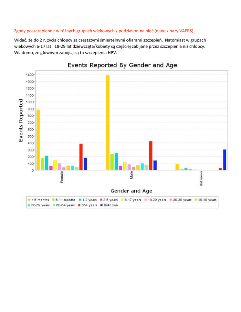 Zgony poszczepienne w różnych grupach wiekowych z podziałem na płeć (dane z bazy VAERS). Widać, że do 2 r. życia chłopcy są częstszymi śmiertelnymi ofiarami szczepień. Natomiast w grupach wiekowych 6‐17 lat i 18‐29 lat dziewczęta/kobiety są częściej zabijane przez szczepienia niż chłopcy. Wiadomo, że głównym zabójcą są tu szczepienia HPV. Powikłania poszczepienne zagrażające życiu, trwałe kalectwo, hospitalizacje poszczepienne w różnych grupach wiekowych z podziałem na płeć. W ciężkich powikłaniach i trwałych okaleczeniach poszczepiennych różnice między płciami są jeszcze bardziej widoczne. Powikłania takie są znacznie częstsze wsród nastoletnich dziewcząt i młodych kobiet, spowodowane głównie szczepieniami HPV. Trudno więc oprzeć się wrażeniu, że szczepienia HPV to broń biologiczna skierowana przeciw dziewczętom i młodym kobietom. Większa liczba powikłań wśród starszych kobiet wynika prawdopodobnie z tego, że one częciej pozwalaja się szczepić niż mężczyźni.