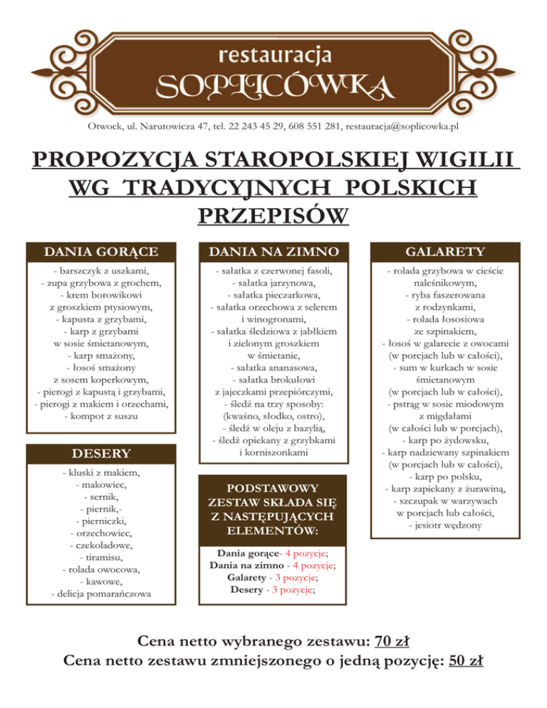 Otwock, ul. Narutowicza 47, tel. 22 243 45 29, 608 551 281, [email protected] PROPOZYCJA STAROPOLSKIEJ WIGILII WG TRADYCYJNYCH POLSKICH PRZEPISÓW DANIA GORĄCE - barszczyk z uszkami, - zupa grzybowa z grochem, - krem borowikowi z groszkiem ptysiowym, - kapusta z grzybami, - karp z grzybami w sosie śmietanowym, - karp smażony, - łosoś smażony z sosem koperkowym, - pierogi z kapustą i grzybami, - pierogi z makiem i orzechami, - kompot z suszu DESERY - kluski z makiem, - makowiec, - sernik, - piernik,- pierniczki, - orzechowiec, - czekoladowe, - tiramisu, - rolada owocowa, - kawowe, - delicja pomarańczowa DANIA NA ZIMNO - sałatka z czerwonej fasoli, - sałatka jarzynowa, - sałatka pieczarkowa, - sałatka orzechowa z selerem i winogronami, - sałatka śledziowa z jabłkiem i zielonym groszkiem w śmietanie, - sałatka ananasowa, - sałatka brokułowi z jajeczkami przepiórczymi, - śledź na trzy sposoby: (kwaśno, słodko, ostro), - śledź w oleju z bazylią, - śledź opiekany z grzybkami i korniszonkami PODSTAWOWY ZESTAW SKŁADA SIĘ Z NASTĘPUJĄCYCH ELEMENTÓW: GALARETY - rolada grzybowa w cieście naleśnikowym, - ryba faszerowana z rodzynkami, - rolada łososiowa ze szpinakiem, - łosoś w galarecie z owocami (w porcjach lub w całości), - sum w kurkach w sosie śmietanowym (w porcjach lub w całości), - pstrąg w sosie miodowym z migdałami (w całości lub w porcjach), - karp po żydowsku, - karp nadziewany szpinakiem (w porcjach lub w całości), - karp po polsku, - karp zapiekany z żurawiną, - szczupak w warzywach w porcjach lub całości, - jesiotr wędzony Dania gorące- 4 pozycje; Dania na zimno - 4 pozycje; Galarety - 3 pozycje; Desery - 3 pozycje; Cena netto wybranego zestawu: 70 zł Cena netto zestawu zmniejszonego o jedną pozycję: 50 zł