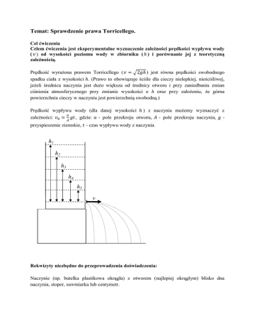 Temat: Sprawdzenie prawa Torricellego. Cel ćwiczenia Celem ćwiczenia jest eksperymentalne wyznaczenie zależności prędkości wypływu wody ( 𝑣 ) od wysokości poziomu wody w zbiorniku ( ℎ ) i porównanie jej z teoretyczną zależnością. Prędkość wyrażona prawem Torricellego ( 𝑣 = √2𝑔ℎ ) jest równa prędkości swobodnego spadku ciała z wysokości ℎ. (Prawo to obowiązuje ściśle dla cieczy nielepkiej, nieściśliwej, jeżeli średnica naczynia jest dużo większa od średnicy otworu i przy zaniedbaniu zmian ciśnienia atmosferycznego przy zmianie wysokości o h oraz przy założeniu, że górna powierzchnia cieczy w naczyniu jest powierzchnią swobodną.) Prędkość wypływu wody (dla danej wysokości ℎ ) z naczynia możemy wyznaczyć z 𝑎 zależności: 𝑣0 = 𝐴 𝑔𝑡 , gdzie: 𝑎 - pole przekroju otworu, 𝐴 - pole przekroju naczynia, 𝑔 przyspieszenie ziemskie, 𝑡 - czas wypływu wody z naczynia. h1 h2 h3 h4 h5 v Rekwizyty niezbędne do przeprowadzenia doświadczenia: Naczynie (np. butelka plastikowa okrągła) z otworem (najlepiej okrągłym) blisko dna naczynia, stoper, suwmiarka lub centymetr. Przykładowy przebieg doświadczenia: 1. Mierzymy co najmniej pięciokrotnie średnicę (lub wymiary pozwalające obliczyć pole przekroju) naczynia 𝐷 i otworu 𝑑. Wyniki zapisujemy w tabeli (poniżej przykładowa tabela). Tabela pomiarowa 1: Nr. pomiaru: 1 𝐷 [jednostka] 𝑑 [jednostka] 2 3 4 5 itd. 2. Zaklejamy otwór taśmą. 3. Napełniamy naczynie wodą do pewnej wysokości ℎ nad otworem 𝑑. 4. Odklejamy taśmę i mierzymy czas 𝑡 wypływu wody z naczynia. Dla danej wysokości ℎ pomiary wykonujemy co najmniej pięciokrotnie. Wyniki zapisujemy w tabeli (poniżej przykładowa tabela). 5. Powtarzamy czynności z punktów 2-4 jeszcze dla co najmniej czterech innych wysokości ℎ. Tabela pomiarowa 2: ℎ [jednostka] 𝑡 [jednostka] ℎ [jednostka] 𝑡 [jednostka] ℎ [jednostka] 𝑡 [jednostka] ℎ [jednostka] ℎ [jednostka] 𝑡 [jednostka] ℎ [jednostka] 𝑡 [jednostka] 𝑡 [jednostka] 6. Zanotować dokładności (niepewności maksymalnych) użytych przyrządów pomiarowych oraz ich jednostki (niepewności maksymalne przyrządów pomiarowych oznaczamy jako ∆𝑥, gdzie 𝑥 oznacza wielkość mierzoną). ∆𝐷 = , ∆𝑑 = , ∆ℎ = , ∆𝑡 = . Opracowanie wyników pomiarów: 1. Obliczyć wartości średnie i ich niepewności całkowite dla średnicy naczynia 𝐷 i otworu 𝑑. 2. Obliczyć wartości i ich niepewności dla przekroju naczynia 𝐴 i otworu 𝑎. 3. Wyniki umieścić w tabeli. na przykład takiej: ̅ 𝑢(𝐷) 𝐷 ̅ 𝑢(𝑑) 𝑑 𝐴 𝑎 𝑢(𝐴) 𝑢(𝑎) 4. Obliczyć wartość średnią i jej niepewność całkowitą dla czasu 𝑡 wypływu wody z naczynia (dla danej wysokości ℎ). 5. Obliczyć wartość i jej niepewność prędkości wypływu wody (dla danej wysokości ℎ) z 𝑎 naczynia z zależności: 𝑣0 = 𝐴 𝑔𝑡. 6. Wyniki umieścić w tabeli. na przykład takiej: ℎ 𝑡̅ 𝑢(𝑡) 𝑣0 ̅̅̅ 𝑢(𝑣0 ) 7. Sporządzić wykres 𝑣 = 𝑓(ℎ). 8. Sporządzić wykres ln 𝑣 = 𝑓(ln ℎ). 9. Metodą regresji liniowej znaleźć współczynniki ich niepewności standardowe oraz współczynnik korelacji prostej dla wykresu ln 𝑣 = 𝑓(ln ℎ). 10. Wyniki umieścić w tabeli. na przykład takiej: 𝑎 𝑢(𝑎) 𝑏 𝑢(𝑏) 𝑟 8. Napisać wnioski dotyczące uzyskanych wyników pomiarowych.