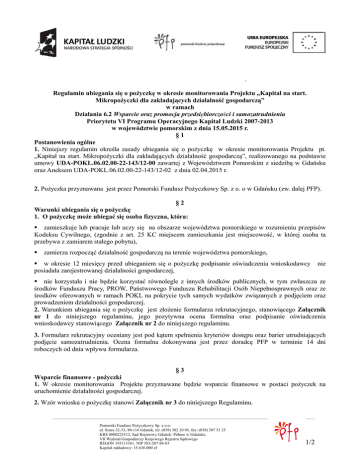 . Regulamin ubiegania się o pożyczkę w okresie monitorowania Projektu „Kapitał na start. Mikropożyczki dla zakładających działalność gospodarczą” w ramach Działania 6.2 Wsparcie oraz promocja przedsiębiorczości i samozatrudnienia Priorytetu VI Programu Operacyjnego Kapitał Ludzki 2007-2013 w województwie pomorskim z dnia 15.05.2015 r. §1 Postanowienia ogólne 1. Niniejszy regulamin określa zasady ubiegania się o pożyczkę w okresie monitorowania Projektu pt. „Kapitał na start. Mikropożyczki dla zakładających działalność gospodarczą”, realizowanego na podstawie umowy UDA-POKL.06.02.00-22-143/12-00 zawartej z Województwem Pomorskim z siedzibą w Gdańsku oraz Aneksem UDA-POKL.06.02.00-22-143/12-02 z dnia 02.04.2015 r. 2. Pożyczka przyznawana jest przez Pomorski Fundusz Pożyczkowy Sp. z o. o w Gdańsku (zw. dalej PFP). §2 Warunki ubiegania się o pożyczkę 1. O pożyczkę może ubiegać się osoba fizyczna, która: zamieszkuje lub pracuje lub uczy się na obszarze województwa pomorskiego w rozumieniu przepisów Kodeksu Cywilnego, (zgodnie z art. 25 KC miejscem zamieszkania jest miejscowość, w której osoba ta przebywa z zamiarem stałego pobytu), zamierza rozpocząć działalność gospodarczą na terenie województwa pomorskiego, w okresie 12 miesięcy przed ubieganiem się o pożyczkę podpisanie oświadczenia wnioskodawcy posiadała zarejestrowanej działalności gospodarczej, nie nie korzystała i nie będzie korzystać równolegle z innych środków publicznych, w tym zwłaszcza ze środków Funduszu Pracy, PROW, Państwowego Funduszu Rehabilitacji Osób Niepełnosprawnych oraz ze środków oferowanych w ramach POKL na pokrycie tych samych wydatków związanych z podjęciem oraz prowadzeniem działalności gospodarczej. 2. Warunkiem ubiegania się o pożyczkę jest złożenie formularza rekrutacyjnego, stanowiącego Załącznik nr 1 do niniejszego regulaminu, jego pozytywna ocena formalna oraz podpisanie oświadczenia wnioskodawcy stanowiącego Załącznik nr 2 do niniejszego regulaminu. 3. Formularz rekrutacyjny oceniany jest pod kątem spełnienia kryteriów dostępu oraz barier utrudniających podjęcie samozatrudnienia. Ocena formalna dokonywana jest przez doradcę PFP w terminie 14 dni roboczych od dnia wpływu formularza. §3 Wsparcie finansowe - pożyczki 1. W okresie monitorowania Projektu przyznawane będzie wsparcie finansowe w postaci pożyczek na uruchomienie działalności gospodarczej. 2. Wzór wniosku o pożyczkę stanowi Załącznik nr 3 do niniejszego Regulaminu. ____________________________________________________________________________________________________________________________ Pomorski Fundusz Pożyczkowy Sp. z o.o. ul. Szara 32-33, 80-116 Gdańsk, tel. (058) 302 20 05, fax: (058) 307 51 25 KRS 0000225512, Sąd Rejonowy Gdańsk- Północ w Gdańsku VII Wydział Gospodarczy Krajowego Rejestru Sądowego REGON 193113361, NIP 583-287-84-83 Kapitał zakładowy: 15.636.000 zł 1/2 3. Osoba ubiegająca się o pożyczkę musi zarejestrować działalność gospodarczą, po pozytywnej ocenie formularza rekrutacyjnego i złożeniu oświadczenia wnioskodawcy ,a przed podpisaniem umowy pożyczki. 4. Zasady udzielania pożyczek zostały szczegółowo opisane w Regulaminie udzielania pożyczek w okresie monitorowania Projektu „Kapitał na start. Mikropożyczki dla zakładających działalność gospodarczą”, stanowiącym Załącznik nr 4 do niniejszego Regulaminu. §4 Postanowienia końcowe Sprawy nieuregulowane niniejszym regulaminem rozstrzygane są przez Kierownika Projektu. §5 Niniejszy regulamin wchodzi w życie z dniem 15.05.2015 r. Wnioski o pożyczkę, które zostały przyjęte przed tą datą nie podlegają ponownej ocenie. ____________________________________________________________________________________________________________________________ Pomorski Fundusz Pożyczkowy Sp. z o.o. ul. Szara 32-33, 80-116 Gdańsk, tel. (058) 302 20 05, fax: (058) 307 51 25 KRS 0000225512, Sąd Rejonowy Gdańsk- Północ w Gdańsku VII Wydział Gospodarczy Krajowego Rejestru Sądowego REGON 193113361, NIP 583-287-84-83 Kapitał zakładowy: 15.636.000 zł 2/2