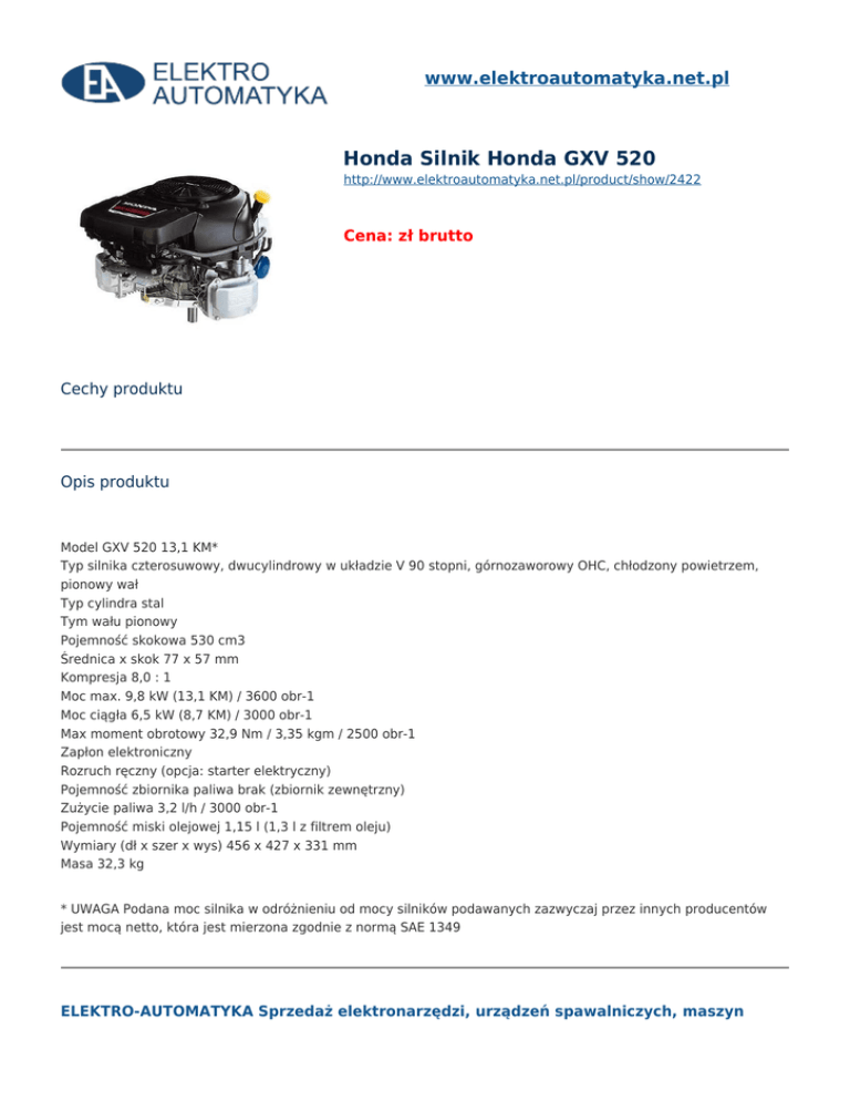 www.elektroautomatyka.net.pl Honda Silnik Honda GXV 520 http://www.elektroautomatyka.net.pl/product/show/2422 Cena: zł brutto Cechy produktu Opis produktu Model GXV 520 13,1 KM* Typ silnika czterosuwowy, dwucylindrowy w układzie V 90 stopni, górnozaworowy OHC, chłodzony powietrzem, pionowy wał Typ cylindra stal Tym wału pionowy Pojemność skokowa 530 cm3 Średnica x skok 77 x 57 mm Kompresja 8,0 : 1 Moc max. 9,8 kW (13,1 KM) / 3600 obr-1 Moc ciągła 6,5 kW (8,7 KM) / 3000 obr-1 Max moment obrotowy 32,9 Nm / 3,35 kgm / 2500 obr-1 Zapłon elektroniczny Rozruch ręczny (opcja: starter elektryczny) Pojemność zbiornika paliwa brak (zbiornik zewnętrzny) Zużycie paliwa 3,2 l/h / 3000 obr-1 Pojemność miski olejowej 1,15 l (1,3 l z filtrem oleju) Wymiary (dł x szer x wys) 456 x 427 x 331 mm Masa 32,3 kg * UWAGA Podana moc silnika w odróżnieniu od mocy silników podawanych zazwyczaj przez innych producentów jest mocą netto, która jest mierzona zgodnie z normą SAE 1349 ELEKTRO-AUTOMATYKA Sprzedaż elektronarzędzi, urządzeń spawalniczych, maszyn budowlanych, pneumatyki, narzędzi warsztatowych, firmowych ubrań roboczych oraz maszyn ogrodowo leśnych. Sklep Bochnia ul. Brzeska 50 32-700 Bochnia Sklep Brzesko ul. Szarych Szeregów 23 32-800 Brzesko Serwis, Magazyn ul. Św. Brata Alberta 4 32-800 Brzesko tel. 691 572 333 e-mail: [email protected] tel. 609 523 230 e-mail: [email protected] tel. 609 523 645 e-mail: [email protected]