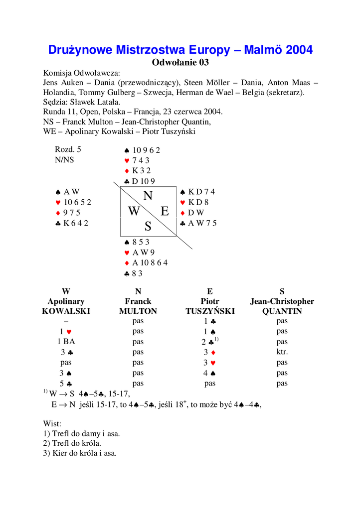 Dru ynowe Mistrzostwa Europy – Malmö 2004 Odwołanie 03 Komisja Odwoławcza: Jens Auken – Dania (przewodnicz cy), Steen Möller – Dania, Anton Maas – Holandia, Tommy Gulberg – Szwecja, Herman de Wael – Belgia (sekretarz). S dzia: Sławek Latała. Runda 11, Open, Polska – Francja, 23 czerwca 2004. NS – Franck Multon – Jean-Christopher Quantin, WE – Apolinary Kowalski – Piotr Tuszy ski Rozd. 5 N/NS ♠ AW ♥ 10 6 5 2 ♦975 ♣K642 ♠ 10 9 6 2 ♥743 ♦K32 ♣ D 10 9 W N S E ♠ KD74 ♥ KD8 ♦DW ♣AW75 ♠853 ♥ AW9 ♦ A 10 8 6 4 ♣83 W N E S Apolinary Franck Piotr Jean-Christopher KOWALSKI MULTON TUSZY SKI QUANTIN – pas pas 1♣ pas pas 1♥ 1♠ 1) 1 BA pas pas 2♣ pas ktr. 3♣ 3♦ pas pas pas 3♥ pas pas 3♠ 4♠ pas pas pas 5♣ 1) W → S 4♠–5♣, 15-17, E → N je li 15-17, to 4♠–5♣, je li 18+, to mo e by 4♠–4♣, Wist: 1) Trefl do damy i asa. 2) Trefl do króla. 3) Kier do króla i asa. 2 4) Walet kier 11 lew. 400 dla WE. Fakty: Po zako czeniu gry S zawołał s dziego stwierdzaj c, e nie dostał prawidłowej informacji o r ce E. Jego zdaniem jedynym mo liwym układem po tej licytacji i tłumaczeniu był skład 4-1-3-5. N doło ył ilo ciówk w kierach, wi c mógł mie trzy lub pi kierów. Decyzja s dziego: Stwierdziłem bł dn informacj . Niemniej po konsultacjach z Komisj S dziowsk i po zrobieniu panelu, nie dopatrzyłem si zwi zku pomi dzy wykroczeniem a strat . Guido Ferraro, PO Sundelin i inni tylko wzruszali ramionami, gdy pytałem, co s dz o odwrocie w waleta kier. NS zło yli odwołanie. Komisja Odwoławcza: Obecni wszyscy gracze i obaj kapitanowie: Wojtek Siwiec i Alain Levy z Francji. Po przedstawieniu faktów i decyzji przez s dziego przepytano graczy. S tłumaczył, e odwrót kierowy w wietle licytacji nie był nierozs dny. E bronił swojego tłumaczenia, stwierdzaj c, e w ich systemie z jego kart licytuje si 3 BA, a on chciał pomóc przeciwnikom opisuj c co ma w karcie. Decyzja Komisji Odwoławczej: Zmieniono decyzj s dziego, wywa aj c rezultat: 1/3 kontrakt wygrany (wist w kiera), 2/3 kontrakt przegrany (wist w pika lub w karo). Z +11 imp dla Polski zrobiło si +5 imp. Mój komentarz: Nie mam prawa podwa a decyzji Komisji Odwoławczej, ale mam prawo do swojej prywatnej opinii. Otó według mnie KO nie uwzgl dniła wszystkich aspektów problemu. Załó my, e Quantin prawidłowo rozliczył skład Piotrka: 4-1-3-5. Poszukajmy wi c punktów: 5 w pikach, 3 w kierach, 5 w treflach, a co z karami? Minimum jakie tam si mie ci, to trzecia dama, ale wówczas zje d aj dwa kara, a w dodatku, kto z tak kart parłby do 5♣. Je li Piotrek b dzie miał króla karo, to po 3♣ golnie trzy do rogu. Nieprawda ? Niemniej wielekro mówili my, e nale y ujawnia tylko wzajemne uzgodnienia. Dodatkowe wyja nienia, wynikaj ce z własnej karty, mog by tzw. nadinterpretacj systemu, co jest wr cz prawnie zakazane. Licytuj co chcesz, ale mów co mówi system w danej sekwencji. B dziemy to powtarza do upadłego. Polska straciła 1VP, wygrywaj c „tylko” 23:7.