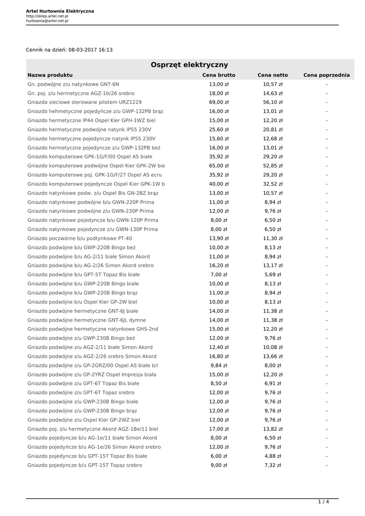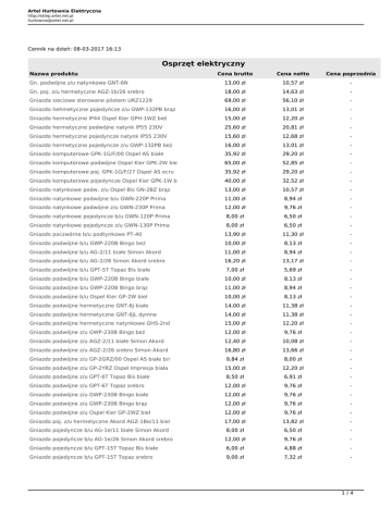 Artel Hurtownia Elektryczna http://sklep.artel.net.pl [email protected] Cennik na dzień: 08-03-2017 16:13 Osprzęt elektryczny Nazwa produktu Cena brutto Cena netto Cena poprzednia Gn. podwójne z/u natynkowe GNT-6N 13,00 zł 10,57 zł - Gn. poj. z/u hermetyczne AGZ-1b/26 srebro 18,00 zł 14,63 zł - Gniazda sieciowe sterowane pilotem URZ1229 69,00 zł 56,10 zł - Gniazdo hehmetyczne pojedyńcze z/u GWP-132PB brąz 16,00 zł 13,01 zł - Gniazdo hermetyczne IP44 Ospel Kier GPH-1WZ biel 15,00 zł 12,20 zł - Gniazdo hermetyczne podwójne natynk IP55 230V 25,60 zł 20,81 zł - Gniazdo hermetyczne pojedyncze natynk IP55 230V 15,60 zł 12,68 zł - Gniazdo hermetyczne pojedyncze z/u GWP-132PB beż 16,00 zł 13,01 zł - Gniazdo komputerowe GPK-1G/F/00 Ospel AS białe 35,92 zł 29,20 zł - Gniazdo komputerowe podwójne Ospel Kier GPK-2W bie 65,00 zł 52,85 zł - Gniazdo komputerowe poj. GPK-1G/F/27 Ospel AS ecru 35,92 zł 29,20 zł - Gniazdo komputerowe pojedyncze Ospel Kier GPK-1W b 40,00 zł 32,52 zł - Gniazdo natynkowe podw. z/u Ospel Bis GN-2BZ brąz 13,00 zł 10,57 zł - Gniazdo natynkowe podwójne b/u GWN-220P Prima 11,00 zł 8,94 zł - Gniazdo natynkowe podwójne z/u GWN-230P Prima 12,00 zł 9,76 zł - 8,00 zł 6,50 zł - Gniazdo natynkowe pojedyncze b/u GWN-120P Prima Gniazdo natynkowe pojedyncze z/u GWN-130P Prima 8,00 zł 6,50 zł - Gniazdo poczwórne b/u podtynkowe PT-40 13,90 zł 11,30 zł - Gniazdo podwójne b/u GWP-220B Bingo beż 10,00 zł 8,13 zł - Gniazdo podwójne b/u AG-2/11 białe Simon Akord 11,00 zł 8,94 zł - Gniazdo podwójne b/u AG-2/26 Simon Akord srebro 16,20 zł 13,17 zł - Gniazdo podwójne b/u GPT-5T Topaz Bis białe 7,00 zł 5,69 zł - Gniazdo podwójne b/u GWP-220B Bingo białe 10,00 zł 8,13 zł - Gniazdo podwójne b/u GWP-220B Bingo brąz 11,00 zł 8,94 zł - Gniazdo podwójne b/u Ospel Kier GP-2W biel 10,00 zł 8,13 zł - Gniazdo podwójne hermetyczne GNT-6J białe 14,00 zł 11,38 zł - Gniazdo podwójne hermetyczne GNT-6JL dymne 14,00 zł 11,38 zł - Gniazdo podwójne hermetyczne natynkowe GHS-2nd 15,00 zł 12,20 zł - Gniazdo podwójne z/u GWP-230B Bingo beż 12,00 zł 9,76 zł - Gniazdo podwójne z/u AGZ-2/11 białe Simon Akord 12,40 zł 10,08 zł - Gniazdo podwójne z/u AGZ-2/26 srebro Simon Akord 16,80 zł 13,66 zł - Gniazdo podwójne z/u GP-2GRZ/00 Ospel AS białe b/r 9,84 zł 8,00 zł - Gniazdo podwójne z/u GP-2YRZ Ospel Impresja biała 15,00 zł 12,20 zł - Gniazdo podwójne z/u GPT-6T Topaz Bis białe 8,50 zł 6,91 zł - Gniazdo podwójne z/u GPT-6T Topaz srebro 12,00 zł 9,76 zł - Gniazdo podwójne z/u GWP-230B Bingo białe 12,00 zł 9,76 zł - Gniazdo podwójne z/u GWP-230B Bingo brąz 12,00 zł 9,76 zł - Gniazdo podwójne z/u Ospel Kier GP-2WZ biel 12,00 zł 9,76 zł - Gniazdo poj. z/u hermetyczne Akord AGZ-1Be/11 biel 17,00 zł 13,82 zł - Gniazdo pojedyncze b/u AG-1e/11 białe Simon Akord 8,00 zł 6,50 zł - Gniazdo pojedyńcze b/u AG-1e/26 Simon Akord srebro 12,00 zł 9,76 zł - Gniazdo pojedyncze b/u GPT-15T Topaz Bis białe 6,00 zł 4,88 zł - Gniazdo pojedyncze b/u GPT-15T Topaz srebro 9,00 zł 7,32 zł - 1/4 Artel Hurtownia Elektryczna http://sklep.artel.net.pl [email protected] Gniazdo pojedyncze b/u GWP-120B Bingo beż 8,00 zł 6,50 zł - Gniazdo pojedyncze b/u GWP-120B Bingo białe 8,00 zł 6,50 zł - Gniazdo pojedyncze b/u GWP-120B Bingo brąz 8,00 zł 6,50 zł - Gniazdo pojedyncze b/u Ospe Kier GP-1W biel 9,00 zł 7,32 zł - 14,90 zł 12,11 zł - Gniazdo pojedyncze hermetyczne GNT-16J białe 9,00 zł 7,32 zł - Gniazdo pojedyncze hermetyczne GNT-16JL dymne 9,00 zł 7,32 zł - Gniazdo pojedyncze hermetyczne natynk GHS-1d białe 12,60 zł 10,24 zł - Gniazdo pojedyncze hermetyczne natynkowe GHS-1d 12,60 zł 10,24 zł - Gniazdo pojedyncze z/u AGZ-1e/11 białe Simon Akord 8,50 zł 6,91 zł - Gniazdo pojedyńcze z/u AGZ-1e/26 Simon Akord srebr 13,90 zł 11,30 zł - 7,30 zł 5,93 zł - 12,00 zł 9,76 zł - 6,80 zł 5,53 zł - Gniazdo pojedyńcze z/u GPT-16T Topaz srebro 10,00 zł 8,13 zł - Gniazdo pojedyncze z/u GWP-130B Bingo beż 9,00 zł 7,32 zł - Gniazdo pojedyncze z/u GWP-130B Bingo białe 8,00 zł 6,50 zł - Gniazdo pojedyncze z/u GWP-130B Bingo brąz 9,00 zł 7,32 zł - Gniazdo pojedyńcze bryzgoszczelne GPH-1GZ Ospel AS Gniazdo pojedyncze z/u GP-1GZ/00 Ospel AS białe Gniazdo pojedyncze z/u GP-1YZ/M/00 Impresja biała Gniazdo pojedyńcze z/u GPT-16T Topaz Bis białe Gniazdo pojedyncze z/u Ospel Kier GP-1WZ biel 9,50 zł 7,72 zł - Gniazdo potrójne hermetyczne BETA1 IP44 3114 białe 24,00 zł 19,51 zł - Gniazdo RTV SAT końcowe GPA-GP Ospel AS 46,00 zł 37,40 zł - Gniazdo RTV SAT przelotowe GPA-GSP Ospel AS 55,00 zł 44,72 zł - Gniazdo RTV-SAT GPA-FS białe Ospel Efekt 57,00 zł 46,34 zł - Gniazdo RTV-SAT końcowe GPA-GS/00 Ospel As białe 51,23 zł 41,65 zł - Gniazdo RTV-SAT końcowe GPA-GS/27 Ospel As ecru 51,23 zł 41,65 zł - Gniazdo RTV-SAT końcowe natynkowe GNI0507 19,00 zł 15,45 zł - Gniazdo RTV-SAT końcowe Ospel Kier GPA-WS biel 52,00 zł 42,28 zł - Gniazdo telefon. podwójne Ospel Kier GPT-2W biel 26,00 zł 21,14 zł - Gniazdo TRV-SAT przelotowe Ospel Kier GPA-WSP biel 78,00 zł 63,41 zł - Gnizado hermetyczne pojedyncze z/u GWP-132PB białe 16,00 zł 13,01 zł - 1,80 zł 1,46 zł - Przycisk dzwonek natynkowy IP44 Junior WHE-4 brąz 12,90 zł 10,49 zł - Przycisk dzwonkowy hermetyczny 1A PDJ-213 IP44 10,00 zł 8,13 zł - Ramka pięciokrotna R-5G/27 Ospel AS ecru 12,42 zł 10,10 zł - Ramka pięciokrotna R5G/00 Ospel AS biała 13,79 zł 11,21 zł - Ramka poczw. R-4Y/00 Impresja biała 9,00 zł 7,32 zł - Ramka poczwórna R-4G/00 Ospel AS biała 8,40 zł 6,83 zł - Ramka podwójna R-2G/00 Ospel AS biała 4,60 zł 3,74 zł - Ramka podwójna R-2G/27 Ospel AS ecru 4,18 zł 3,40 zł - Ramka podwójna R-2Y/00 Impresja biała 5,50 zł 4,47 zł - Ramka pojedyńcza R-1G/00 Ospel AS biała 2,00 zł 1,63 zł - Ramka pojedyncza R-1G/27 Ospel AS ecru 2,20 zł 1,79 zł - Ramka pojedyncza R-1Y/00 Impresja biała 3,50 zł 2
