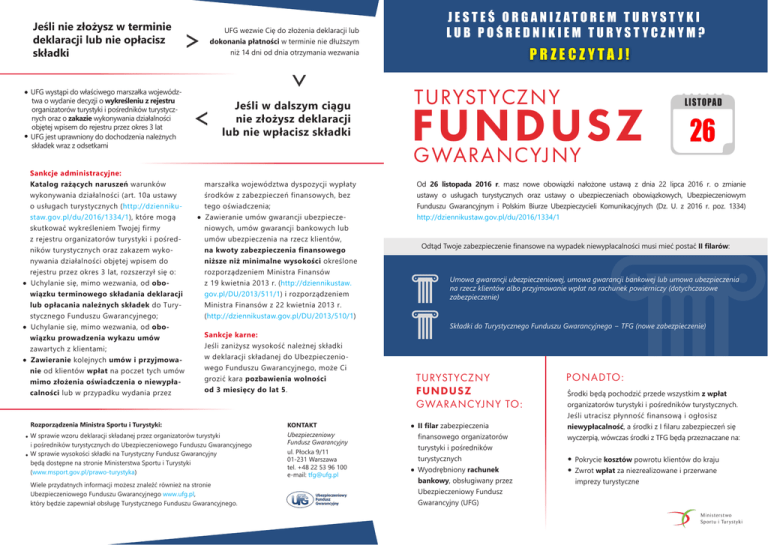 Jeśli nie złożysz w terminie deklaracji lub nie opłacisz składki UFG wezwie Cię do złożenia deklaracji lub dokonania płatności w terminie nie dłuższym niż 14 dni od dnia otrzymania wezwania • UFG wystąpi do właściwego marszałka województwa o wydanie decyzji o wykreśleniu z rejestru organizatorów turystyki i pośredników turystycznych oraz o zakazie wykonywania działalności objętej wpisem do rejestru przez okres 3 lat • UFG jest uprawniony do dochodzenia należnych składek wraz z odsetkami Sankcje administracyjne: Katalog rażących naruszeń warunków wykonywania działalności (art. 10a ustawy o usługach turystycznych (http://dziennikustaw.gov.pl/du/2016/1334/1), które mogą skutkować wykreśleniem Twojej firmy z rejestru organizatorów turystyki i pośredników turystycznych oraz zakazem wykonywania działalności objętej wpisem do rejestru przez okres 3 lat, rozszerzył się o: • Uchylanie się, mimo wezwania, od obowiązku terminowego składania deklaracji lub opłacania należnych składek do Turystycznego Funduszu Gwarancyjnego; • Uchylanie się, mimo wezwania, od obo- wiązku prowadzenia wykazu umów zawartych z klientami; • Zawieranie kolejnych umów i przyjmowanie od klientów wpłat na poczet tych umów mimo złożenia oświadczenia o niewypłacalności lub w przypadku wydania przez Jeśli w dalszym ciągu nie złożysz deklaracji lub nie wpłacisz składki marszałka województwa dyspozycji wypłaty środków z zabezpieczeń finansowych, bez tego oświadczenia; • Zawieranie umów gwarancji ubezpieczeniowych, umów gwarancji bankowych lub umów ubezpieczenia na rzecz klientów, na kwoty zabezpieczenia finansowego niższe niż minimalne wysokości określone rozporządzeniem Ministra Finansów z 19 kwietnia 2013 r. (http://dziennikustaw. gov.pl/DU/2013/511/1) i rozporządzeniem Ministra Finansów z 22 kwietnia 2013 r. (http://dziennikustaw.gov.pl/DU/2013/510/1) Sankcje karne: Jeśli zaniżysz wysokość należnej składki w deklaracji składanej do Ubezpieczeniowego Funduszu Gwarancyjnego, może Ci grozić kara pozbawienia wolności od 3 miesięcy do lat 5. Rozporządzenia Ministra Sportu i Turystyki: • W sprawie wzoru deklaracji składanej przez organizatorów turystyki i pośredników turystycznych do Ubezpieczeniowego Funduszu Gwarancyjnego • W sprawie wysokości składki na Turystyczny Fundusz Gwarancyjny będą dostępne na stronie Ministerstwa Sportu i Turystyki (www.msport.gov.pl/prawo-turystyka) Wiele przydatnych informacji możesz znaleźć również na stronie Ubezpieczeniowego Funduszu Gwarancyjnego www.ufg.pl, który będzie zapewniał obsługę Turystycznego Funduszu Gwarancyjnego. KONTAKT Ubezpieczeniowy Fundusz Gwarancyjny ul. Płocka 9/11 01-231 Warszawa tel. +48 22 53 96 100 e-mail: [email protected] J E S T E Ś O R G A N I Z AT O R E M T U R Y S T Y K I LUB POŚREDNIKIEM TURYSTYCZNYM? PRZECZYTA J! TURYST YCZNY FUNDUSZ GWARANCYJNY LISTOPAD 26 Od 26 listopada 2016 r. masz nowe obowiązki nałożone ustawą z dnia 22 lipca 2016 r. o zmianie ustawy o usługach turystycznych oraz ustawy o ubezpieczeniach obowiązkowych, Ubezpieczeniowym Funduszu Gwarancyjnym i Polskim Biurze Ubezpieczycieli Komunikacyjnych (Dz. U. z 2016 r. poz. 1334) http://dziennikustaw.gov.pl/du/2016/1334/1 Odtąd Twoje zabezpieczenie finansowe na wypadek niewypłacalności musi mieć postać II filarów: Umowa gwarancji ubezpieczeniowej, umowa gwarancji bankowej lub umowa ubezpieczenia na rzecz klientów albo przyjmowanie wpłat na rachunek powierniczy (dotychczasowe zabezpieczenie) Składki do Turystycznego Funduszu Gwarancyjnego − TFG (nowe zabezpieczenie) TURYST YCZNY FUNDUSZ GWARANCYJNY TO: • II filar zabezpieczenia finansowego organizatorów turystyki i pośredników turystycznych • Wyodrębniony rachunek bankowy, obsługiwany przez Ubezpieczeniowy Fundusz Gwarancyjny (UFG) PONADTO: Środki będą pochodzić przede wszystkim z wpłat organizatorów turystyki i pośredników turystycznych. Jeśli utracisz płynność finansową i ogłosisz niewypłacalność, a środki z I filaru zabezpieczeń się wyczerpią, wówczas środki z TFG będą przeznaczane na: • Pokrycie kosztów powrotu klientów do kraju • Zwrot wpłat za niezrealizowane i przerwane imprezy turystyczne OBOWIĄZKI ORGANIZATORÓW TURYSTYKI I POŚREDNIKÓW TURYSTYCZNYCH Krok 1. Złóż marszałkowi województwa dokument potwierdzający posiadanie zabezpieczenia finansowego, tj. umowę gwarancji ubezpieczeniowej, umowę gwarancji bankowej lub umowę ubezpieczenia na rzecz klientów, nie później niż 14 dni przed upływem terminu obowiązywania poprzedniej umowy, albo oświadczenie o przyjmowaniu wpłat na rachunek powierniczy. Nowe obowiązki: Krok 2. Załóż i prowadź wykaz zawartych umów: • O świadczenie usług turystycznych polegających na organizowaniu imprez turystycznych oraz • W zakresie pośredniczenia na zlecenie klientów w zawieraniu umów o świadczenie usług turystycznych dokonanych przedpłat • Termin i wysokość zwrotu wpłat klientowi w przypadku rozwiązania umowy Składaj terminowo deklaracje do UFG Deklaracja • Złóż deklarację do UFG do 21 dnia każdego Dotychczasowy obowiązek: Wykaz umów powinien zawierać: • Numer rezerwacji • Termin zawarcia umowy • Termin imprezy turystycznej • Liczbę osób objętych umową • Cenę usług objętych umową • Miejsce wykonania umowy • Rodzaj środka transportu • Terminy i wysokość faktycznie Krok 3. Ponadto: • Możesz go prowadzić w postaci elektronicznej • Marszałek województwa i minister właściwy ds. turystyki w trybie kontroli mają dostęp do wykazu umów • Masz obowiązek udostępnienia wykazu na wniosek UFG bez wskazywania danych identyfikujących klientów • Wzór deklaracji znajdziesz w rozporządzeniu miesiąca za okres poprzedniego miesiąca • Możesz złożyć deklarację przez Internet, na stronie www.ufg.pl/tfg-deklaracja (szczegółowe informacje na te