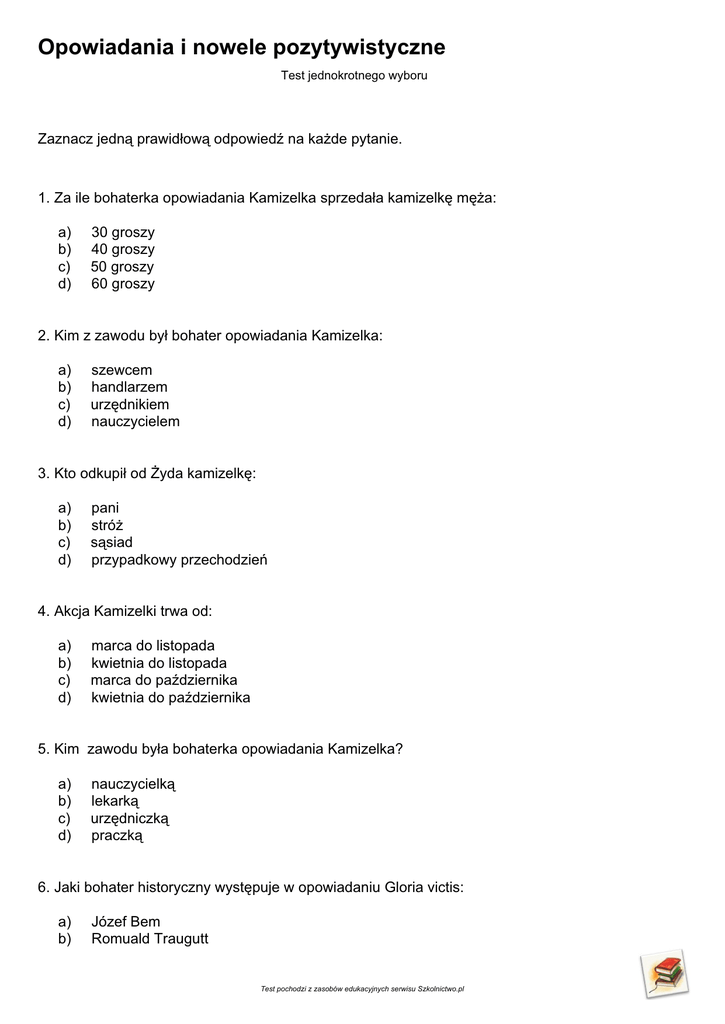 Opowiadania i nowele pozytywistyczne Test jednokrotnego wyboru Zaznacz jedną prawidłową odpowiedź na każde pytanie. 1. Za ile bohaterka opowiadania Kamizelka sprzedała kamizelkę męża: a) b) c) d) 30 groszy 40 groszy 50 groszy 60 groszy 2. Kim z zawodu był bohater opowiadania Kamizelka: a) b) c) d) szewcem handlarzem urzędnikiem nauczycielem 3. Kto odkupił od Żyda kamizelkę: a) b) c) d) pani stróż sąsiad przypadkowy przechodzień 4. Akcja Kamizelki trwa od: a) b) c) d) marca do listopada kwietnia do listopada marca do października kwietnia do października 5. Kim zawodu była bohaterka opowiadania Kamizelka? a) b) c) d) nauczycielką lekarką urzędniczką praczką 6. Jaki bohater historyczny występuje w opowiadaniu Gloria victis: a) b) Józef Bem Romuald Traugutt Test pochodzi z zasobów edukacyjnych serwisu Szkolnictwo.pl c) d) Tadeusz Kościuszko Jan Henryk Dąbrowski 7. Bohaterowie opowiadania Gloria victis brali udział w: a) b) c) d) powstaniu styczniowym powstaniu listopadowym powstaniu wielkopolskim powstaniu kościuszkowskim 8. Ile lat miał Tarłowski: a) b) c) d) 18 19 20 21 9. Komu drzewa opowiadały o powstaniu? a) b) c) d) wiatrowi kwiatom ptakom zwierzętom 10. Kto uratował wodza powstania? a) b) c) d) Marian Tarłowski Jagmin bezimienni powstańcy uratował się sam 11. Co oznacza zwrot gloria victis? a) b) c) d) chwała zwycięzcom chwała zwyciężonym chwała przegranym chwała pokonanym 12. Wieś Barania Głowa jest miejscem akcji utworu: a) b) c) d) Miłosierdzie gminy Kamizelka Nasza szkapa Szkice węglem 13. Ile lat miał syn Rzepów? Test pochodzi z zasobów edukacyjnych serwisu Szkolnictwo.pl a) b) c) d) pół roku rok 1,5 roku 2 lata 14. Kim z zawodu był Mendel Gdański?: a) b) c) d) lekarzem urzędnikiem powstańcem introligatorem 15. Ile lat miał Mendel?: a) b) c) d) 65 66 67 68 16. Kto pierwszy powiedział Mendlowi o biciu Żydów?: a) b) c) d) student sąsiadka dependent zegarmistrz 17. Ile rodzeństwa miał Mendel?: a) b) c) d) 12 13 14 15 18. Ile dzieci miał Mendel?: a) b) c) d) 5 6 7 8 19. Gdzie wychował się Mendel?: a) b) c) d) w Gdańsku na Podwalu w Warszawie na ulicy Ciepłej w Warszawie na Starym Mieście w Warszawie Test pochodzi z zasobów edukacyjnych serwisu Szkolnictwo.pl 20. Powstanie styczniowe to temat opowiadania: a) b) c) d) Antek Gloria victis Janko Muzykant Mendel Gdański 21. Autorek Kamizelki jest: a) b) c) d) Maria Konopnicka Eliza Orzeszkowa Bolesław Prus Henryk Sienkiewicz 22. Która z wymienionych nowel związana jest z pozytywistycznym postulatem asymilacji Żydów? a) b) c) d) Antek Kamizelka Gloria victis Mendel Gdański 23. Nowela to: a) krótki utwór pisany prozą, o skondensowanej i wyraziście zarysowanej akcji b) krótki utwór pisany prozą, o otwartej fabule c) krótki utwór pisany prozą, o skondensowanej i wyraziście zarysowanej akcji, z wyraźnym punktem kulminacyjnym d) krótki utwór pisany wierszem, o skondensowanej i wyraziście zarysowanej akcji, z wyraźnym punktem kulminacyjnym 24. W jaki sposób Rzepa ukarał żonę za zdradę? a) b) c) d) wypędził ją z domu zbił ją zabił ją wybaczył jej 25. Kto interesował się Rzepową? a) b) c) d) wójt burak pisarz Zołzikiewicz dziedzic naczelnik Test pochodzi z zasobów edukacyjnych serwisu Szkolnictwo.pl