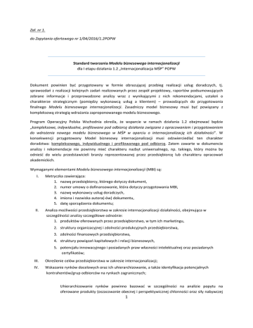 Zał. nr 1. do Zapytania ofertowego nr 1/04/2016/1.2POPW Standard tworzenia Modelu biznesowego internacjonalizacji dla I etapu działania 1.2 „Internacjonalizacja MŚP” POPW Dokument powinien być przygotowany w formie obrazującej przebieg realizacji usług doradczych, tj. sprawozdań z realizacji kolejnych zadań realizowanych przez zespół projektowy, raportów podsumowujących zebrane informacje i przeprowadzone analizy wraz z wynikającymi z nich rekomendacjami, ustaleń o charakterze strategicznym (pomiędzy wykonawcą usług a klientem) – prowadzących do przygotowania finalnego Modelu biznesowego internacjonalizacji. Zasadniczy model biznesowy musi być powiązany z kompleksową strategią wdrażania zaproponowanego modelu biznesowego. Program Operacyjny Polska Wschodnia określa, że wsparcie w ramach działania 1.2 obejmować będzie „kompleksowe, indywidualne, profilowane pod odbiorcę działania związane z opracowaniem i przygotowaniem do wdrożenia nowego modelu biznesowego w MŚP w oparciu o internacjonalizację ich działalności”. W konsekwencji przygotowany Model biznesowy internacjonalizacji musi odzwierciedlać ten charakter doradztwa: kompleksowego, indywidualnego i profilowanego pod odbiorcę. Zatem zawarte w dokumencie analizy i rekomendacje nie powinny mieć charakteru nazbyt uniwersalnego, np. takiego, który można by odnieść do wielu przedstawicieli branży reprezentowanej przez przedsiębiorcę lub charakteru opracowań akademickich. Wymaganymi elementami Modelu biznesowego internacjonalizacji (MBI) są: I. Metryczka zawierająca: 1. nazwę przedsiębiorcy, którego dotyczy dokument, 2. numer umowy o dofinansowanie, która dotyczy przygotowania MBI, 3. nazwę wykonawcy usług doradczych, 4. imiona i nazwiska autora(-ów) dokumentu, 5. datę sporządzenia dokumentu; II. Analiza możliwości przedsiębiorstwa w zakresie internacjonalizacji działalności, obejmująca w szczególności analizy szczegółowe odnośnie: 1. produktów oferowanych przez przedsiębiorstwo, w tym ich marketingu, 2. struktury organizacyjnej i zdolności produkcyjnych przedsiębiorstwa, 3. zdolności finansowych przedsiębiorstwa, 4. struktury powiązań kapitałowych i relacji biznesowych, 5. potencjału innowacyjnego i posiadanych praw własności intelektualnej oraz posiadanych certyfikatów; III. Określenie celów przedsiębiorstwa w zakresie internacjonalizacji; IV. Wskazanie rynków docelowych oraz ich uhierarchizowanie, a także identyfikacja potencjalnych kontrahentów/grup odbiorców na rynkach zagranicznych; Uhierarchizowanie rynków powinno bazować w szczególności na analizie popytu na oferowane produkty (oszacowanie obecnej i perspektywicznej chłonności oraz siły nabywczej 1 rynku), analizie otoczenia biznesowego (potencjalnych kontrahentów i konkurencji), analizie barier prawnych (np. celnych lub związanych z wymienialnością waluty i ograniczeniem przepływów finansowych) oraz analizie ryzyka (np. niestabilność polityczna, długie terminy płatności, ryzyko odnoszące się do systemów transakcyjnych, problemy dotyczące transportu produktów, ryzyko korupcyjne itp.). V. Koncepcja wejścia na rynek zagraniczny wraz z projekcją możliwości sprzedaży na wybranym rynku zagranicznym; Rekomendacje tego punktu dotyczą m.in. modelu sprzedaży i kanałów dystrybucji (przedstawiciel handlowy, dystrybutor, importer, inne…). W zakresie projekcji sprzedaży niezbędne będzie przedstawienie propozycji cenowej (rekomendacja strategii cenowej). W tym kontekście analiza powinna odnosić się do kosztów wytworzenia i wprowadzenia artykułu na rynek (zagraniczny), w tym m.in. − kosztów uzyskania niezbędnych certyfikatów i zezwoleń, dopełnienia formalności eksportowych/ importowych w związku z dystrybucją artykułu, − preferencji cenowych potencjalnych klientów, − poziomu cen konkurencji, − specyficznych regulacji prawnych, dotyczących kształtowania poziomu cen w poszczególnych krajach. VI. Określenie inicjatyw wspierających osiągnięcie założonych celów w zakresie internacjonalizacji (w szczególności propozycje kluczowych inwestycji w narzędzia ICT bądź urządzenia produkcyjne); VII. Wskazanie najefektywniejszych narzędzi i metod marketingowych oraz promocyjnych (w tym wskazanie wydarzeń targowych czy kierunków misji handlowych); VIII. Rekomendacje w zakresie reorganizacji przedsiębiorstwa i przygotowania go do działalności eksportowej (organizacji działu eksportu, logistyki etc.); Opis powinien odnosić się do wcześniejszej analizy struktury organizacyjnej i zdolności produkcyjnych (rekomendacje dot. rozwiązań gwarantujących możliwość zapewnienia stałych dostaw na rynki zagraniczne, rekomendacje w zakresie zatrudnienia odpowiednio wykwalifikowanych kadr, przygotowanych do realizacji obsługi i zamówień na rynkach międzynarodowych, rekomendacje dot. dostosowania aktualnej technologii produktu/ rodzaju opakowania do przepisów prawa międzynarodowego, wymogów jakościowych, norm bezpieczeństwa i uwarunkowań kulturowych, rekomendacje w zakresie międzynarodowego transportu towarów, itd.). IX. Propozycje możliwych źródeł zewnętrznego finansowania działalności eksportowej; X. Strategia zarządzania ryzykiem eksportowym w tym propozycje instrumentów finansowych obniżających ryzyko eksportowe; 2 1 XI. Syntetyczne, całościowe przedstawienie proponowanego modelu biznesowego , obejmujące co najmniej takie zagadnienia jak: 1. kluczowi partnerzy, 2. kluczowe działania, 3. kluczowe zasoby, 4. oferowane wartości, 5. relacje z klientami, 6. kanały dystrybucji, 7. segmenty klientów, 8. struktura kosztów, 9. struktura (źródła) przychodów; XII. Harmonogram i kosztorys wdrażania zaproponowanego modelu biznesowego z wyszczególnieniem wydatków związanych z przygotowaniem do wdrożenia modelu biznesowego kwalifikujących się do objęcia wsparciem w ramach II etapu działania 1.2 – ujęcie synt