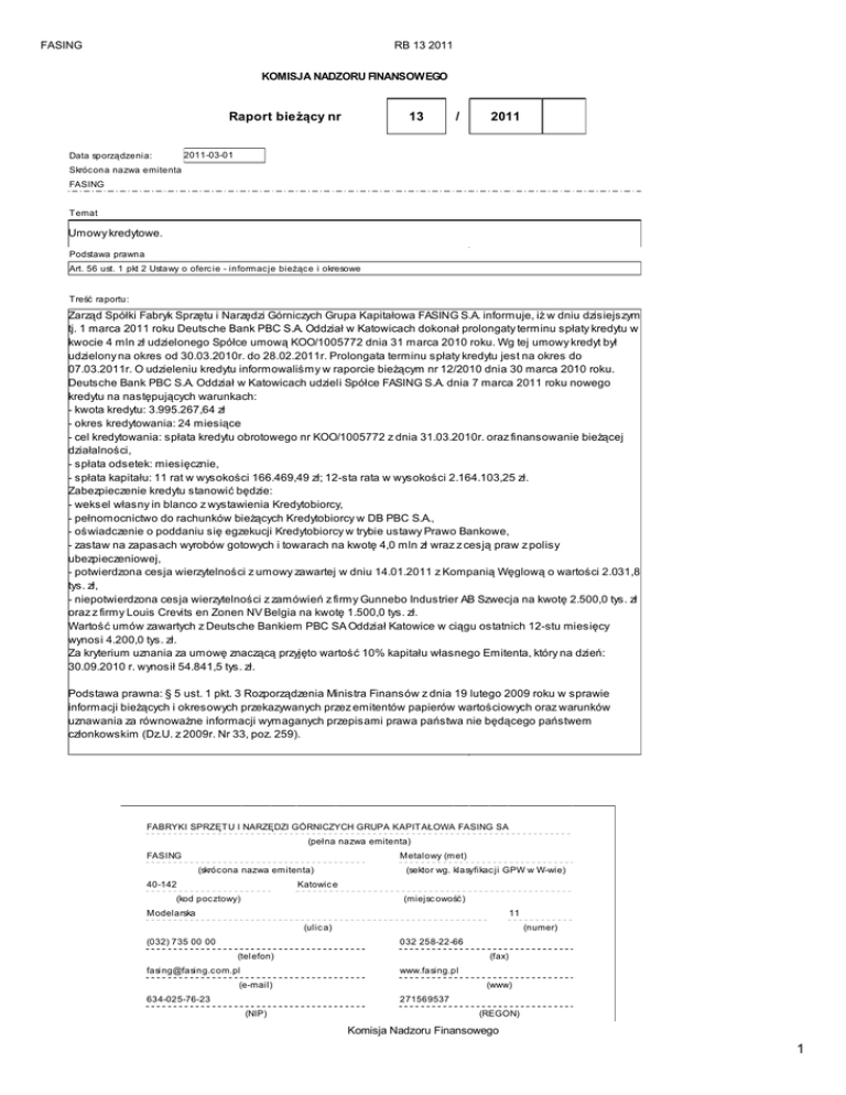 FASING RB 13 2011 KOMISJA NADZORU FINANSOWEGO Raport bieżący nr 13 / 2011 2011-03-01 Data sporządzenia: Skrócona nazwa emitenta FASING Temat Umowy kredytowe. Podstawa prawna Art. 56 ust. 1 pkt 2 Ustawy o oferc ie - informacje bieżące i okresowe Treść raportu: Zarząd Spółki Fabryk Sprzętu i Narzędzi Górniczych Grupa Kapitałowa FASING S.A. informuje, iż w dniu dzisiejszym tj. 1 marca 2011 roku Deutsche Bank PBC S.A. Oddział w Katowicach dokonał prolongaty terminu spłaty kredytu w kwocie 4 mln zł udzielonego Spółce umową KOO/1005772 dnia 31 marca 2010 roku. Wg tej umowy kredyt był udzielony na okres od 30.03.2010r. do 28.02.2011r. Prolongata terminu spłaty kredytu jest na okres do 07.03.2011r. O udzieleniu kredytu informowaliśmy w raporcie bieżącym nr 12/2010 dnia 30 marca 2010 roku. Deutsche Bank PBC S.A. Oddział w Katowicach udzieli Spółce FASING S.A. dnia 7 marca 2011 roku nowego kredytu na następujących warunkach: - kwota kredytu: 3.995.267,64 zł - okres kredytowania: 24 miesiące - cel kredytowania: spłata kredytu obrotowego nr KOO/1005772 z dnia 31.03.2010r. oraz finansowanie bieżącej działalności, - spłata odsetek: miesięcznie, - spłata kapitału: 11 rat w wysokości 166.469,49 zł; 12-sta rata w wysokości 2.164.103,25 zł. Zabezpieczenie kredytu stanowić będzie: - weksel własny in blanco z wystawienia Kredytobiorcy, - pełnomocnictwo do rachunków bieżących Kredytobiorcy w DB PBC S.A., - oświadczenie o poddaniu się egzekucji Kredytobiorcy w trybie ustawy Prawo Bankowe, - zastaw na zapasach wyrobów gotowych i towarach na kwotę 4,0 mln zł wraz z cesją praw z polisy ubezpieczeniowej, - potwierdzona cesja wierzytelności z umowy zawartej w dniu 14.01.2011 z Kompanią Węglową o wartości 2.031,8 tys. zł, - niepotwierdzona cesja wierzytelności z zamówień z firmy Gunnebo Industrier AB Szwecja na kwotę 2.500,0 tys. zł oraz z firmy Louis Crevits en Zonen NV Belgia na kwotę 1.500,0 tys. zł. Wartość umów zawartych z Deutsche Bankiem PBC SA Oddział Katowice w ciągu ostatnich 12-stu miesięcy wynosi 4.200,0 tys. zł. Za kryterium uznania za umowę znaczącą przyjęto wartość 10% kapitału własnego Emitenta, który na dzień: 30.09.2010 r. wynosił 54.841,5 tys. zł. Podstawa prawna: § 5 ust. 1 pkt. 3 Rozporządzenia Ministra Finansów z dnia 19 lutego 2009 roku w sprawie informacji bieżących i okresowych przekazywanych przez emitentów papierów wartościowych oraz warunków uznawania za równoważne informacji wymaganych przepisami prawa państwa nie będącego państwem członkowskim (Dz.U. z 2009r. Nr 33, poz. 259). FABRYKI SPRZĘTU I NARZĘDZI GÓRNICZYCH GRUPA KAPITAŁOWA FASING SA (peł na nazwa emitenta) FASING Metalowy (met) (skrócona nazwa emitenta) 40-142 (sektor wg. klasyfikac ji GPW w W-wie) Katowic e (kod pocztowy) (miejsc owość) Modelarska 11 (ulic a) (032) 735 00 00 (numer) 032 258-22-66 (tel efon) fasi [email protected] (fax) www.fasing.pl (e-mail) 634-025-76-23 (www) 271569537 (NIP) (REGON) Komisja Nadzoru Finansowego 1 FASING RB 13 2011 PODPISY OSÓB REPREZENTUJĄCYCH SPÓŁKĘ Data Imię i Nazwisko Stanowisko/Funkcja 2011-03-01 Mariusz Fiałek Wic eprezes Zarządu 2011-03-01 Grażyna Dudek Prokurent Podpis Komisja Nadzoru Finansowego 2