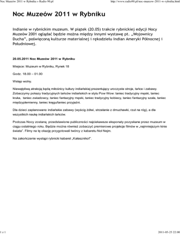 Noc Muzeów 2011 w Rybniku » Radio 90.pl 1z1 http://www.radio90.pl/noc-muzeow-2011-w-rybniku.html Noc Muzeów 2011 w Rybniku Indianie w rybnickim muzeum. W piątek (20.05) trakcie rybnickiej edycji Nocy Muzeów 2001 oglądać będzie można między innymi wystawę pt. „Wojownicy Ducha”, poświęconą kulturze materialnej i rękodziełu Indian Ameryki Północnej i Południowej. 20.05.2011 Noc Muzeów 2011 w Rybniku Miejsce: Muzeum w Rybniku, Rynek 18 Godz. 18.00 – 01.00 Wstęp wolny. Niewątpliwą atrakcją będą miłośnicy kultury indiańskiej prezentujący uroczyste stroje, tańce i zabawy. Zobaczymy pokazy tradycyjnych tańców indiańskich w stylu Pow Wow: taniec tradycyjny męski, taniec kruka, taniec zwiadowcy, taniec fantazyjny męski, taniec tradycyjny kobiecy, taniec fantazyjny szala, taniec międzyplemienny, taniec kręgu/taniec przyjaźni. Dla dzieci zaplanowano indiańskie zabawy (wyścig żółwi, strzelanie z dmuchawki, rzut na róg), a dla wszystkich naukę indiańskich tańców. Podczas Nocy zostaną przedstawione publiczności najciekawsze eksponaty pozyskane przez muzeum w ciągu ostatniego roku. Będzie można również zobaczyć premierowe projekcje filmów w „najmniejszym kinie świata”. Filmy na tę okazję przygotowali twórcy z kabaretu Noł Nejm. Na zakończenie wystąpi rybnicki kabaret „Kałasznikof”. 2011-05-25 22:00