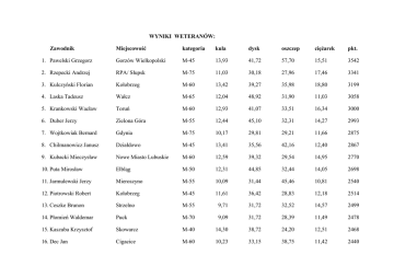 WYNIKI WETERANÓW: Miejscowość kategoria kula dysk oszczep ciężarek pkt. 1. Pawelski Grzegorz Gorzów Wielkopolski M-45 13,93 41,72 57,70 15,51 3542 2. Rzepecki Andrzej RPA/ Słupsk M-75 11,03 30,18 27,96 17,46 3341 3. Kulczyński Florian Kołobrzeg M-60 13,42 39,27 35,98 18,80 3199 4. Laska Tadeusz Wałcz M-65 12,04 48,92 31,90 11,03 3058 5. Krankowski Wacław Toruń M-60 12,93 41,07 33,51 16,34 3000 6. Duber Jerzy Zielona Góra M-55 12,44 45,10 32,31 14,27 2993 7. Wojtkowiak Bernard Gdynia M-75 10,17 29,81 29,21 11,66 2875 8. Chilmanowicz Janusz Działdowo M-45 13,41 35,56 42,16 12,40 2867 9. Kubacki Mieczysław Nowe Miasto Lubuskie M-60 12,59 39,32 29,54 14,95 2770 10. Puta Mirosław Elbląg M-50 12,31 44,85 32,44 14,05 2698 11. Jarmulewski Jerzy Mieroszyno M-55 10,09 31,44 45,46 10,81 2540 12. Piotrowski Robert Kołobrzeg M-45 11,61 36,42 28,83 12,18 2514 13. Ceszke Brunon Strzelno M-55 9,71 31,72 32,52 14,57 2499 14. Płomień Waldemar Puck M-70 9,09 31,72 28,39 11,49 2478 15. Kaszuba Krzysztof Skowarcz M-40 14,30 38,72 24,20 12,51 2468 16. Dec Jan Cigacice M-60 10,23 33,15 38,75 11,42 2440 Zawodnik 17. Wielgus Ryszard Gdynia M-60 9,29 38,58 32,20 12,94 2438 18. Nowak Ireneusz Zielona Góra M-65 10,31 34,27 24,01 10,82 2366 19. Jędrzejewski Krzysztof Władysławowo M-50 11,97 35,92 30,94 10,79 2267 20. Foerster Jerzy Gdynia M-60 10,68 29,48 28,82 9,15 2057 21. Borzecki Stefan Malbork M-65 9,67 24,58 23,13 10,43 2043 22. Tyrolski Grzegorz Tczew M-35 10,06 33,36 52,58 7,45 2008 23. Wielgus Michał Gdynia M-35 11,59 31,89 34,58 10,69 1991 24. Jeka Waldemar Połczyno M-40 8,12 29,69 30,88 8,23 1689 25. Borowski Sławomir Kiezmark M-35 8,47 29,24 23,46 11,22 1616 1. Renusz Irena Mieroszyno K-55 9,01 24,05 17,03 6,58 2013 2. Ptak Ryszarda Wejherowo K-45 9,26 27,04 20,68 7,49 1981 KOBIETY: MĘŻCZYŹNI PK (sprzęt seniorski – kat. M-35) rocznik 1. Mielke Sebastian Luzino 1987 14,57 39,27 52,50 14,62 2. Skibicki Jarosław Gdańsk 1989 11,28 31,18 47,36 7,68 sprzęt rzutowy dla zawodników w kategorii M35, M40 i M45 kula 7,26kg dysk 2,0kg oszczep 800g ciężarek 15,88kg sprzęt rzutowy dla zawodników w kategorii M50 i M55 sprzęt rzutowy dla zawodników w kategorii M60 i M65 sprzęt rzutowy dla zawodników w kategorii M70 i M75 sprzęt rzutowy dla zawodników w kategorii M80+ kula 6,0kg dysk 1,5kg oszczep 700g ciężarek 11,34kg kula 5,0kg dysk 1,0kg oszczep 600g ciężarek 9,08kg kula 4,0kg dysk 1,0kg oszczep 500g ciężarek 7,26kg kula 3,0kg dysk 1,0kg oszczep 400g ciężarek 5,45kg kula 4,0kg dla K35-K45 sprzęt rzutowy dla zawodniczek w kategoriach wiekowych kula 3,0kg dla K50-K70 kula 2,0kg dla K75-K100 dysk 1,0kg dla K35-K70 dysk 0,75kg dla K75-K100 oszczep 600g dla K35-K45 ciężarek 9,08kg dla K35-K45 oszczep 500g dla K50-K55 ciężarek 7,26kg dla K50-K55 oszczep 400g dla K60-K100 ciężarek 5,45kg dla K60-K70 ciężarek 4,0kg dla K75-K100 Sędzia Główny Zawodów Henryk Fiedorowicz