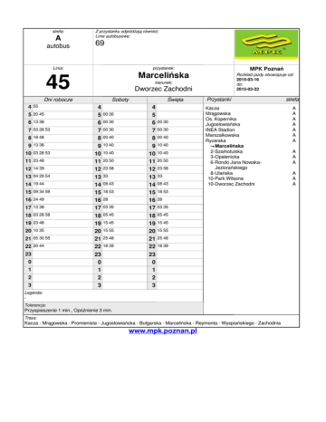 strefa: A autobus Z przystanku odjeżdżają również: Linie autobusowe: 69 Linia: 45 Dni robocze 4 55 5 20 45 6 13 38 7 03 28 53 8 18 48 9 13 38 10 03 28 53 11 23 48 12 14 39 13 04 29 54 14 19 44 15 09 34 59 16 24 49 17 13 38 18 03 28 58 19 23 48 20 10 35 21 05 30 55 22 20 44 23 0 1 2 3 MPK Poznań przystanek: Marcelińska Rozkład jazdy obowiązuje od: 2015-03-16 do: 2015-03-22 kierunek: Dworzec Zachodni 4 5 6 7 8 9 10 11 12 13 14 15 16 17 18 19 20 21 22 23 0 1 2 3 Soboty 00 30 00 30 00 30 00 40 10 40 10 40 20 50 23 58 33 08 43 18 53 28 03 35 05 45 15 45 15 55 25 48 18 39 4 5 6 7 8 9 10 11 12 13 14 15 16 17 18 19 20 21 22 23 0 1 2 3 Święta 00 30 00 30 00 40 10 40 10 40 20 50 23 58 33 08 43 Przystanki Kacza Mrągowska Os. Kopernika Jugosłowiańska INEA Stadion Marszałkowska Rycerska →Marcelińska 2-Szamotulska 3-Opalenicka 6-Rondo Jana NowakaJeziorańskiego 8-Ułańska 10-Park Wilsona 10-Dworzec Zachodni 18 53 28 03 35 05 45 15 45 15 55 25 48 18 39 Legenda: - Tolerancja: Przyspieszenie 1 min., Opóźnienie 3 min. Trasa: Kacza - Mrągowska - Promienista - Jugosłowiańska - Bułgarska - Marcelińska - Reymonta - Wyspiańskiego - Zachodnia www.mpk.poznan.pl strefa A A A A A A A A A A A A A