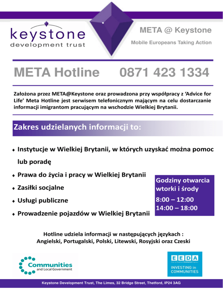 META @ Keystone Mobile Europeans Taking Action META Hotline 0871 423 1334 Założona przez META@Keystone oraz prowadzona przy współpracy z ‘Advice for Life’ Meta Hotline jest serwisem telefonicznym mającym na celu dostarczanie informacji imigrantom pracującym na wschodzie Wielkiej Brytanii. Zakres udzielanych informacji to: ♦ Instytucje w Wielkiej Brytanii, w których uzyskać można pomoc lub poradę ♦ Prawa do życia i pracy w Wielkiej Brytanii ♦ Zasiłki socjalne Godziny otwarcia wtorki i środy ♦ Usługi publiczne ♦ Prowadzenie pojazdów w Wielkiej Brytanii 8:00 – 12:00 14:00 – 18:00 Hotline udziela informacji w następujących językach : Angielski, Portugalski, Polski, Litewski, Rosyjski oraz Czeski Keystone Development Trust, The Limes, 32 Bridge Street, Thetford, IP24 3AG