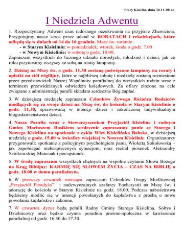 Stary Kisielin, dnia 30.11.2014r. I Niedziela Adwentu 1. Rozpoczynamy Adwent czas radosnego oczekiwania na przyjście Zbawiciela. Przygotujmy nasze serca przez udział w RORATACH i rekolekcjach, które odbędą się w dniach od 14 do 16 grudnia. Msze św. roratnie: - w Starym Kisielinie: w poniedziałek, wtorek, środa o godz. 7.00 - w Nowym Kisielinie: w sobotę o godz. 18.00. Zapraszam wszystkich do licznego udziału dorosłych, młodzież i dzieci, jak co roku przynosimy wszyscy ze sobą na roraty lampiony. 2. Dzisiaj na Mszy św. o godz. 11.30 zostaną poświęcone lampiony na roraty i opłatki na stół wigilijny, które w najbliższą sobotę i niedzielę zostaną rozniesione przez przedstawicieli Naszej Wspólnoty parafialnej do wszystkich rodzin wraz z terminem przewidzianych odwiedzin kolędowych. Za ofiary złożone na cele związane z administracją parafii składam serdeczne Bóg zapłać. 3. W dzisiejszą niedzielę zapraszam Członków Żywego Różańca Rodziców modlących się za swoje dzieci na Mszę św. do kościoła w Starym Kisielinie o godz. 11.30, sprawowaną w intencji dzieci i zakończoną indywidualnym błogosławieństwem dzieci. 4. Nasza Parafia wraz z Stowarzyszeniem Przyjaciół Kisielina i radnym Gminy Mariuszem Rosikiem serdecznie zapraszamy panie ze Starego i Nowego Kisielina na spotkanie z cyklu Wieś Kisielińska Babska, w dzisiejszą niedzielę o godz. 15.00 w świetlicy wiejskiej w Nowym Kisielinie. Organizatorzy przygotowali: spotkanie z policyjnym psychologiem panią Wiolettą Sokołowską – jak zapobiegać niebezpiecznym sytuacjom, oraz recital piosenek Aleksandry Sztukowskiej-Matusiak i poczęstunek. 5. W środę zapraszam wszystkich chętnych na wspólne czytanie Słowa Bożego na Krąg Biblijny: KARMIĘ SIĘ SŁOWEM ŻYCIA – CZAS NA BIBLIĘ o godz. 18.00 w domu parafialnym. 6. W pierwszy czwartek miesiąca zapraszam Członków Grupy Modlitewnej „Przyjaciół Paradyża” i nadzwyczajnych szafarzy Eucharystii na Mszę św. i adorację do kościoła w Starym Kisielinie na godz. 18.00. Podczas nabożeństwa będziemy modlić się w intencji powołanych do kapłaństwa z prośbą o nowe powołania kapłańskie i zakonne. 7. W czwartek dyżur będą pełnili Radny Gminy Starego Kisielina, Sołtys i Dzielnicowy oraz będzie czynna poradnia prawno-społeczna w kawiarence parafialnej od godz. 16.30 do 17.30. 8. W sobotę 6. grudnia przypada wspomnienie św. Mikołaja. Nie zapomnijmy obdarować dzieci choćby drobnym upominkiem, natomiast siebie nawzajem obdarujmy szczerym uśmiechem, dobrym słowem oraz dobrym uczynkiem. 9. W tym tygodniu przypada I piątek miesiąca: - odwiedziny chorych w domach o zwykłej porze - spowiedź św. w piątek pół godziny przed Mszą św. - dzieci z klasy III przychodzą na Mszę św. w strojach komunijnych i przynoszą ze sobą książeczki „Moje 9. pierwszych piątków miesiąca”. - Msza św. w Nowym Kisielinie o godz. 16.30 - Zapraszam w tym dniu Członków Wspólnoty Apostolstwa Modlitwy św. Faustyny na modlitwy przy relikwiach św. Faustyny od godz. 17.30 i na Eucharystię i adorację o godz. 18.00. 10. W piątek zapraszam na KORONKĘ DO MIŁOSIERDZIA BOŻEGO na godz. 15.00 do kościoła w Starym Kisielinie. 11. W pierwszą sobotę miesiąca zapraszam wszystkich członków Żywego Różańca do wspólnej modlitwy ku czci Niepokalanego Serca Najświętszej Maryi Panny do kościoła w Nowym Kisielinie na godz. 17.30 na wspólną modlitwę różańcową, a następnie o godz. 18.00 eucharystia, wystawienie Najświętszego Sakramentu, adorację. 12. W przyszłą niedzielę zmiana tajemnic Żywego Różańca o godz. 7.30 w kościele w Starym Kisielinie. Spotkanie formacyjne dla Róż Różańcowych w niedzielę (7 grudnia) o godz. 16.00 w kawiarence parafialnej. 13. Ksiądz Proboszcz Andrzej Brenk, Poseł RP Waldemar Sługocki, Radni Gminy Jacek Rusiński i Mariusz Rosik oraz Stowarzyszenie Przyjaciół Kisielina serdecznie zapraszają wszystkie dzieci na spotkanie ze Św. Mikołajem w niedzielę 7 grudnia w kościele w Starym Kisielinie o godz. 11.30. Św. Mikołaj wręczy wszystkim dzieciom słodką niespodziankę. 14. ZAPOWIEDZI PRZEDMAŁZEŃSKIE Tomasz Szczepański zam. Zielona Góra Sylwia Szczepańska zam. Stary Kisielin 15. Od dzisiejszej niedzieli są do nabycia świece Caritas na stół wigilijny. 16. W przyszłą niedzielę przy wyjściu z kościoła składamy ofiary do puszek na pomoc Kościołowi Katolickiemu na Wschodzie. Bóg zapłać za ofiary składane na cele naszej Parafii. Ks. kanonik dr Andrzej Brenk Proboszcz