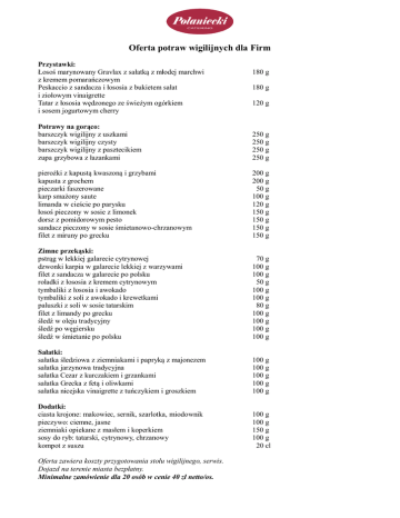 Oferta potraw wigilijnych dla Firm Przystawki: Łosoś marynowany Gravlax z sałatką z młodej marchwi z kremem pomarańczowym Peskaccio z sandacza i łososia z bukietem sałat i ziołowym vinaigrette Tatar z łososia wędzonego ze świeżym ogórkiem i sosem jogurtowym cherry 180 g 180 g 120 g Potrawy na gorąco: barszczyk wigilijny z uszkami barszczyk wigilijny czysty barszczyk wigilijny z pasztecikiem zupa grzybowa z łazankami 250 g 250 g 250 g 250 g pierożki z kapustą kwaszoną i grzybami kapusta z grochem pieczarki faszerowane karp smażony saute limanda w cieście po parysku łosoś pieczony w sosie z limonek dorsz z pomidorowym pesto sandacz pieczony w sosie śmietanowo-chrzanowym filet z miruny po grecku 200 g 200 g 50 g 100 g 120 g 150 g 150 g 150 g 150 g Zimne przekąski: pstrąg w lekkiej galarecie cytrynowej dzwonki karpia w galarecie lekkiej z warzywami filet z sandacza w galarecie po polsku roladki z łososia z kremem cytrynowym tymbaliki z łososia i awokado tymbaliki z soli z awokado i krewetkami paluszki z soli w sosie tatarskim filet z limandy po grecku śledź w oleju tradycyjny śledź po węgiersku śledź w śmietanie po polsku 70 g 100 g 100 g 50 g 100 g 100 g 80 g 100 g 100 g 100 g 100 g Sałatki: sałatka śledziowa z ziemniakami i papryką z majonezem sałatka jarzynowa tradycyjna sałatka Cezar z kurczakiem i grzankami sałatka Grecka z fetą i oliwkami sałatka nicejska vinaigrette z tuńczykiem i groszkiem 100 g 100 g 100 g 100 g 100 g Dodatki: ciasta krojone: makowiec, sernik, szarlotka, miodownik pieczywo: ciemne, jasne ziemniaki opiekane z masłem i koperkiem sosy do ryb: tatarski, cytrynowy, chrzanowy kompot z suszu 100 g 100 g 150 g 100 g 20 cl Oferta zawiera koszty przygotowania stołu wigilijnego, serwis. Dojazd na terenie miasta bezpłatny. Minimalne zamówienie dla 20 osób w cenie 40 zł netto/os.