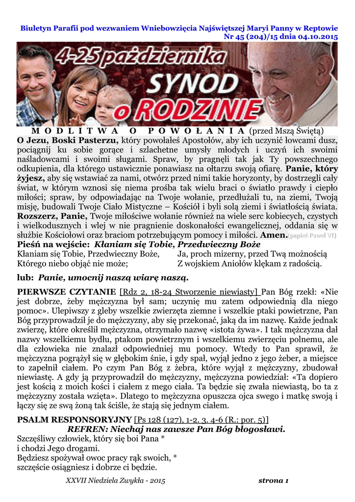 Biuletyn Parafii pod wezwaniem Wniebowzięcia Najświętszej Maryi Panny w Reptowie Nr 45 (204)/15 dnia 04.10.2015 M O D L I T W A O P O W O Ł A N I A (przed Mszą Świętą) O Jezu, Boski Pasterzu, który powołałeś Apostołów, aby ich uczynić łowcami dusz, pociągnij ku sobie gorące i szlachetne umysły młodych i uczyń ich swoimi naśladowcami i swoimi sługami. Spraw, by pragnęli tak jak Ty powszechnego odkupienia, dla którego ustawicznie ponawiasz na ołtarzu swoją ofiarę. Panie, który żyjesz, aby się wstawiać za nami, otwórz przed nimi takie horyzonty, by dostrzegli cały świat, w którym wznosi się niema prośba tak wielu braci o światło prawdy i ciepło miłości; spraw, by odpowiadając na Twoje wołanie, przedłużali tu, na ziemi, Twoją misję, budowali Twoje Ciało Mistyczne – Kościół i byli solą ziemi i światłością świata. Rozszerz, Panie, Twoje miłościwe wołanie również na wiele serc kobiecych, czystych i wielkodusznych i wlej w nie pragnienie doskonałości ewangelicznej, oddania się w służbie Kościołowi oraz braciom potrzebującym pomocy i miłości. Amen.(papież Paweł VI) Pieśń na wejście: Kłaniam się Tobie, Przedwieczny Boże Kłaniam się Tobie, Przedwieczny Boże, Ja, proch mizerny, przed Twą możnością Którego niebo objąć nie może; Z wojskiem Aniołów klękam z radością. lub: Panie, umocnij naszą wiarę naszą. PIERWSZE CZYTANIE [Rdz 2, 18-24 Stworzenie niewiasty] Pan Bóg rzekł: «Nie jest dobrze, żeby mężczyzna był sam; uczynię mu zatem odpowiednią dla niego pomoc». Ulepiwszy z gleby wszelkie zwierzęta ziemne i wszelkie ptaki powietrzne, Pan Bóg przyprowadził je do mężczyzny, aby się przekonać, jaką da im nazwę. Każde jednak zwierzę, które określił mężczyzna, otrzymało nazwę «istota żywa». I tak mężczyzna dał nazwy wszelkiemu bydłu, ptakom powietrznym i wszelkiemu zwierzęciu polnemu, ale dla człowieka nie znalazł odpowiedniej mu pomocy. Wtedy to Pan sprawił, że mężczyzna pogrążył się w głębokim śnie, i gdy spał, wyjął jedno z jego żeber, a miejsce to zapełnił ciałem. Po czym Pan Bóg z żebra, które wyjął z mężczyzny, zbudował niewiastę. A gdy ją przyprowadził do mężczyzny, mężczyzna powiedział: «Ta dopiero jest kością z moich kości i ciałem z mego ciała. Ta będzie się zwała niewiastą, bo ta z mężczyzny została wzięta». Dlatego to mężczyzna opuszcza ojca swego i matkę swoją i łączy się ze swą żoną tak ściśle, że stają się jednym ciałem. PSALM RESPONSORYJNY [Ps 128 (127), 1-2. 3. 4-6 (R.: por. 5)] REFREN: Niechaj nas zawsze Pan Bóg błogosławi. Szczęśliwy człowiek, który się boi Pana * i chodzi Jego drogami. Będziesz spożywał owoc pracy rąk swoich, * szczęście osiągniesz i dobrze ci będzie. XXVII Niedziela Zwykła - 2015 strona 1 Małżonka twoja jak płodny szczep winny * w zaciszu twojego domu. Synowie twoi jak oliwne gałązki * dokoła twego stołu. Tak będzie błogosławiony człowiek, który się boi Pana. * Niechaj cię z Syjonu Pan błogosławi i obyś oglądał pomyślność Jeruzalem † przez wszystkie dni twego życia. * Obyś oglądał potomstwo swych dzieci. Pokój nad Izraelem. DRUGIE CZYTANIE [Hbr 2, 9-11 Chrystus, który uświęca, jak i ludzie, którzy mają być uświęcani, z jednego są wszyscy] Bracia: Widzimy Jezusa, który mało od aniołów był pomniejszony, chwałą i czcią ukoronowanego za cierpienia śmierci, iż z łaski Bożej za wszystkich zaznał śmierci. Przystało bowiem Temu, dla którego wszystko i przez którego wszystko, który wielu synów do chwały doprowadza, aby przewodnika ich zbawienia udoskonalił przez cierpienie. Tak bowiem Chrystus, który uświęca, jak ludzie, którzy mają być uświęceni, z jednego są wszyscy. Z tej to przyczyny nie wstydzi się nazwać ich braćmi swymi. ŚPIEW PRZED EWANGELIĄ: [1 J 4, 12] Jeżeli miłujemy się wzajemnie, Bóg w nas mieszka i miłość ku Niemu jest w nas doskonała. EWANGELIA [Mk 10, 2-16 (krótsza perykopa Mk 10, 2-12) Co Bóg złączył, tego człowiek niech nie rozdziela] Faryzeusze przystąpili do Jezusa i chcąc Go wystawić na próbę, pytali Go, czy wolno mężowi oddalić żonę. Odpowiadając, zapytał ich: «Co wam nakazał Mojżesz?». Oni rzekli: «Mojżesz pozwolił napisać list rozwodowy i oddalić». Wówczas Jezus rzekł do nich: «Przez wzgląd na zatwardziałość serc waszych napisał wam to przykazanie. Lecz na początku stworzenia Bóg „stworzył ich jako mężczyznę i kobietę: dlatego opuści człowiek ojca swego i matkę i złączy się ze swoją żoną, i będą oboje jednym ciałem”. A tak już nie są dwoje, lecz jedno ciało. Co więc Bóg złączył, tego człowiek niech nie rozdziela». W domu uczniowie raz jeszcze pytali Go o to. Powiedział im: «Kto oddala żonę swoją, a bierze inną, popełnia cudzołóstwo względem niej. I jeśli żona opuści swego męża, a wyjdzie za innego, popełnia cudzołóstwo». [Koniec krótszej perykopy] Przynosili Mu również dzieci, żeby ich dotknął; lecz uczniowie szorstko zabraniali im tego. A Jezus widząc to, oburzył się i rzekł do nich: «Pozwólcie dzieciom przychodzić do Mnie, nie przeszkadzajcie im; do takich bowiem należy królestwo Boże. Zaprawdę, powiadam wam: Kto nie przyjmie królestwa Bożego jak dziecko, ten nie wejdzie do niego». I biorąc je w objęcia, kładł na nie ręce i błogosławił je. Pieśń na Ofiarowanie: Jeden chleb, co zmienia się w Chrystusa Ciało Jeden chleb, co zmienia się w Chrystusa Ref. Jak ten chleb, co złączył złote ziarna, Ciało,z wielu ziaren pszenicznych się rodzi. tak niech miłość złączy nas ofiarna. Jedno wino, co się Krwią Chrystusa stało, Jak ten kielich łączy kropel wiele, z soku wielu winnych gron pochodzi. tak nas, Chryste, w swoim złącz Kościele. lub: Gdzie miłość wzajemna i dobroć Gdzie miłość wzajemna i dobroć, weselmy się w Nim i r