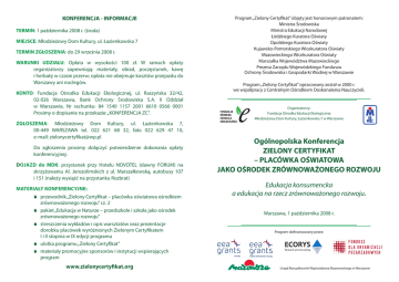 KONFERENCJA - INFORMACJE TERMIN: 1 października 2008 r. (środa) MIEJSCE: Młodzieżowy Dom Kultury, ul. Łazienkowska 7 TERMIN ZGŁOSZENIA: do 29 września 2008 r. WARUNKI UDZIAŁU: Opłata w wysokości 100 zł. W ramach opłaty organizatorzy zapewniają: materiały, obiad, poczęstunek, kawę i herbatę w czasie przerw; opłata nie obejmuje kosztów przejazdu do Warszawy ani noclegów. KONTO: Fundacja Ośrodka Edukacji Ekologicznej, ul. Raszyńska 32/42, 02-026 Warszawa, Bank Ochrony Środowiska S.A. II Oddział w Warszawie, Nr rachunku: 84 1540 1157 2001 6610 0566 0001 Prosimy o dopisanie na przekazie: „KONFERENCJA ZC”. Zgłoszenia: Młodzieżowy Dom Kultury, ul. Łazienkowska 7, 00-449 WARSZAWA tel. 022 621 68 32, faks 022 629 47 10, e-mail: [email protected] Do zgłoszenia prosimy dołączyć potwierdzenie dokonania opłaty konferencyjnej. Dojazd do MDK: przystanek przy Hotelu NOVOTEL (dawny FORUM) na skrzyżowaniu Al. Jerozolimskich z ul. Marszałkowską, autobusy 107 i 151 (należy wysiąść na przystanku Rozbrat) Materiały konferencyjne: Sprzewodnik „Zielony Certyfikat – placówka oświatowa ośrodkiem zrównoważonego rozwoju” cz. 2 S pakiet „Edukacja w Naturze – przedszkole i szkoła jako ośrodek zrównoważonego rozwoju” S streszczenia wykładów i opis warsztatów oraz prezentacje dorobku placówek wyróżnionych Zielonym Certyfikatem I i II stopnia w IX edycji programu S ulotka programu „Zielony Certyfikat” S materiały promocyjne sponsorów i instytucji wspierających program www.zielonycertyfikat.org Program „Zielony Certyfikat” objęty jest honorowym patronatem: Ministra Środowiska Ministra Edukacji Narodowej Łódzkiego Kuratora Oświaty Opolskiego Kuratora Oświaty Kujawsko-Pomorskiego Wicekuratora Oświaty Mazowieckiego Wicekuratora Oświaty Marszałka Województwa Mazowieckiego Prezesa Zarządu Wojewódzkiego Funduszu Ochrony Środowiska i Gospodarki Wodnej w Warszawie Program „Zielony Certyfikat” opracowany został w 2000 r. we współpracy z Centralnym Ośrodkiem Doskonalenia Nauczycieli. Organizatorzy: Fundacja Ośrodka Edukacji Ekologicznej Młodzieżowy Dom Kultury, Łazienkowska 7 w Warszawie Ogólnopolska Konferencja ZIELONY CERTYFIKAT – PLACÓWKA OŚWIATOWA JAKO OŚRODEK ZRÓWNOWAŻONEGO ROZWOJU Edukacja konsumencka a edukacja na rzecz zrównoważonego rozwoju. Warszawa, 1 października 2008 r. Program dofinansowany przez: Urząd Marszałkowski Województwa Mazowieckiego w Warszawie Program Konferencji środa, 1 października 2008 r. Młodzieżowy Dom Kultury, ul. Łazienkowska 7 8.30 10.00 Recepcja Otwarcie konferencji Prezentacja multimedialna programu „Zielony Certyfikat” Wykłady: SZielony konsument – znaczenie edukacji konsumenkiej w edukacji na rzecz zrównoważonego rozwoju S Rola placówki oświatowej jako lidera zrównoważonego rozwoju – możliwości współpracy z firmami przyjaznymi środowisku S „Leciutkie ocieplenie klimatu” a edukacja konsumencka 11.30 Przerwa (kawa, herbata, kanapki) 12.00 Warsztaty: S „Nie potrzebuję, nie kupuję” – propozycje gier i zabaw dla dzieci i młodzieży S „ABC Zielonego Konsumenta” – przewodnik po świecie konsumcji S Jak odpowiedzialnie kształtować świadomość konsumencką dzieci i młodzieży? S Zielony Certyfikat I stopnia – realizacja przedsięwzięć, dokumetacja. S Ewaluacja działań i przedsięwzięć realizowanych w ramach ubiegania się o Zielony Certyfikat I i II stopnia. S Zielony Certyfikat II stopnia – przygotowanie dokumentacji. S Placówka oświatowa liderem zrównoważonego rozwoju 14.00 Obiad Prezentacja dorobku placówek IX edycji programu „Zielony Certyfikat”. 15.30 Warsztaty (powtórzenie) 17.30 Zakończenie konferencji 17.30 - 18.30 Indywidualne konsultacje z ekspertami programu „Zielony Certyfikat” Uroczyste wręczanie Zielonych Certyfikatów I i II stopnia placówkom wyróżnionym w IX edycji programu środa 1 października 2008 r. w godz. 16.00-18.00 Biblioteka Narodowa w Warszawie, Al. Niepodległości 213 Placówki wyróżnione Zielonym Certyfikatem w IX edycji programu: Zielony Certyfikat I stopnia S S S S S S S S S S S S S S Przedszkole Miejskie Nr 1 z Oddziałem Integracyjnym w Giżycku Publiczne Przedszkole w Naroku Przedszkole Specjalne dla Dzieci Słabowidzących Nr 245 w Warszawie Szkoła Podstawowa nr 2 im. Henryka Sienkiewicza w Piszu Szkoła Podstawowa im. Św. Huberta w Mstyczowie Szkoła Podstawowa nr 1 im. K. Marcinkowskiego w Murowanej Goślinie Zespól Szkolno-Przedszkolny nr 2 w Warszawie Gimnazjum nr 1 im. Mikołaja Kopernika w Łaziskach Górnych Przedszkole Publiczne nr 4 w Jaworze Przedszkole Publiczne nr 41 w Rybniku Szkoła Podstawowa nr 18 im. Orła Białego w Olsztynie Szkoła Podstawowa nr 13 im. Św. Jana Kantego w Rzeszowie Gimnazjum nr 1 w Piasecznie Zespół Szkół Specjalnych im. Juliana Tuwima w Krapkowicach Zielony Certyfikat II stopnia (w trakcie certyfikacji) S S S S S S S S Zespół Szkół w Rudnej Wielkiej Zespół Szkół Technicznych w Radomiu Przedszkole nr 3 im. Jana Brzechwy w Sieradzu Przedszkole Miejskie nr 1 im. Krasnala Hałabały w Łobzie Przedszkole nr 346 “Pod Kasztanem”w Warszawie Przedszkole Niepubliczne „Pod Tęczą” w Inowrocławiu Szkoła Podstawowa nr 2 w Płońsku Miejskie Przedszkole i Żłobek “Ekoludki” w Ełku (przedłużenie na 4 lata) Ze względu na ograniczoną liczbę miejsc na uroczystość zapraszamy tylko delegacje z wyróżnionych placówek.