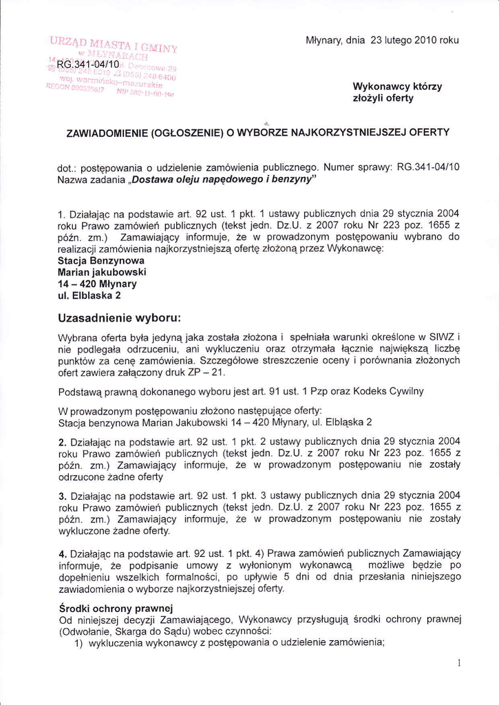 l\i]łVnary' ,:.'RG1341.04/1'0, . dnia 23 lutego 2010 roku . Wykonawcy którzy złożyliofeńy zAWlADoMlENlE (ocŁoszENlE) o vVYBoRzE NAJKoRzYsTNlEJszEJ oFERTY dot': postępowania o udzielenie zamóWienia publicznego' Numer sprawy: RG'341-04/10 Nazwa zadania ,,Dostawa oleju napędowego i benzyny" 1. Działając na podstawie ań. 92 ust. 1 pkt' 1 ustawy publicznych dnia 29 stycznia 2004 roku Prawo zamóWień publicznych (tekst jedn' Dz.U. z 2007 roku Nr 223 poz' 1655 z póżn' zm') zamawiąący informuje, że W prowadzonym postępowaniu Wybrano do realizacji zamówienia najkorzysiniejszą oleńę zIożonąprzez Wykonawcę: Stacja Benzynowa Marian jakubowski 14 - 42o Młynary ul. Elblaska 2 Uzasadnienie wyboru: i Wybrana ofeńa była jedyną jaka zosIała złoŻona spełniała Warunki określonew slWZ i nie podlegała odrzuceniu, ani Wykluczeniu oraz otrzymala łącznie największą liczbę punktów za cenę zamóWienia. szczegółowe streszczenie oceny i poróWnania złożonych ofei' zawiela załączony druk ZP _ 21 ' Podstawą prawną dokonanego Wyboru jest ań' 91 ust' 1 Pzp oraz Kodeks cwilny W prowadZonym postępowaniu złożononastępujące oferty: stacja benzynowa lv]arian Jakubowski 14 _ 420 Młynary' ul' ElbląSka 2 2. Działąąc na podstawie ań' 92 ust' 1 pkt. 2 ustawy publicznych dnia 29 stycznia 2004 roku Prawo zamóWień publicznych (tekst.jedn. Dz'U' z 2007 roku Nr 223 poz' 1655 z póżn' zm') zamawjąący informuje' że W prowadzonym postępowaniu nie Zostały odrzucone Żadne ofeńy 3. Działając na podstawie ań. 92 ust' 1 pkt' 3 ustawy publicznych dnia 29 stycznia 2004 roku Prawo zamóWień publicznych (tekst jedn' Dz'U' z 2007 roku Nr 223 poz. 1655 z póżn' zm.) zamawiąący informuje' Że W prowadzonym postępowaniu nie zostały Wykluczone żadne ofeńy' 4' Działając na podstawie ań' 92 ust' 1 pkt' 4) Prawa zamóWień publicznych zamawiający informUje' że podpisanie umowy z wyłonionym Wykonawcą możliwe będzie po dopełnieniu Wszelkich formalności, po Upłyl,,/ie 5 dni od dnia przesłania niniejszego zawiadom jenia o Wyborze najkorzystniejszej ofeńy' Środki ochrony prawnej od niniejszej decyzji Zamawiającego, Wykonawcy przysługują środki ochrony prawnej (odwołanie' skalga do sądu) Wobec czynności: 1) Wykluczenia Wykonawcy z postępowania o udzielenie zamóWienia; 2) odrzucenia ofeńy Wykonawcy W pozostałych przypadkach odWołanie nie przysługuje' Wykonawca może W terminie przewidzianym do Wniesienia odwołania poinformować zamawiającego o: 1) niezgodnej z przepisami ustawy czynnościpodjętej przez zamawiającego W niniejszym postępowaniu' lub 2) zaniechania czynności,do której zamawiający jest zobowiązany na podstawie ustawy, na które nie przysługuje W niniPjszym postępowaniu odwołanie' Termin Wniesienia odwołania: 5 dni od dnia przesłania niniejszego zawiadomienia faksem lub drogą elektroniczną, lub 10 dni od dnia przesłania niniejszego Zawiadomienia' jeżeli zostało ono przesłane pisemnie. lnformacje dotyczące środkóW ochrony prawnej znajdują się specyfikacji istotnych ochrony WarunkóW zamóWienia oraz W Dziale Vl Prawa zamóWień publicznych ',Środki prawnej''' ań' od 179 do 1989 (tekst jedn. Dz. U. z 2007 rok] Nr 223, poz' 1655 z póżn. zm) B t.! R M ,ffrn, mqr Marck /w silnislau *' Miszlal oznaczenie sprawy:. RG 341'0/U10 DRUK ZP - 21 streszczenie oceny i porównanie złożonychofeń (data i podpis kierbwnika zamawiającego lub osoby upoważnionej) numer strony ......