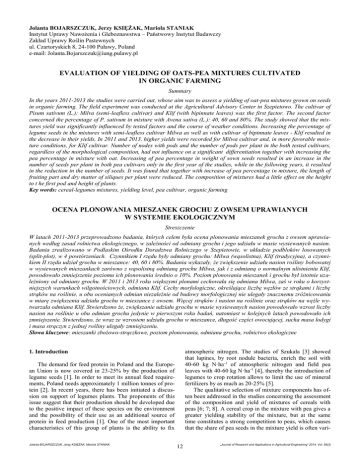 Jolanta BOJARSZCZUK, Jerzy KSIĘŻAK, Mariola STANIAK Instytut Uprawy Nawożenia i Gleboznawstwa – Państwowy Instytut Badawczy Zakład Uprawy Roślin Pastewnych ul. Czartoryskich 8, 24-100 Puławy, Poland e-mail: [email protected] EVALUATION OF YIELDING OF OATS-PEA MIXTURES CULTIVATED IN ORGANIC FARMING Summary In the years 2011-2013 the studies were carried out, whose aim was to assess a yielding of oat-pea mixtures grown on seeds in organic farming. The field experiment was conducted at the Agricultural Advisory Center in Szepietowo. The cultivar of Pisum sativum (L.): Milva (semi-leafless cultivar) and Klif (with bipinnate leaves) was the first factor. The second factor concerned the percentage of P. sativum in mixture with Avena sativa (L.): 40, 60 and 80%. The study showed that the mixtures yield was significantly influenced by tested factors and the course of weather conditions. Increasing the percentage of legume seeds in the mixtures with semi-leafless cultivar Milwa as well as with cultivar of bipinnate leaves - Klif resulted in the decrease in their yields. In 2011 and 2013, higher yields were recorded for Milwa cultivar and, in more favorable moisture conditions, for Klif cultivar. Number of nodes with pods and the number of pods per plant in the both tested cultivars, regardless of the morphological composition, had not influence on a significant differentiation together with increasing the pea percentage in mixture with oat. Increasing of pea percentage in weight of sown seeds resulted in an increase in the number of seeds per plant in both pea cultivars only in the first year of the studies, while in the following years, it resulted in the reduction in the number of seeds. It was found that together with increase of pea percentage in mixture, the length of fruiting part and dry matter of siliques per plant were reduced. The composition of mixtures had a little effect on the height to t he first pod and height of plants. Key words: cereal-legumes mixtures, yielding level, pea cultivar, organic farming OCENA PLONOWANIA MIESZANEK GROCHU Z OWSEM UPRAWIANYCH W SYSTEMIE EKOLOGICZNYM Streszczenie W latach 2011-2013 przeprowadzono badania, których celem była ocena plonowania mieszanek grochu z owsem uprawianych według zasad rolnictwa ekologicznego, w zależności od odmiany grochu i jego udziału w masie wysiewanych nasion. Badania zrealizowano w Podlaskim Ośrodku Doradztwa Rolniczego w Szepietowie, w układzie podbloków losowanych (split-plot), w 4 powtórzeniach. Czynnikiem I rzędu były odmiany grochu: Milwa (wąsolistna), Klif (tradycyjna), a czynnikiem II rzędu udział grochu w mieszance: 40, 60 i 80%. Badania wykazały, że zwiększenie udziału nasion rośliny bobowatej w wysiewanych mieszankach zarówno z wąsolistną odmianą grochu Milwa, jak i z odmianą o normalnym ulistnieniu Klif, powodowało zmniejszenie poziomu ich plonowania średnio o 10%. Poziom plonowania mieszanek i grochu był istotnie uzależniony od odmiany grochu. W 2011 i 2013 roku większymi plonami cechowała się odmiana Milwa, zaś w roku o korzystniejszych warunkach wilgotnościowych, odmiana Klif. Cechy morfologiczne, określające liczbę węzłów ze strąkami i liczbę strąków na roślinie, u obu ocenianych odmian niezależnie od budowy morfologicznej nie ulegały znacznemu zróżnicowaniu w miarę zwiększenia udziału grochu w mieszance z owsem. Więcej strąków i nasion na roślinie oraz strąków na węźle wytwarzała odmiana Klif. Stwierdzono że, zwiększanie udziału grochu w masie wysiewanych nasion powodowało wzrost liczby nasion na roślinie u obu odmian grochu jedynie w pierwszym roku badań, natomiast w kolejnych latach powodowało ich zmniejszenie. Stwierdzono, że wraz ze wzrostem udziału grochu w mieszance, długość części owocującej, sucha masa łodygi i masa strączyn z jednej rośliny ulegały zmniejszeniu. Słowa kluczowe: mieszanki zbożowo-strączkowe, poziom plonowania, odmiana grochu, rolnictwo ekologiczne atmospheric nitrogen. The studies of Szukała [3] showed that lupines, by root nodule bacteria, enrich the soil with 40-60 kg N·ha-1 of atmospheric nitrogen and field pea leaves with 40-60 kg N·ha-1 [4], thereby the introduction of legumes to crop rotation allows to limit the use of mineral fertilizers by as much as 20-25% [5]. The qualitative selection of mixture components has often been addressed in the studies concerning the assessment of the composition and yield of mixtures of cereals with peas [6; 7; 8]. A cereal crop in the mixture with pea gives a greater yielding stability of the mixture, but at the same time constitutes a strong competition to peas, which causes that the share of pea seeds in the mixture yield is often vari- 1. Introduction The demand for feed protein in Poland and the European Union is now covered in 23-25% by the production of legume seeds [1]. In order to meet its annual feed requirements, Poland needs approximately 1 million tonnes of protein [2]. In recent years, there has been initiated a discussion on support of legumes plants. The proponents of this issue suggest that their production should be developed due to the positive impact of these species on the environment and the possibility of their use as an additional source of protein in feed production [1]. One of the most important characteristics of this group of plants is the ability to fix Jolanta BOJARSZCZUK, Jerzy KSIĘŻAK, Mariola STANIAK 12 „Journal of Research and Applications in Agricultural Engineering” 2014, Vol. 59(3) able [9]. Cereal - legume mixtures play an important role in the sustainable development of agricultural production due to the low use of non-agricultural inputs, especially of mineral fertilization [10], leaving a good position for the succeeding plants [11, 12] and phytosanitary function in the individual stages of crop rotation [13, 14]. It is worth emphasizing that the cultivation of legumecereal mixtures was recognized as a good 