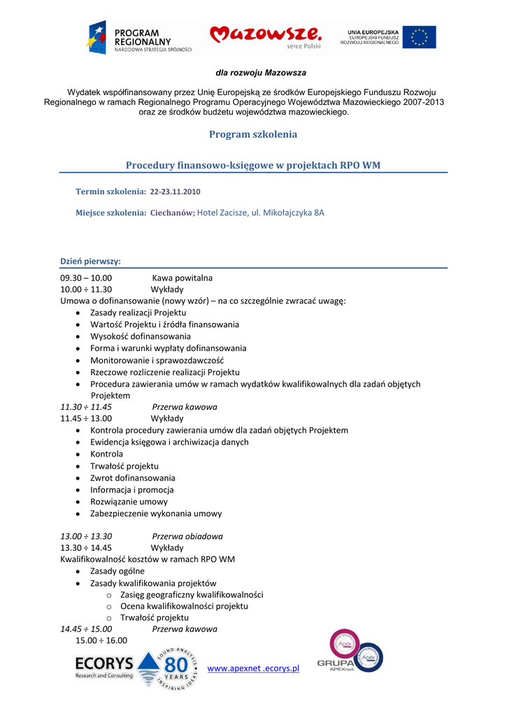 dla rozwoju Mazowsza Wydatek współfinansowany przez Unię Europejską ze środków Europejskiego Funduszu Rozwoju Regionalnego w ramach Regionalnego Programu Operacyjnego Województwa Mazowieckiego 2007-2013 oraz ze środków budżetu województwa mazowieckiego. Program szkolenia Procedury finansowo-księgowe w projektach RPO WM Termin szkolenia: 22-23.11.2010 Miejsce szkolenia: Ciechanów; Hotel Zacisze, ul. Mikołajczyka 8A Dzień pierwszy: 09.30 – 10.00 Kawa powitalna 10.00 ÷ 11.30 Wykłady Umowa o dofinansowanie (nowy wzór) – na co szczególnie zwracad uwagę: Zasady realizacji Projektu Wartośd Projektu i źródła finansowania Wysokośd dofinansowania Forma i warunki wypłaty dofinansowania Monitorowanie i sprawozdawczośd Rzeczowe rozliczenie realizacji Projektu Procedura zawierania umów w ramach wydatków kwalifikowalnych dla zadao objętych Projektem 11.30 ÷ 11.45 Przerwa kawowa 11.45 ÷ 13.00 Wykłady Kontrola procedury zawierania umów dla zadao objętych Projektem Ewidencja księgowa i archiwizacja danych Kontrola Trwałośd projektu Zwrot dofinansowania Informacja i promocja Rozwiązanie umowy Zabezpieczenie wykonania umowy 13.00 ÷ 13.30 Przerwa obiadowa 13.30 ÷ 14.45 Wykłady Kwalifikowalnośd kosztów w ramach RPO WM Zasady ogólne Zasady kwalifikowania projektów o Zasięg geograficzny kwalifikowalności o Ocena kwalifikowalności projektu o Trwałośd projektu 14.45 ÷ 15.00 Przerwa kawowa 15.00 ÷ 16.00 www.apexnet .ecorys.pl dla rozwoju Mazowsza Wydatek współfinansowany przez Unię Europejską ze środków Europejskiego Funduszu Rozwoju Regionalnego w ramach Regionalnego Programu Operacyjnego Województwa Mazowieckiego 2007-2013 oraz ze środków budżetu województwa mazowieckiego. Kwalifikowalnośd kosztów w ramach RPO WM o Zasady ogólne o Zasady kwalifikowania projektów o Zasięg geograficzny kwalifikowalności o Ocena kwalifikowalności projektu o Trwałośd projektu Dzień drugi: 09.00 ÷ 10.30 Wykłady o Zakup środków trwałych stanowiący częśd wydatków inwestycyjnych o Wydatki na zakup sprzętu będącego środkiem trwałym do użytku na czas realizacji projektu o Zakup gruntu – nieruchomości niezabudowanej o Zakup nieruchomości zabudowanej 10.30 ÷ 10.45 Przerwa kawowa 10.45 ÷ 12.00 Wykłady o Koszty zastosowania technik (ew. form) finansowania nie powodujących natychmiastowego przeniesienia prawa własności o Leasing o Inne techniki finansowania o Podatek od towarów i usług i inne podatki o Koszty ogólne o Wydatki niekwalifikowane 12.00 ÷ 12.30 Przerwa obiadowa 12.30 ÷ 13.45 Wykłady Wniosek o płatnośd: Częśd dotycząca postępu finansowego Częśd dotycząca przebiegu realizacji projektu Weryfikacja wniosku o płatnośd o Formalna o Merytoryczna o Finansowa 13.45 ÷ 14.00 Przerwa kawowa 14.00 ÷ 15.00 Wykład Opisywanie dokumentów księgowych – dobre praktyki Najczęściej popełniane błędy www.apexnet .ecorys.pl dla rozwoju Mazowsza Wydatek współfinansowany przez Unię Europejską ze środków Europejskiego Funduszu Rozwoju Regionalnego w ramach Regionalnego Programu Operacyjnego Województwa Mazowieckiego 2007-2013 oraz ze środków budżetu województwa mazowieckiego. Uczestnikom szkoleń specjalistycznych 2-dniowych bezpłatnie zapewniamy: o transport autokarowy (z dworca PKP na miejsce szkolenia i z powrotem); o wyżywienie (2x obiad, 1x kolacja,1x śniadanie oraz przerwy kawowe w trakcie szkolenia); o nocleg ; o materiały szkoleniowe; www.apexnet .ecorys.pl