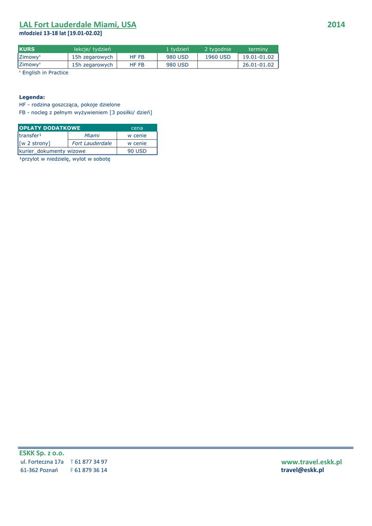 LAL Fort Lauderdale Miami, USA 2014 młodzież 13-18 lat [19.01-02.02] 1 tydzień 2 tygodnie terminy Zimowy¹ 15h zegarowych HF FB 980 USD 1960 USD 19.01-01.02 Zimowy¹ 15h zegarowych HF FB 980 USD KURS lekcje/ tydzień 26.01-01.02 ¹ English in Practice Legenda: HF - rodzina goszcząca, pokoje dzielone FB - nocleg z pełnym wyżywieniem [3 posiłki/ dzień] cena OPŁATY DODATKOWE transfer¹ [w 2 strony] Miami Fort Lauderdale kurier_dokumenty wizowe w cenie w cenie 90 USD ¹przylot w niedzielę, wylot w sobotę ESKK Sp. z o.o. ul. Forteczna 17a 61-362 Poznań T 61 877 34 97 F 61 879 36 14 www.travel.eskk.pl [email protected]