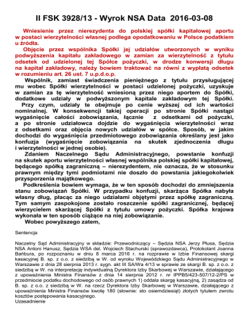 II FSK 3928/13 - Wyrok NSA Data 2016-03-08 Wniesienie przez nierezydenta do polskiej spółki kapitałowej aportu w postaci wierzytelności własnej podlega opodatkowaniu w Polsce podatkiem u źródła. Objęcie przez wspólnika Spółki jej udziałów utworzonych w wyniku podwyższenia kapitału zakładowego w zamian za wierzytelność z tytułu odsetek od udzielonej tej Spółce pożyczki, w drodze konwersji długu na kapitał zakładowy, należy bowiem traktować na równi z wypłatą odsetek w rozumieniu art. 26 ust. 7 u.p.d.o.p. Wspólnik, zamiast świadczenia pieniężnego z tytułu przysługującej mu wobec Spółki wierzytelności w postaci udzielonej pożyczki, uzyskuje w zamian za tę wierzytelność wniesioną przez niego aportem do Spółki, dodatkowe udziały w podwyższonym kapitale zakładowym tej Spółki. Przy czym, udziały te obejmuje po cenie wyższej od ich wartości nominalnej. W konsekwencji takiej operacji po stronie Spółki nastąpi wygaśnięcie całości zobowiązania, łącznie z odsetkami od pożyczki, a po stronie udziałowca dojdzie do wygaśnięcia wierzytelności wraz z odsetkami oraz objęcia nowych udziałów w spółce. Sposób, w jakim dochodzi do wygaśnięcia przedmiotowego zobowiązania określany jest jako konfuzja (wygaśnięcie zobowiązania na skutek zjednoczenia długu i wierzytelności w jednej osobie). Zdaniem Naczelnego Sądu Administracyjnego, powstanie konfuzji na skutek aportu wierzytelności własnej wspólnika polskiej spółki kapitałowej, będącego spółką zagraniczną – nierezydentem, nie oznacza, że w stosunku prawnym między tymi podmiotami nie doszło do powstania jakiegokolwiek przysporzenia majątkowego. Podkreślenia bowiem wymaga, że w ten sposób dochodzi do zmniejszenia stanu zobowiązań Spółki. W przypadku konfuzji, skarżąca Spółka nabyła własny dług, płacąc za niego udziałami objętymi przez spółkę zagraniczną. Tym samym zaspokojone zostało roszczenie spółki zagranicznej, będącej wierzycielem skarżącej Spółki z tytułu umowy pożyczki. Spółka krajowa wykonała w ten sposób ciążące na niej zobowiązanie. Wobec powyższego zatem, Sentencja Naczelny Sąd Administracyjny w składzie: Przewodniczący – Sędzia NSA Jerzy Płusa, Sędzia NSA Antoni Hanusz, Sędzia WSA del. Wojciech Stachurski (sprawozdawca), Protokolant Joanna Bańbura, po rozpoznaniu w dniu 8 marca 2016 r. na rozprawie w Izbie Finansowej skargi kasacyjnej B. sp. z o.o. z siedzibą w W. od wyroku Wojewódzkiego Sądu Administracyjnego w Warszawie z dnia 28 sierpnia 2013 r. sygn. akt III SA/Wa 4/13 w sprawie ze skargi B. sp. z o.o. z siedzibą w W. na interpretację indywidualną Dyrektora Izby Skarbowej w Warszawie, działającego z upoważnienia Ministra Finansów z dnia 14 sierpnia 2012 r. nr IPPB5/423-507/12-2/PS w przedmiocie podatku dochodowego od osób prawnych 1) oddala skargę kasacyjną, 2) zasądza od B. sp. z o.o. z siedzibą w W. na rzecz Dyrektora Izby Skarbowej w Warszawie, działającego z upoważnienia Ministra Finansów kwotę 180 (słownie: sto osiemdziesiąt) złotych tytułem zwrotu kosztów postępowania kasacyjnego. Uzasadnienie 2 1. Wyrok Sądu I instancji. Wyrokiem z dnia 28 sierpnia 2013 r. sygn. III SA/Wa 4/13, Wojewódzki Sąd Administracyjny w Warszawie, oddalił skargę B. sp. z o.o. z siedzibą w W. (dalej również jako "Spółka", "Skarżąca") na interpretację indywidualną Ministra Finansów z dnia 14 sierpnia 2012 r. nr IPPB5/423-507/12-2/PS w przedmiocie podatku dochodowego od osób prawnych. 2. Przedstawiony przez Sąd I instancji przebieg postępowania. 2.1. Wnioskiem z dnia 25 czerwca 2012 r. Spółka zwróciła się do Ministra Finansów o udzielenie pisemnej interpretacji przepisów prawa podatkowego w indywidualnej sprawie dotyczącej podatku dochodowego od osób prawnych. W przedmiotowym wniosku wskazała, że posiada zadłużenie z tytuły pożyczek (głównie w walucie obcej wraz z należnymi odsetkami), udzielonych przez jedynego wspólnika – spółkę P. [...] S.a.r.l. z siedzibą w Luksemburgu. Wspólnik spółki jest rezydentem podatkowym w Luksemburgu i podlega tam opodatkowaniu od całości swych dochodów, bez względu na miejsce ich osiągania. Skarżąca zaznaczyła, iż w dniu 26 stycznia 2012 r. odbyło się zgromadzenie jej wspólników, podczas którego został podwyższony kapitał zakładowy poprzez wniesienie na kapitał wierzytelności wspólnika z tytułu jednej z niezwróconych pożyczek wraz z odsetkami. Nowo utworzone udziały w podwyższonym kapitale zakładowym zostały pokryte wkładem niepieniężnym w postaci ww. wierzytelności. Jednocześnie udziały zostały objęte przez wspólnika po cenie wyższej od ich wartości nominalnej. Zgodnie z uchwałą o podwyższeniu kapitału zakładowego, nadwyżka ponad wartość nominalną udziałów (tzw. agio) została przekazana na kapitał zapasowy Spółki. W konsekwencji wniesienia wierzytelności jako wkładu niepieniężnego na pokrycie kapitału zakładowego, po stronie Skarżącej nastąpiło podwyższenie kapitału zakładowego i wygasł w całości dług z tytułu wierzytelności na skutek konfuzji. Po stronie wspólnika nastąpiło podwyższenie ilości posiadanych udziałów oraz wygaśnięcie wierzytelności. Skarżąca wyjaśniła, że w przyszłości nie wyklucza ponownie podwyższenia kapitału zakładowego przez konwersję długu spółki z tytułu innych pożyczek zaciągniętych od wspólnika na kapitał spółki w formie wkładu niepieniężnego. W związku z powyższym sformułowane zostało pytanie, czy w związku z wniesieniem wkładu niepieniężnego w postaci wierzytelności (w tym odsetek) na pokrycie podwyższonego kapitału Skarżącej, powstał u niej obowiązek pobrania zryczałtowanego podatku dochodowego od osób prawnych (podatku u źródła). Na zadane pytanie Spółka odpowiedziała przecząco. Jej zdaniem w przypadku konwersji wierzytelności, w tym odsetek od pożyczki ud
