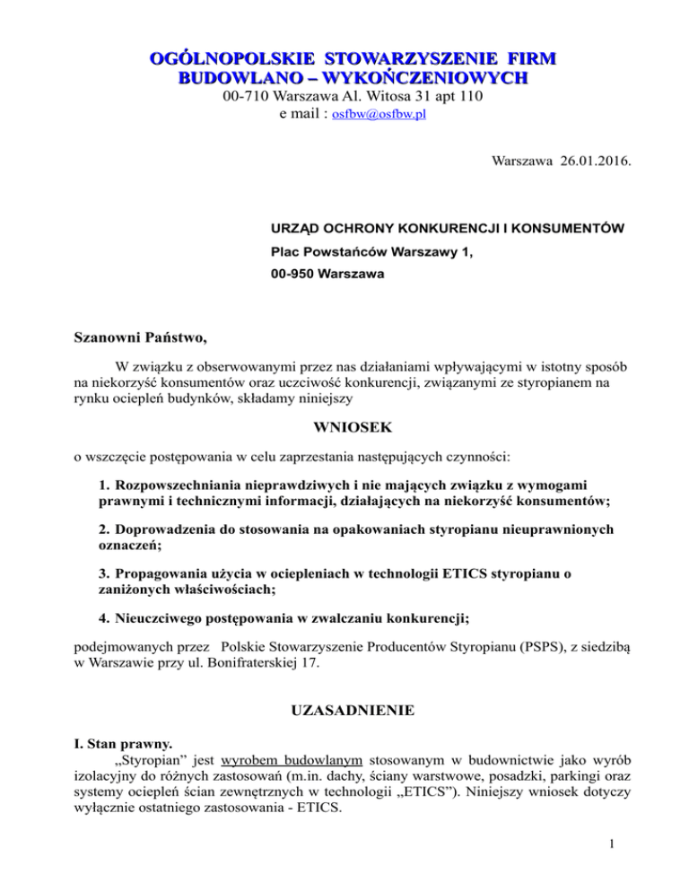 OGÓLNOPOLSKIE STOWARZYSZENIE FIRM BUDOWLANO – WYKOŃCZENIOWYCH 00-710 Warszawa Al. Witosa 31 apt 110 e mail : [email protected] Warszawa 26.01.2016. URZĄD OCHRONY KONKURENCJI I KONSUMENTÓW Plac Powstańców Warszawy 1, 00-950 Warszawa Szanowni Państwo, W związku z obserwowanymi przez nas działaniami wpływającymi w istotny sposób na niekorzyść konsumentów oraz uczciwość konkurencji, związanymi ze styropianem na rynku ociepleń budynków, składamy niniejszy WNIOSEK o wszczęcie postępowania w celu zaprzestania następujących czynności: 1. Rozpowszechniania nieprawdziwych i nie mających związku z wymogami prawnymi i technicznymi informacji, działających na niekorzyść konsumentów; 2. Doprowadzenia do stosowania na opakowaniach styropianu nieuprawnionych oznaczeń; 3. Propagowania użycia w ociepleniach w technologii ETICS styropianu o zaniżonych właściwościach; 4. Nieuczciwego postępowania w zwalczaniu konkurencji; podejmowanych przez Polskie Stowarzyszenie Producentów Styropianu (PSPS), z siedzibą w Warszawie przy ul. Bonifraterskiej 17. UZASADNIENIE I. Stan prawny. „Styropian” jest wyrobem budowlanym stosowanym w budownictwie jako wyrób izolacyjny do różnych zastosowań (m.in. dachy, ściany warstwowe, posadzki, parkingi oraz systemy ociepleń ścian zewnętrznych w technologii „ETICS”). Niniejszy wniosek dotyczy wyłącznie ostatniego zastosowania - ETICS. 1 „Ocieplenie w technologii ETICS” jest wyrobem budowlanym będącym zestawem materiałów. W jego skład wchodzą: izolacja termiczna (najczęściej styropian lub wełna mineralna), grunty, kleje, masy szpachlowe, siatki, łączniki mechaniczne, tynki, farby oraz inne elementy uzupełniające. Zgodnie z obowiązującym prawem wyrażonym m.in. w stanowisku Głównego Inspektora Nadzoru Budowlanego z dnia 23.05.2014, opublikowanym na stronie Głównego Urzędu Nadzoru Budowlanego w dniu 2.06.2014, cyt.: „… przy wprowadzeniu do obrotu wyrobu budowlanego będącego zestawem nie bierze się pod uwagę tego, czy poszczególne składniki wyrobu budowlanego (które mogą stanowić samodzielny wyrób budowlany) zostały wprowadzone do obrotu lub jakiego systemu użyto do ich wprowadzenia. Zestaw stanowi bowiem odrębny wyrób budowlany i podlega jako całość procesowi wprowadzenia do obrotu, nawet jeżeli w jego skład wchodzą inne wyroby budowlane.” Jak wynika z powyższego, to producent lub inny gwarant wprowadzający wyrób budowlany będący zestawem ETICS na rynek jest odpowiedzialny za wszystkie jego składniki (elementy zestawu). Badając laboratoryjnie w zestawie np. styropian o danych parametrach, stanowi o jego przeznaczeniu do konkretnego zastosowania. To producent-gwarant systemu ETICS dokonuje oceny zgodności wprowadzanego jako zestaw wyrobu budowlanego z dokumentem odniesienia, wystawiając dla niego deklarację właściwości użytkowych (w odniesieniu do normy lub europejskiej aprobaty technicznej) lub deklarację zgodności w odniesieniu do krajowej aprobaty technicznej. To system kontroli jakości wyrobu budowlanego u producenta-gwaranta podlega ocenie i kontroli (dla zestawów ETICS systemem oceny zgodności „2+”, zawierającym m.in. zewnętrzną certyfikację zakładowej kontroli produkcji). II. Stan rzeczywisty. Europejskie aprobaty techniczne prawidłowo wymieniają składniki zestawów ETICS, m.in. umieszczając wśród nich izolację termiczną (np. styropian) o precyzyjnie opisanych wymaganych właściwościach nie związanych z gęstością materiału. Dzięki temu możliwy jest ich jednoznaczny dobór i wzajemne połączenie w myśl przepisów art. 2 pkt. 2 Rozporządzenia Komisji Europejskiej i Rady UE Nr 305/2011 [1]. Niestety, skompletowanie zestawu w oparciu o krajowe aprobaty techniczne, wydawane przez Instytut Techniki Budowlanej na „Zestawy materiałów do wykonywania ociepleń ścian zewnętrznych ETICS”, nie we wszystkich przypadkach było i jest oczywiste i jednoznaczne. Pierwotnie większość aprobat nie obejmowała wszystkich składników zestawu, ograniczając je do chemii budowlanej (kleje, tynki, grunt) z pominięciem podstawowego materiału zestawu, tj. izolacji termicznej (styropianu lub wełny mineralnej), a niekiedy również siatki zbrojącej oraz łączników mechanicznych. Aprobaty na kompletne zestawy były wydawane sporadycznie, na wyraźne życzenie co bardziej świadomych zleceniodawców, a wymagania odnośnie właściwości styropianu mówiły o jego minimalnej gęstości pozornej, typie FS 15, bądź odwoływały się do parametrów z aprobat zagranicznych. W efekcie procesu porządkowania wprowadzona została norma PN-B-20130:1999 określająca minimalną gęstość FS 15 na, cyt.: „… nie mniej niż … 15,0 kg/m³” [2]. Została ona zastąpiona normą PN-B-20132:2004 (obecnie obie są już wycofane), która przypisywała poszczególnym zastosowaniom styropianu wymagane parametry. Dla ociepleń ścian zewnętrznych przewidywała styropiany o oznaczeniach EPS 70-040 FASADA i EPS 80-036 FASADA, o gęstościach odpowiednio, cyt.: 2 „15,0 -10%*** … 18,0 -10%*** … kg/m³. ***Wartość poza wymaganiami, podana informacyjnie.” [3] Dopiero w bliskiej perspektywie wprowadzenia ww. Rozporządzenia Nr 305/2011 [1] styropian został powszechnie wprowadzony do krajowych aprobat technicznych. Przeważnie jednak nadal nie jest on wymieniany w składzie zestawu, lecz jako materiał który cyt.: „… powinien być stosowany.” Właściwości tak przywołanego styropianu opisywane są kodami wg PN-EN 13163 i nie są wiązane z jego gęstością. Reasumując – początkowe zaniedbania skutkują do dziś bałaganem polegającym na znacznej dowolności w doborze styropianu. Brak kontroli i skutecznego nadzoru nad tym zjawiskiem powoduje, że na ściany w efekcie pogoni za coraz niższą ceną trafia coraz gorszy wyrób. Sprzyja temu rzeczywisty lub udawany brak wiedzy u projektantów i kierowników budów, jedynych osób odp