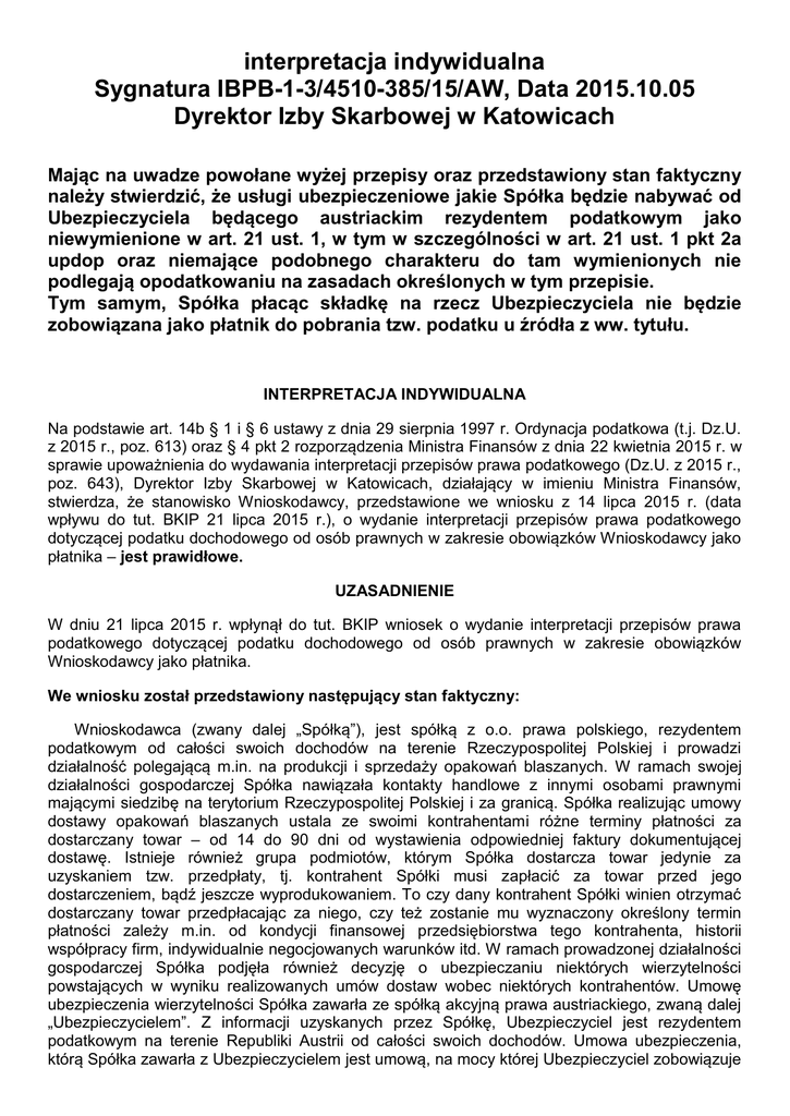 interpretacja indywidualna Sygnatura IBPB-1-3/4510-385/15/AW, Data 2015.10.05 Dyrektor Izby Skarbowej w Katowicach Mając na uwadze powołane wyżej przepisy oraz przedstawiony stan faktyczny należy stwierdzić, że usługi ubezpieczeniowe jakie Spółka będzie nabywać od Ubezpieczyciela będącego austriackim rezydentem podatkowym jako niewymienione w art. 21 ust. 1, w tym w szczególności w art. 21 ust. 1 pkt 2a updop oraz niemające podobnego charakteru do tam wymienionych nie podlegają opodatkowaniu na zasadach określonych w tym przepisie. Tym samym, Spółka płacąc składkę na rzecz Ubezpieczyciela nie będzie zobowiązana jako płatnik do pobrania tzw. podatku u źródła z ww. tytułu. INTERPRETACJA INDYWIDUALNA Na podstawie art. 14b § 1 i § 6 ustawy z dnia 29 sierpnia 1997 r. Ordynacja podatkowa (t.j. Dz.U. z 2015 r., poz. 613) oraz § 4 pkt 2 rozporządzenia Ministra Finansów z dnia 22 kwietnia 2015 r. w sprawie upoważnienia do wydawania interpretacji przepisów prawa podatkowego (Dz.U. z 2015 r., poz. 643), Dyrektor Izby Skarbowej w Katowicach, działający w imieniu Ministra Finansów, stwierdza, że stanowisko Wnioskodawcy, przedstawione we wniosku z 14 lipca 2015 r. (data wpływu do tut. BKIP 21 lipca 2015 r.), o wydanie interpretacji przepisów prawa podatkowego dotyczącej podatku dochodowego od osób prawnych w zakresie obowiązków Wnioskodawcy jako płatnika – jest prawidłowe. UZASADNIENIE W dniu 21 lipca 2015 r. wpłynął do tut. BKIP wniosek o wydanie interpretacji przepisów prawa podatkowego dotyczącej podatku dochodowego od osób prawnych w zakresie obowiązków Wnioskodawcy jako płatnika. We wniosku został przedstawiony następujący stan faktyczny: Wnioskodawca (zwany dalej „Spółką”), jest spółką z o.o. prawa polskiego, rezydentem podatkowym od całości swoich dochodów na terenie Rzeczypospolitej Polskiej i prowadzi działalność polegającą m.in. na produkcji i sprzedaży opakowań blaszanych. W ramach swojej działalności gospodarczej Spółka nawiązała kontakty handlowe z innymi osobami prawnymi mającymi siedzibę na terytorium Rzeczypospolitej Polskiej i za granicą. Spółka realizując umowy dostawy opakowań blaszanych ustala ze swoimi kontrahentami różne terminy płatności za dostarczany towar – od 14 do 90 dni od wystawienia odpowiedniej faktury dokumentującej dostawę. Istnieje również grupa podmiotów, którym Spółka dostarcza towar jedynie za uzyskaniem tzw. przedpłaty, tj. kontrahent Spółki musi zapłacić za towar przed jego dostarczeniem, bądź jeszcze wyprodukowaniem. To czy dany kontrahent Spółki winien otrzymać dostarczany towar przedpłacając za niego, czy też zostanie mu wyznaczony określony termin płatności zależy m.in. od kondycji finansowej przedsiębiorstwa tego kontrahenta, historii współpracy firm, indywidualnie negocjowanych warunków itd. W ramach prowadzonej działalności gospodarczej Spółka podjęła również decyzję o ubezpieczaniu niektórych wierzytelności powstających w wyniku realizowanych umów dostaw wobec niektórych kontrahentów. Umowę ubezpieczenia wierzytelności Spółka zawarła ze spółką akcyjną prawa austriackiego, zwaną dalej „Ubezpieczycielem”. Z informacji uzyskanych przez Spółkę, Ubezpieczyciel jest rezydentem podatkowym na terenie Republiki Austrii od całości swoich dochodów. Umowa ubezpieczenia, którą Spółka zawarła z Ubezpieczycielem jest umową, na mocy której Ubezpieczyciel zobowiązuje 2 się, w zakresie działalności swego przedsiębiorstwa, spełnić na rzecz Spółki określone świadczenie (wypłata odszkodowania) w razie zajścia przewidzianego w tej umowie wypadku (tj. brak zapłaty przez określonego kontrahenta Spółki jego zobowiązania do Spółki wynikającego z zawartej przez niego z Spółką umowy dostawy), a Spółka zobowiązuje się zapłacić do Ubezpieczyciela składkę. Na mocy przedmiotowej umowy ubezpieczenia upoważniony pracownik Spółki, otrzymał kod dostępu (login/hasło) do internetowej strony Ubezpieczyciela. Za pośrednictwem tej strony ubezpieczeniowej pracownik Spółki zgłasza Ubezpieczycielowi zamiar objęcia ubezpieczeniem przyszłych wierzytelności Spółki do danego kontrahenta oraz wskazuje górną granicę ubezpieczenia. Ubezpieczyciel weryfikuje i ocenia na własny użytek stan ekonomiczny tego kontrahenta oraz ryzyko związane z ubezpieczaniem wierzytelności w stosunku do niego. Ubezpieczyciel za pośrednictwem tej samej strony internetowej dostarcza do Spółki informację, czy ostatecznie zgadza się objąć ubezpieczeniem wierzytelności Spółki do danego kontrahenta i jeśli tak, to do jakiej sumy najwyższej ubezpieczenia. Ubezpieczyciel poza informacją, czy zgadza się objąć ubezpieczeniem wierzytelności do danego kontrahenta i do jakiej kwoty, nie dostarcza do Spółki żadnej innej informacji dotyczącej tego kontrahenta, w szczególności nie dostarcza do Spółki żadnych informacji dot. sytuacji finansowej, ekonomicznej, podatkowej podmiotu, odnośnie którego podejmuje określoną decyzję ubezpieczeniową. Innymi słowy, Spółka na podstawie zawartej z Ubezpieczycielem umowy ubezpieczenia wierzytelności nie uzyskuje od tego Ubezpieczyciela żadnych informacji co do skali ryzyka biznesowego związanego z danym kontrahentem, ani żadnych innych informacji, które mógłby w jakikolwiek sposób wykorzystać przy prowadzonej przez siebie działalności gospodarczej. Wysokość składki ubezpieczeniowej jest stała i określona odrębnie dla podmiotów pochodzących z krajów należących do dwóch różnych kategorii. Kategoria I obejmuje kraje o zwiększonym ryzyku biznesowym, Kategoria II obejmuje kraje o zmniejszonym ryzyku biznesowym. Wysokość składki ubezpieczeniowej jest stała i w przypadku ubezpieczenia wierzytelności wobec podmiotów mających siedzibę, bądź miejsce zamieszkania w krajach zaliczonych do Kategorii I wynosi 0,69% wartości w