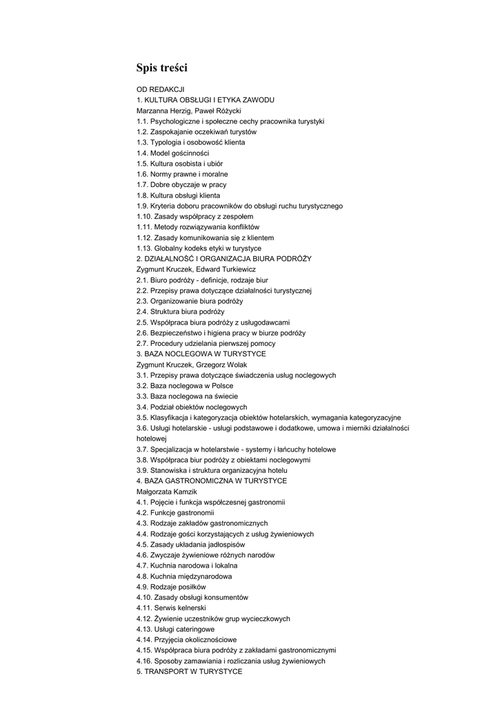 Spis treści OD REDAKCJI 1. KULTURA OBSŁUGI I ETYKA ZAWODU Marzanna Herzig, Paweł Różycki 1.1. Psychologiczne i społeczne cechy pracownika turystyki 1.2. Zaspokajanie oczekiwań turystów 1.3. Typologia i osobowość klienta 1.4. Model gościnności 1.5. Kultura osobista i ubiór 1.6. Normy prawne i moralne 1.7. Dobre obyczaje w pracy 1.8. Kultura obsługi klienta 1.9. Kryteria doboru pracowników do obsługi ruchu turystycznego 1.10. Zasady współpracy z zespołem 1.11. Metody rozwiązywania konfliktów 1.12. Zasady komunikowania się z klientem 1.13. Globalny kodeks etyki w turystyce 2. DZIAŁALNOŚĆ I ORGANIZACJA BIURA PODRÓŻY Zygmunt Kruczek, Edward Turkiewicz 2.1. Biuro podróży - definicje, rodzaje biur 2.2. Przepisy prawa dotyczące działalności turystycznej 2.3. Organizowanie biura podróży 2.4. Struktura biura podróży 2.5. Współpraca biura podróży z usługodawcami 2.6. Bezpieczeństwo i higiena pracy w biurze podróży 2.7. Procedury udzielania pierwszej pomocy 3. BAZA NOCLEGOWA W TURYSTYCE Zygmunt Kruczek, Grzegorz Wolak 3.1. Przepisy prawa dotyczące świadczenia usług noclegowych 3.2. Baza noclegowa w Polsce 3.3. Baza noclegowa na świecie 3.4. Podział obiektów noclegowych 3.5. Klasyfikacja i kategoryzacja obiektów hotelarskich, wymagania kategoryzacyjne 3.6. Usługi hotelarskie - usługi podstawowe i dodatkowe, umowa i mierniki działalności hotelowej 3.7. Specjalizacja w hotelarstwie - systemy i łańcuchy hotelowe 3.8. Współpraca biur podróży z obiektami noclegowymi 3.9. Stanowiska i struktura organizacyjna hotelu 4. BAZA GASTRONOMICZNA W TURYSTYCE Małgorzata Kamzik 4.1. Pojęcie i funkcja współczesnej gastronomii 4.2. Funkcje gastronomii 4.3. Rodzaje zakładów gastronomicznych 4.4. Rodzaje gości korzystających z usług żywieniowych 4.5. Zasady układania jadłospisów 4.6. Zwyczaje żywieniowe różnych narodów 4.7. Kuchnia narodowa i lokalna 4.8. Kuchnia międzynarodowa 4.9. Rodzaje posiłków 4.10. Zasady obsługi konsumentów 4.11. Serwis kelnerski 4.12. Żywienie uczestników grup wycieczkowych 4.13. Usługi cateringowe 4.14. Przyjęcia okolicznościowe 4.15. Współpraca biura podróży z zakładami gastronomicznymi 4.16. Sposoby zamawiania i rozliczania usług żywieniowych 5. TRANSPORT W TURYSTYCE Zygmunt Kruczek, Edward Turkiewicz 5.1. Transport drogowy 5.2. Transport lotniczy 5.3. Transport kolejowy 5.4. Transport morski (promy) 5.5. Transport wodny śródlądowy 6. PRZEWODNICTWO TURYSTYCZNE Zygmunt Kruczek 6.1. Przepisy prawa dotyczące przewodnictwa turystycznego 6.2. Zadania przewodnika 6.3. Sylwetka zawodowa przewodnika turystycznego 6.4. Cechy i umiejętności przewodnika 6.5. Prawa i obowiązki przewodnika 6.6. Zasady szkolenia przewodników 6.7. Metodyka pracy przewodnika turystycznego 6.8. Przepisy bezpieczeństwa i higieny pracy związane z przewodnictwem turystycznym 7. PILOTAŻ WYCIECZEK Zygmunt Kruczek, Paweł Różycki 7.1. Przepisy prawa dotyczące pilotażu wycieczek, definicje pilota wycieczek i pilotażu 7.2. Cechy osobowości i umiejętności pilota 7.3. Zasady nabywania uprawnień pilota wycieczek, system szkolenia 7.4. Prawa i obowiązki pilota wycieczek 7.5. Formy zatrudniania pilotów 7.6. Formy pracy pilota 7.7. Sytuacje nadzwyczajne w pracy pilota wycieczek 7.8. Odpowiedzialność pilota wycieczek 7.9. Praca z grupą turystyczną, charakterystyka turystów 8. UBEZPIECZENIA TURYSTYCZNE Jerzy Raciborski 8.1. Przepisy prawa dotyczące ubezpieczeń w turystyce 8.2. Rodzaje ubezpieczeń turystycznych 8.3. Działalność biur podróży a pośrednictwo ubezpieczeniowe 9. UMOWY W TURYSTYCE Jerzy Raciborski 9.1. Pojecie umowy 9.2. Zawieranie umów 9.3. Rodzaje umów 9.4. Odpowiedzialność biur podróży za niewykonanie lub nienależyte wykonanie umów z 9.5. Elementy międzynarodowe w stosunkach cywilnoprawnych w dziedzinie turystyki 9.6. Metody rozwiązywania sporów na tle wykonania umowy 10. ORGANIZACJA IMPREZ TURYSTYCZNYCH Zygmunt Kruczek, Edward Turkiewicz 10.1. Produkt turystyczny - cechy i struktura 10.2. Metodyka i technika programowania imprez turystycznych 10.3. Bezpieczeństwo uczestników imprez turystycznych 10.4. Kalkulacja imprezy 10.5. Zamawianie świadczeń turystycznych, formy zamawiania usług 10.6. Sprzedaż produktów turystycznych 10.7. Promocja sprzedaży produktów turystycznych i jej narzędzia 10.8. Rozliczanie kosztów imprez turystycznych 10.9. Dokumenty akwizycyjne 11. OBSŁUGA PODRÓŻNICZA Marzenna Dutkiewicz-Kruczek, Zygmunt Kruczek, Leszek Mazanek, Krzysztof Sondel, Edward Turkiewicz 11.1. Paszporty i dowody osobiste 11.2. Kodeks Graniczny Sehengen 11.3. Przepisy wizowe 11.4. Przepisy celne, 11.5. Przepisy dewizowe, 11.6. Dokumenty komunikacyjne 11.7. Dokumenty finansowe 11.8. Przejścia graniczne w ruchu pasażerskim: drogowe, powietrzne, morskie. Odprawa pasażerów na przejściach granicznych 11.9. Obyczaje różnych narodów, zachowanie w miejscach kultu religijnego, mowa niewerbalna, ubiór, sposób bycia SŁOWNIK TERMINÓW UŻYWANYCH W BRANŻY TURYSTYCZNEJ ANEKS Zygmunt Kruczek, Edward Turkiewicz Arkusz egzaminacyjny (przykładowe fragmenty) Tabela frankfurcka Przykładowy certyfikat ubezpieczenia biura podróży LITERATURA UZUPEŁNIAJĄCA ISBN: 978-83-60789-25-4