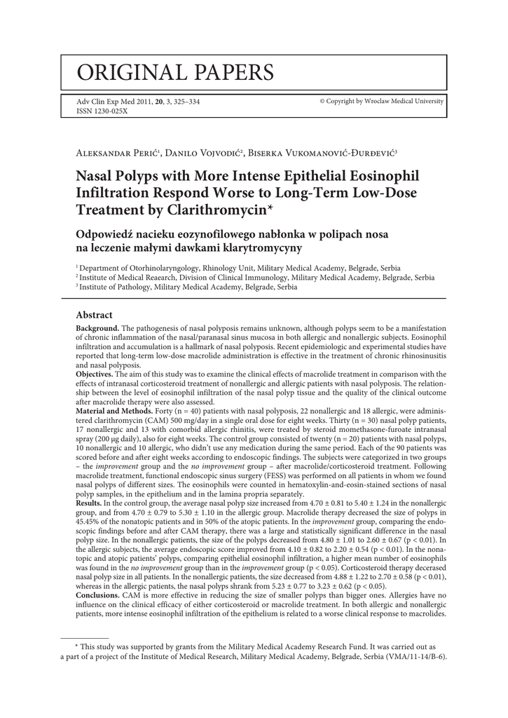 original papers Adv Clin Exp Med 2011, 20, 3, 325–334 ISSN 1230-025X © Copyright by Wroclaw Medical University Aleksandar Perić1, Danilo Vojvodić2, Biserka Vukomanović-Đurđević3 Nasal Polyps with More Intense Epithelial Eosinophil Infiltration Respond Worse to Long-Term Low-Dose Treatment by Clarithromycin* Odpowiedź nacieku eozynofilowego nabłonka w polipach nosa na leczenie małymi dawkami klarytromycyny Department of Otorhinolaryngology, Rhinology Unit, Military Medical Academy, Belgrade, Serbia Institute of Medical Reaearch, Division of Clinical Immunology, Military Medical Academy, Belgrade, Serbia 3 Institute of Pathology, Military Medical Academy, Belgrade, Serbia 1 2 Abstract Background. The pathogenesis of nasal polyposis remains unknown, although polyps seem to be a manifestation of chronic inflammation of the nasal/paranasal sinus mucosa in both allergic and nonallergic subjects. Eosinophil infiltration and accumulation is a hallmark of nasal polyposis. Recent epidemiologic and experimental studies have reported that long-term low-dose macrolide administration is effective in the treatment of chronic rhinosinusitis and nasal polyposis. Objectives. The aim of this study was to examine the clinical effects of macrolide treatment in comparison with the effects of intranasal corticosteroid treatment of nonallergic and allergic patients with nasal polyposis. The relationship between the level of eosinophil infiltration of the nasal polyp tissue and the quality of the clinical outcome after macrolide therapy were also assessed. Material and Methods. Forty (n = 40) patients with nasal polyposis, 22 nonallergic and 18 allergic, were administered clarithromycin (CAM) 500 mg/day in a single oral dose for eight weeks. Thirty (n = 30) nasal polyp patients, 17 nonallergic and 13 with comorbid allergic rhinitis, were treated by steroid momethasone-furoate intranasal spray (200 µg daily), also for eight weeks. The control group consisted of twenty (n = 20) patients with nasal polyps, 10 nonallergic and 10 allergic, who didn’t use any medication during the same period. Each of the 90 patients was scored before and after eight weeks according to endoscopic findings. The subjects were categorized in two groups – the improvement group and the no improvement group – after macrolide/corticosteroid treatment. Following macrolide treatment, functional endoscopic sinus surgery (FESS) was performed on all patients in whom we found nasal polyps of different sizes. The eosinophils were counted in hematoxylin-and-eosin-stained sections of nasal polyp samples, in the epithelium and in the lamina propria separately. Results. In the control group, the average nasal polyp size increased from 4.70 ± 0.81 to 5.40 ± 1.24 in the nonallergic group, and from 4.70 ± 0.79 to 5.30 ± 1.10 in the allergic group. Macrolide therapy decreased the size of polyps in 45.45% of the nonatopic patients and in 50% of the atopic patients. In the improvement group, comparing the endoscopic findings before and after CAM therapy, there was a large and statistically significant difference in the nasal polyp size. In the nonallergic patients, the size of the polyps decreased from 4.80 ± 1.01 to 2.60 ± 0.67 (p < 0.01). In the allergic subjects, the average endoscopic score improved from 4.10 ± 0.82 to 2.20 ± 0.54 (p < 0.01). In the nonatopic and atopic patients’ polyps, comparing epithelial eosinophil infiltration, a higher mean number of eosinophils was found in the no improvement group than in the improvement group (p < 0.05). Corticosteroid therapy decerased nasal polyp size in all patients. In the nonallergic patients, the size decreased from 4.88 ± 1.22 to 2.70 ± 0.58 (p < 0.01), whereas in the allergic patients, the nasal polyps shrank from 5.23 ± 0.77 to 3.23 ± 0.62 (p < 0.05). Conclusions. CAM is more effective in reducing the size of smaller polyps than bigger ones. Allergies have no influence on the clinical efficacy of either corticosteroid or macrolide treatment. In both allergic and nonallergic patients, more intense eosinophil infiltration of the epithelium is related to a worse clinical response to macrolides. * This study was supported by grants from the Military Medical Academy Research Fund. It was carried out as a part of a project of the Institute of Medical Research, Military Medical Academy, Belgrade, Serbia (VMA/11-14/B-6). 326 A. Perić, D. Vojvodić, B. Vukomanović-Đurđević Intranasal steroid treatment is more effective in shrinking nasal polyps than macrolide treatment (Adv Clin Exp Med 2011, 20, 3, 325–334). Key words: nasal polyposis, allergy, eosinophils, epithelium, clarithromycin. Streszczenie Wprowadzenie. Patogeneza polipów nosa pozostaje nieznana, choć wydają się objawem przewlekłego zapalenia nosa lub zatok przynosowych błony śluzowej u pacjentów z alergią i bez niej. Naciek eozynofilów i ich akumulacja jest cechą polipów nosa. Ostatnie badania epidemiologiczne i doświadczalne pokazują, że długoterminowe podawanie makrolidów w małej dawce jest skuteczne w leczeniu przewlekłego zapalenia zatok przynosowych i polipów nosa. Cel pracy. Ocena wyników klinicznych leczenia makrolidami w porównaniu z wynikami leczenia kortykosteroidami donosowo polipów nosa u pacjentów z alergią i bez niej. Oceniono także zależność między stopniem nacieku eozynofilów tkanki polipów nosa a wynikami klinicznymi po leczeniu makrolidami. Materiał i metody. Czterdziestu pacjentom (n = 40) z polipami nosa, 22 bez alergii i 18 z alergią podawano klarytromycynę (CAM) 500 mg/dobę w jednej dawce przez 8 tygodni. Trzydziestu (n = 30) chorych na polipy nosa, 17 bez alergii i 13 z alergią i współistniejącym alergicznym nieżytem nosa było leczonych steroidem furanianem mometazonu w aerozolu do nosa (200 mg na dobę) także przez 8 tygodni. Grupa kontrolna składała się z 20 (n = 20) chorych z polipami nosa, 10 z alergią i 10 bez niej, którzy nie stosowali 