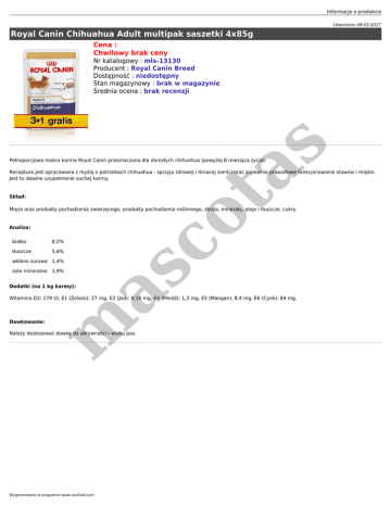 Informacje o produkcie Utworzono 08-03-2017 Royal Canin Chihuahua Adult multipak saszetki 4x85g Cena : Chwilowy brak ceny s Nr katalogowy : mls-13130 Producent : Royal Canin Breed Dostępność : niedostępny Stan magazynowy : brak w magazynie Średnia ocena : brak recenzji co ta Pełnoporcjowa mokra karma Royal Canin przeznaczona dla dorosłych chihuahua (powyżej 8 miesiąca życia). Receptura jest opracowana z myślą o potrzebach chihuahua - sprzyja zdrowej i lśniacej sierści oraz zapewnia prawidłowe funkcjonowanie stawów i mięśni. Jest to idealne uzupełnienie suchej karmy. Skład: Mięso oraz produkty pochodzenia zwierzęcego, produkty pochodzenia roślinnego, zboża, minerały, oleje i tłuszcze, cukry. Analiza: białko 8,5% tłuszcze 5,6% m as włókno surowe 1,4% sole mineralne 1,9% Dodatki (na 1 kg karmy): Witamina D3: 179 UI, E1 (Żelazo): 27 mg, E2 (Jod): 0,16 mg, E4 (Miedź): 1,3 mg, E5 (Mangan): 8,4 mg, E6 (Cynk): 84 mg. Dawkowanie: Należy dostosować dawkę do aktywności i wieku psa. Wygenerowano w programie www.oscGold.com