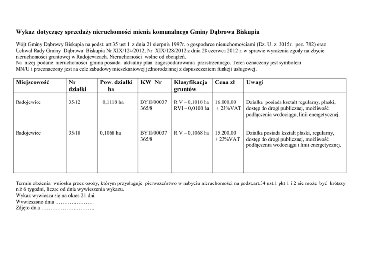 Wykaz dotyczący sprzedaży nieruchomości mienia komunalnego Gminy Dąbrowa Biskupia Wójt Gminy Dąbrowy Biskupia na podst. art.35 ust 1 z dnia 21 sierpnia 1997r. o gospodarce nieruchomościami (Dz. U. z 2015r. poz. 782) oraz Uchwał Rady Gminy Dąbrowa Biskupia Nr XIX/124/2012, Nr XIX/128/2012 z dnia 28 czerwca 2012 r. w sprawie wyrażenia zgody na zbycie nieruchomości gruntowej w Radojewicach. Nieruchomości wolne od obciążeń. Na niżej podane nieruchomości gmina posiada `aktualny plan zagospodarowania przestrzennego. Teren oznaczony jest symbolem MN/U i przeznaczony jest na cele zabudowy mieszkaniowej jednorodzinnej z dopuszczeniem funkcji usługowej. Miejscowość Nr działki Radojewice 35/12 Radojewice 35/18 Pow. działki ha 0,1118 ha 0,1068 ha KW Nr Klasyfikacja gruntów Cena zł BY1I/00037 365/8 R V – 0,1018 ha RVI – 0,0100 ha 16.000,00 Działka posiada kształt regularny, płaski, + 23%VAT dostęp do drogi publicznej, możliwość podłączenia wodociągu, linii energetycznej. BY1I/00037 365/8 R V – 0,1068 ha 15.200,00 + 23%VAT Uwagi Działka posiada kształt płaski, regularny, dostęp do drogi publicznej, możliwość podłączenia wodociągu i linii energetycznej. Termin złożenia wniosku przez osoby, którym przysługuje pierwszeństwo w nabyciu nieruchomości na podst.art.34 ust.1 pkt 1 i 2 nie może być krótszy niż 6 tygodni, licząc od dnia wywieszenia wykazu. Wykaz wywiesza się na okres 21 dni. Wywieszono dnia …………………. Zdjęto dnia …………………………
