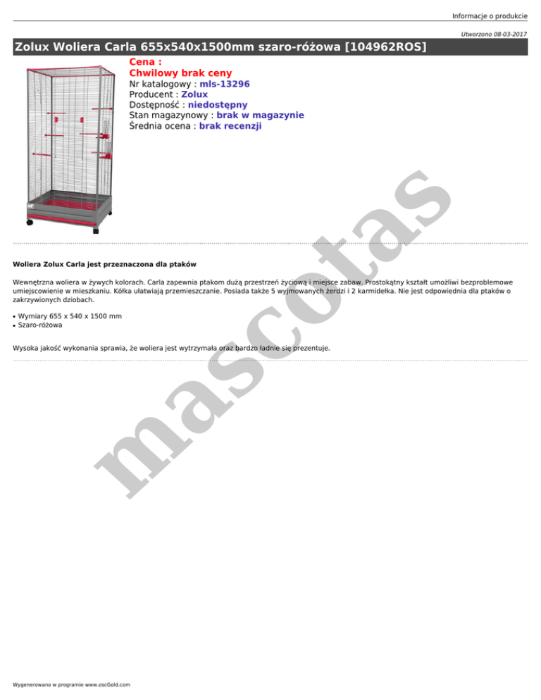 Informacje o produkcie Utworzono 08-03-2017 Zolux Woliera Carla 655x540x1500mm szaro-różowa [104962ROS] Cena : Chwilowy brak ceny co ta s Nr katalogowy : mls-13296 Producent : Zolux Dostępność : niedostępny Stan magazynowy : brak w magazynie Średnia ocena : brak recenzji Woliera Zolux Carla jest przeznaczona dla ptaków Wewnętrzna woliera w żywych kolorach. Carla zapewnia ptakom dużą przestrzeń życiową i miejsce zabaw. Prostokątny kształt umożliwi bezproblemowe umiejscowienie w mieszkaniu. Kółka ułatwiają przemieszczanie. Posiada także 5 wyjmowanych żerdzi i 2 karmidełka. Nie jest odpowiednia dla ptaków o zakrzywionych dziobach. ● ● Wymiary 655 x 540 x 1500 mm Szaro-różowa m as Wysoka jakość wykonania sprawia, że woliera jest wytrzymała oraz bardzo ładnie się prezentuje. Wygenerowano w programie www.oscGold.com