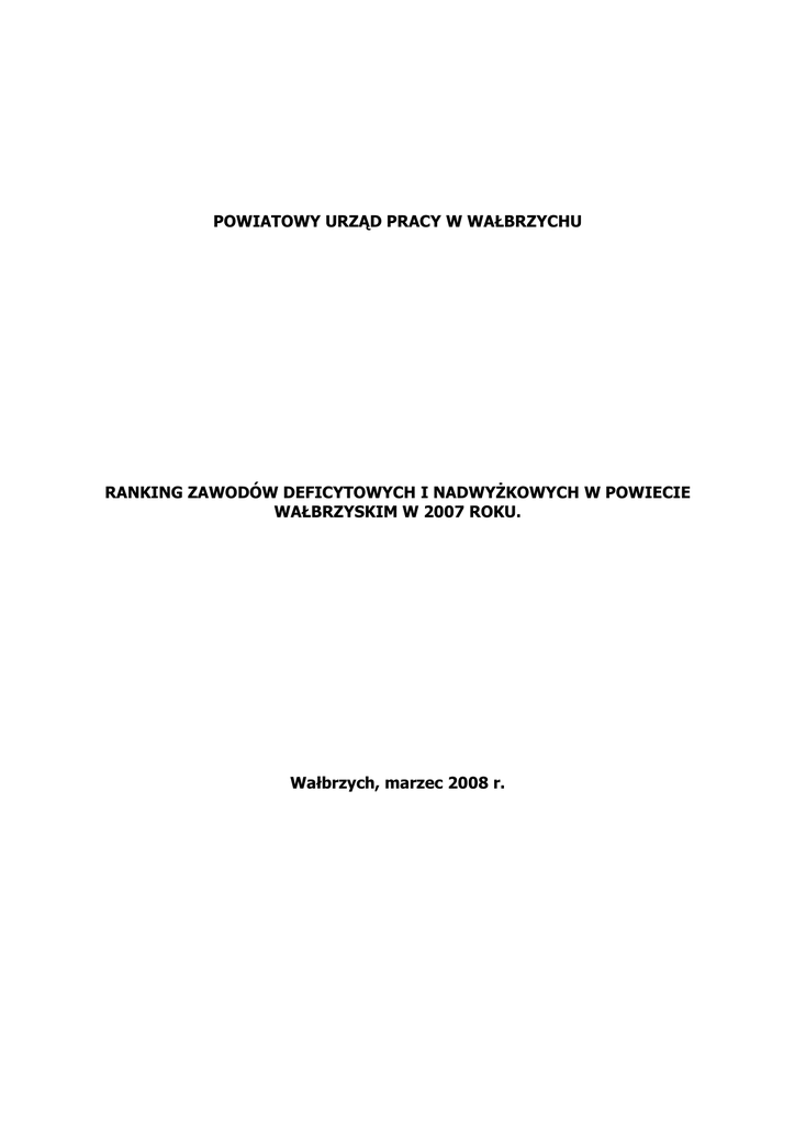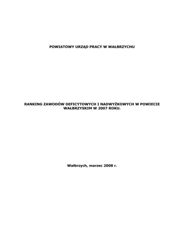 POWIATOWY URZĄD PRACY W WAŁBRZYCHU RANKING ZAWODÓW DEFICYTOWYCH I NADWYŻKOWYCH W POWIECIE WAŁBRZYSKIM W 2007 ROKU. Wałbrzych, marzec 2008 r. Spis Treści 1.Wstęp. 1.1 Cele opracowania. 1.2 Podstawa opracowania. 1.3 Metodologia opracowania. 2.Analiza bezrobocia według zawodów / grup zawodowych. 2.1 Analiza bezrobocia według zawodów. 2.2 Analiza bezrobocia według grup zawodowych. 3.Analiza ofert pracy według zawodów / grup zawodowych. 3.1 Analiza ofert pracy według zawodów. 3.2 Analiza ofert pracy według grup zawodowych. 4. Analiza zawodów deficytowych i nadwyżkowych. 4.1 Średnia miesięczna nadwyżka (deficyt) podaży siły roboczej. 4.2 Wskaźnik intensywności nadwyżki (deficytu) zawodów. 5. Struktura zawodowa absolwentów według poziomu wykształcenia. 1.Wstęp 1. Cele opracowania. Celem opracowania rankingu zawodów deficytowych jest obserwowanie zjawisk zachodzących na rynku pracy dotyczących kształtowania popytu na pracę i podaży zasobów pracy w przekroju terytorialno - zawodowym oraz formułowania na tej podstawie ocen, wniosków i krótkotrwałych prognoz niezbędnych dla prawidłowego funkcjonowania systemów szkolenia bezrobotnych oraz kształcenia zawodowego. Prowadzenie monitoringu zawodów deficytowych i nadwyżkowych pozwala na : ● Określenie kierunków i natężenia zmian zachodzących w strukturze zawodowo – kwalifikacyjnej na lokalnym, regionalnym i krajowym rynku pracy. ● Stworzenie bazy informacji dla opracowania przyszłych struktur zawodowo – kwalifikacyjnych w układzie lokalnym, regionalnym i krajowym, ● określenie odpowiednich kierunków szkolenia bezrobotnych, zapewniając większą efektywność organizowanych szkoleń, ● bieżącą korektę poziomu, struktury i treści kształcenia zawodowego, (dotyczy władz oświatowych oraz dyrekcji szkół), ● usprawnienie pośrednictwa pracy poprzez uzyskanie informacji o planowanych ofertach pracy na rok przyszły oraz przewidywanej liczbie absolwentów według zawodów. 1.2 Podstawa opracowania. Zgodnie z przepisami Ustawy z dnia 20 kwietnia 2004 r. O promocji zatrudnienia i instytucjach rynku pracy ( art.8, ust.1 pkt. 3 i art. 9, ust. 1 pkt 9) opracowanie analiz rynku pracy , w tym prowadzenie monitoringu zawodów deficytowych i nadwyżkowych jest jednym z zadań samorządu powiatu w zakresie polityki rynku pracy oraz zadaniem umieszczonym w Krajowym Planie Działań na Rzecz Zatrudnienia na 2008 r. 1.3 Metodologia opracowania Źródłem informacji do opracowania niniejszego raportu są : ● załącznik 3 do sprawozdania MPiPS – 01 - „Bezrobotni oraz oferty pracy według zawodów i specjalności” za I lub II półrocze danego roku kalendarzowego” ● załącznik 2 do sprawozdania MPiPS – 01 - „Bezrobotni według rodzaju działalności, ostatniego miejsca pracy”. Stan za I lub II półrocze danego roku kalendarzowego, Monitoring dotyczy 30 dużych grup zawodowych, 392 grup elementarnych oraz 1707 zawodów i specjalności określonych w „Klasyfikacji zawodów i specjalności” wprowadzonej do stosowania Rozporządzeniem Ministra Gospodarki i Pracy z dnia 8 grudnia 2004 roku. Ponadto przy monitoringu uwzględniono również poziom i strukturę bezrobotnych oraz zgłoszonych ofert pracy według Polskiej Klasyfikacji Działalności. Zakres zgromadzonych informacji rozszerzony został o strukturę zawodową absolwentów według poziomu wykształcenia i zawodów. 1. Analiza bezrobocia według zawodów / grup zawodów. 2.1 Analiza bezrobocia według zawodów. Analizę bezrobocia według zawodów dokonano w oparciu o dane statystyczne za rok 2007 ze sprawozdań MPiPS – 01 wygenerowane dzięki programowi komputerowemu. Poniższa tabela zawiera zestawienie zawodów, w których występowało największe bezrobocie w roku 2007. Nazwa zawodu Ilość osób bezrobotnych Ogółem Kobiety 1665 1047 Sprzedawca 811 761 Krawiec 337 332 Szwaczka 244 240 Górnik eksploatacji podziemnej 237 0 Murarz 231 0 Ślusarz 215 9 Sprzątaczka 206 199 Ekonomista 188 162 Kucharz 184 164 Pracownik biurowy 171 151 Robotnik gospodarczy 153 91 Robotnik budowlany 134 8 Asystent ekonomiczny 130 123 126 11 Magazynier 99 47 Ceramik wyrobów użytkowych i ozdobnych 95 85 Bez zawodu Technik mechanik W 2007 r. największe bezrobocie występowało wśród osób bez zawodu oraz wśród sprzedawców. Przeważającą część tych osób stanowiły kobiety. Dużą grupę bezrobotnych kobiet tworzą też krawcowe, szwaczki oraz sprzątaczki. Wśród mężczyzn największe bezrobocie panuje w zawodach budowlanych, mechanicznych, a także wśród górników eksploatacji podziemnej. Napływ bezrobotnych według powiecie wałbrzyskim w 2007 r. największy liczbowo był w n/w zawodach: zawodów w Nazwa zawodu Ilość osób bezrobotnych Ogółem Kobiety Bez zawodu 4673 2435 Sprzedawca 1283 1166 Murarz 505 0 Krawiec 477 467 Górnik eksploatacji podziemnej 382 0 Ślusarz 335 2 Szwaczka 323 312 Ekonomista 308 254 Pedagog 307 254 Technik mechanik 298 9 Asystent ekonomiczny 281 257 Robotnik gospodarczy 275 127 Robotnik budowlany 271 12 Kucharz 257 198 Sprzątaczka 228 215 Pracownik biurowy 204 177 Pozostali mechanicy pojazdów samochodowych 199 1 Stolarz 160 14 Pozostali robotnicy przy pracach prostych w przemyśle 157 71 Pracownik administracyjny 150 128 Piekarz 149 25 Robotnik placowy 141 58 Tokarz 140 5 Przędzarz 137 127 Kelner 129 110 Mechanik samochodów osobowych 119 0 Cukiernik 117 63 Ceramik wyrobów użytkowych i ozdobnych 117 100 Robotnik drogowy 116 12 Technik budownictwa 107 32 Mechanik maszyn i urządzeń przemysłowych 102 1 Elektromonter zakładowy 100 4 Zdobnik ceramiki 96 90 W badanym okresie najwięcej do urzędu pracy napłynęło osób bezrobotnych z kwalifikacjami w zawodach : sprzedawca, murarz, krawiec oraz górnik eksploatacji podziemnej. Najwięcej bezrobotnych kobiet napłynęło w zawodach: sprzedawca, krawiec oraz szwaczka. Wśród mężczyzn największą grupę stanowili murarze, górnicy e