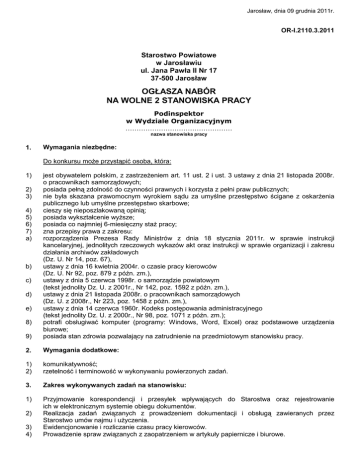 Jarosław, dnia 09 grudnia 2011r. OR-I.2110.3.2011 Starostwo Powiatowe w Jarosławiu ul. Jana Pawła II Nr 17 37-500 Jarosław OGŁASZA NABÓR NA WOLNE 2 STANOWISKA PRACY Podinspektor w Wydziale Organizacyjnym ………………………………………… nazwa stanowiska pracy 1. Wymagania niezbędne: Do konkursu moŜe przystąpić osoba, która: 9) jest obywatelem polskim, z zastrzeŜeniem art. 11 ust. 2 i ust. 3 ustawy z dnia 21 listopada 2008r. o pracownikach samorządowych; posiada pełną zdolność do czynności prawnych i korzysta z pełni praw publicznych; nie była skazana prawomocnym wyrokiem sądu za umyślne przestępstwo ścigane z oskarŜenia publicznego lub umyślne przestępstwo skarbowe; cieszy się nieposzlakowaną opinią; posiada wykształcenie wyŜsze; posiada co najmniej 6-miesięczny staŜ pracy; zna przepisy prawa z zakresu: rozporządzenia Prezesa Rady Ministrów z dnia 18 stycznia 2011r. w sprawie instrukcji kancelaryjnej, jednolitych rzeczowych wykazów akt oraz instrukcji w sprawie organizacji i zakresu działania archiwów zakładowych (Dz. U. Nr 14, poz. 67), ustawy z dnia 16 kwietnia 2004r. o czasie pracy kierowców (Dz. U. Nr 92, poz. 879 z późn. zm.), ustawy z dnia 5 czerwca 1998r. o samorządzie powiatowym (tekst jednolity Dz. U. z 2001r., Nr 142, poz. 1592 z późn. zm.), ustawy z dnia 21 listopada 2008r. o pracownikach samorządowych (Dz. U. z 2008r., Nr 223, poz. 1458 z późn. zm.), ustawy z dnia 14 czerwca 1960r. Kodeks postępowania administracyjnego (tekst jednolity Dz. U. z 2000r., Nr 98, poz. 1071 z późn. zm.); potrafi obsługiwać komputer (programy: Windows, Word, Excel) oraz podstawowe urządzenia biurowe; posiada stan zdrowia pozwalający na zatrudnienie na przedmiotowym stanowisku pracy. 2. Wymagania dodatkowe: 1) 2) komunikatywność; rzetelność i terminowość w wykonywaniu powierzonych zadań. 3. Zakres wykonywanych zadań na stanowisku: 1) Przyjmowanie korespondencji i przesyłek wpływających do Starostwa oraz rejestrowanie ich w elektronicznym systemie obiegu dokumentów. Realizacja zadań związanych z prowadzeniem dokumentacji i obsługą zawieranych przez Starostwo umów najmu i uŜyczenia. Ewidencjonowanie i rozliczanie czasu pracy kierowców. Prowadzenie spraw związanych z zaopatrzeniem w artykuły papiernicze i biurowe. 1) 2) 3) 4) 5) 6) 7) a) b) c) d) e) 8) 2) 3) 4) 4. Wymagane dokumenty: 1) 2) 3) 4) 5) podpisany własnoręcznie list motywacyjny, podpisany własnoręcznie Ŝyciorys – CV, wypełniony kwestionariusz osobowy dla osoby ubiegającej się o zatrudnienie, dokumenty potwierdzające kwalifikacje zawodowe, wymagane do wykonywania oferowanej pracy, świadectwa pracy z poprzednich miejsc pracy lub inne dokumenty potwierdzające okresy zatrudnienia, obejmujące okresy pracy przypadające w roku kalendarzowym, w którym kandydat ubiega się o zatrudnienie, osoba ubiegająca się o zatrudnienie moŜe dodatkowo przedłoŜyć dokumenty potwierdzające jej umiejętności i osiągnięcia zawodowe, świadectwa pracy z poprzednich miejsc pracy lub inne dokumenty potwierdzające okresy zatrudnienia, obejmujące okresy pracy przypadające w innym roku kalendarzowym niŜ rok, w którym kandydat ubiega się o zatrudnienie oraz dokumenty stanowiące podstawę do korzystania ze szczególnych uprawnień w zakresie stosunku pracy, oświadczenie kandydata złoŜone pod odpowiedzialnością karną o niekaralności za umyślne przestępstwo ścigane z oskarŜenia publicznego lub umyślne przestępstwo skarbowe, a takŜe oświadczenie o posiadaniu pełnej zdolności do czynności prawnych i korzystaniu z pełni praw publicznych, oświadczenie kandydata o braku przeciwwskazań zdrowotnych do wykonywania pracy na danym stanowisku urzędniczym, oświadczenie kandydata o wyraŜeniu zgody na przetwarzanie danych osobowych do celów rekrutacji, oświadczenie kandydata o posiadaniu obywatelstwa polskiego, (nie dotyczy osób ubiegających się o zatrudnienie na zasadach wskazanych w art. 11 ust. 2 i ust. 3 ustawy z dnia 21 listopada 2008r. o pracownikach samorządowych, które przedstawiają kopie właściwych dokumentów toŜsamości i karty pobytu oraz zaświadczenia o znajomości języka polskiego wskazane w cytowanej ustawie). 6) 7) 8) 9) 10) Wymagane dokumenty aplikacyjne naleŜy składać w zaklejonej kopercie, osobiście w Biurze Podawczym Starostwa Powiatowego w Jarosławiu, w godzinach pracy Urzędu (I piętro, pokój 75) lub pocztą na adres Starostwa Powiatowego w Jarosławiu (37-500 Jarosław, ul. Jana Pawła II Nr 17) z dopiskiem: Nabór na 2 stanowiska Podinspektora w Wydziale Organizacyjnym w Starostwie Powiatowym w Jarosławiu (OR-I.2110.3.2011) w terminie do dnia 21 grudnia 2011r. (nie mniej niŜ 10 dni od dnia opublikowania w BIP). Aplikacje, które wpłyną do Starostwa Powiatowego w Jarosławiu po wyŜej określonym terminie nie będą rozpatrywane. Kandydaci spełniający wymagania formalne i dopuszczeni do kolejnego etapu rekrutacji zostaną o tym powiadomieni pisemnie. Informacja o wyniku naboru będzie umieszczona na stronie internetowej Biuletynu Informacji Publicznej (www.jaroslaw.samorzady.pl) oraz na tablicy ogłoszeń w siedzibie Starostwa. STAROSTA JAROSŁAWSKI Jerzy Batycki