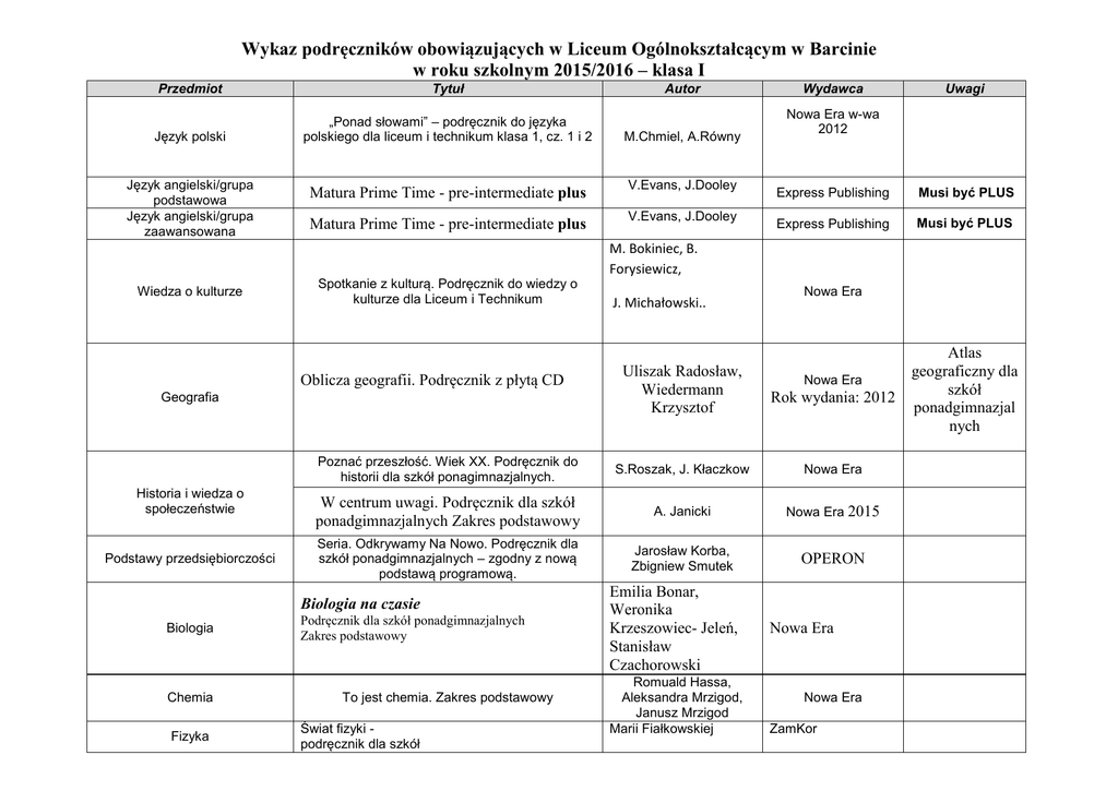 Wykaz podręczników obowiązujących w Liceum Ogólnokształcącym w Barcinie w roku szkolnym 2015/2016 – klasa I Przedmiot Tytuł Język polski „Ponad słowami” – podręcznik do języka polskiego dla liceum i technikum klasa 1, cz. 1 i 2 Język angielski/grupa podstawowa Język angielski/grupa zaawansowana Wiedza o kulturze Matura Prime Time - pre-intermediate plus Matura Prime Time - pre-intermediate plus Spotkanie z kulturą. Podręcznik do wiedzy o kulturze dla Liceum i Technikum Oblicza geografii. Podręcznik z płytą CD Geografia Historia i wiedza o społeczeństwie Podstawy przedsiębiorczości Chemia Fizyka M.Chmiel, A.Równy V.Evans, J.Dooley V.Evans, J.Dooley Wydawca Express Publishing Musi być PLUS Express Publishing Musi być PLUS M. Bokiniec, B. Forysiewicz, J. Michałowski.. Uliszak Radosław, Wiedermann Krzysztof Nowa Era Nowa Era Rok wydania: 2012 S.Roszak, J. Kłaczkow Nowa Era W centrum uwagi. Podręcznik dla szkół ponadgimnazjalnych Zakres podstawowy A. Janicki Nowa Era 2015 Seria. Odkrywamy Na Nowo. Podręcznik dla szkół ponadgimnazjalnych – zgodny z nową podstawą programową. Jarosław Korba, Zbigniew Smutek OPERON Podręcznik dla szkół ponadgimnazjalnych Zakres podstawowy To jest chemia. Zakres podstawowy Świat fizyki podręcznik dla szkół Uwagi Nowa Era w-wa 2012 Poznać przeszłość. Wiek XX. Podręcznik do historii dla szkół ponagimnazjalnych. Biologia na czasie Biologia Autor Emilia Bonar, Weronika Krzeszowiec- Jeleń, Stanisław Czachorowski Romuald Hassa, Aleksandra Mrzigod, Janusz Mrzigod Marii Fiałkowskiej Nowa Era Nowa Era ZamKor Atlas geograficzny dla szkół ponadgimnazjal nych ponadgimnazjalnych. Zakres podstawowy MATeMAtyka 1 Matematyka Podręcznik dla szkół ponadgimnazjalnych Zakres podstawowy– zgodny z nową podstawą programową. Informatyka. Bez podręcznika Edukacji dla Bezpieczeństwa Religia Język niemiecki Bez podręcznika Będzie podany we wrześniu Będzie podany po 25 sierpnia Język rosyjski Podręcznik oraz ćwiczenia Wot i my 1 (czerwona okładka) Przedmiot Język polski/ podstawowy Wojciech Babiański, Lech Chańko, Dorota Ponczek Nowa Era M.Wiatr-Kmieciak, S.Wujec PWN Wykaz podręczników obowiązujących w Liceum Ogólnokształcącym w Barcinie w roku szkolnym 2015/2016 – klasa II Tytuł Autor Wydawca „Ponad słowami” – podręcznik do języka Nowa Era w-wa polskiego dla liceum i technikum klasa 2, cz. po 2012 M.Chmiel, A.Równy 1 i 2. Język angielski/ podstawowy Matura Prime Time – Intermediate plus Język angielski - rozszerzenie Matura Prime Time – Intermediate plus Podręcznik (bez ćwiczeń) Wot i my 2 Język rosyjski (pomarańczowa okładka) Język niemiecki Będzie podany po 25 sierpnia Oblicza geografii 1 Podręcznik z płytą CD Geografia - rozszerzenie Zakres rozszerzony V.Evans, J.Dooley V.Evans, J.Dooley M.Wiatr-Kmieciak, S.Wujec Malarz Roman, Więckowski Marek Nowa Era Wiedza o społeczeństwie rozszerzenie W centrum uwagi. Zakres rozszerzony cz. 1 A. Janicki, Kięczkowska, M.Menz Nowa Era 2015 Język polski/ podstawowy+ rozszerzenie „Ponad słowami” – podręcznik do języka polskiego dla liceum i technikum klasa 2, cz. 1 i 2. M.Chmiel, A.Równy Nowa Era w-wa 2012 Biologia - rozszerzenie Biologia na czasie 1 Marek Guzik, Ewa Jastrzębska, Ryszard Nowa Era Podręcznik dla liceum ogólnokształcącego i technikum najnowsze Uwagi Express Publishing Express Publishing Musi być PLUS Musi być PLUS PWN najnowsze Zakres rozszerzon. Biologia na czasie 1 Biologia - rozszerzenie Maturalne karty pracy Zakres rozszerzony To jest chemia 1 Chemia - rozszerzenie Chemia ogólna i nieorganiczna Podręcznik dla liceum ogólnokształcącego i technikum. Zakres rozszerzony MATeMAtyka 2 Matematyka/ podstawowy Podręcznik dla szkół ponadgimnazjalnych Zakres podstawowy– zgodny z nową podstawą programową. Matematyka/ podstawowy + rozszerzenie Podręcznik dla szkół ponadgimnazjalnych Zakres rozszerzony– zgodny z nową podstawą programową. Informatyka.-rozszerzenie Bez podręcznika MATeMAtyka 2 Historia i społeczeństwo Przyroda Historia i społeczeństwo Poznać Przeszłość. Podręcznik Ojczysty Panteon i ojczyste spory i 2 część Rządzący i rządzeni. Przyroda cz. 1. Materiały merytoryczne przeznaczone do nauki przyrody Kozik, Renata Matuszewska, Ewa Pyłka-Gutowska, Władysław Zamachowski Barbara Arciuch, Magdalena Fiałkowska-Kołek, Barbara JanuszewskaHasiec, Elżbieta Komosa, Małgorzata Leyko, Alina Nowakowska, Iwona Płusa, Urszula Poziomek, Renata Stencel, Aleksandra Szkutnik-Stokłosa, Anna Tyc J.Szymańska, Sz. Styka-Wlazło Nowa Era Nowa Era Wojciech Babiański, Lech Chańko, Dorota Ponczek Nowa Era Wojciech Babiański, Lech Chańko, Dorota Ponczek Nowa Era T.Maćkowski Nowa Era 2014 Iwona Janicka Mirosław Galikowski, Romuald Hassa, Marek Kaczmarzyk, Aleksandra Mrzigod, Nowa Era Janusz Mrzigod, Marek Więckowski Religia Przedmiot Język polski/ podstawowy Język polski/ podstawowy+rozszerzony Język angielski/ podstawowy Język angielski/ rozszerzony Język niemiecki Historia - rozszerzenie Będzie podany we wrześniu Wykaz podręczników obowiązujących w Liceum Ogólnokształcącym w Barcinie w roku szkolnym 2015/2016 – klasa III Tytuł Autor Wydawca „Ponad słowami” – podręcznik do języka Nowa Era w-wa polskiego dla liceum i technikum klasa 3, cz. po 2012 M.Chmiel, A.Równy 1 i 2. Ponad słowami klasa 3.Podręcznikdo kształcenia literackiego i kulturowego, zakres podstawowy i rozszerzony. Matura 2015. Repetytorium. Poziom podstawowy. Matura 2015. Repetytorium. Poziom podstawowy. Będzie podany po 25 sierpnia Zrozumieć przeszłość Lata 1815-1939.Zakres rozszerzony, cz. 3 Nowa Era 2014, Zrozumieć przeszłość Dzieje najnowsze po 1939 roku Zakres rozszerzony. Wiedza o społeczeństwie rozszerzenie W centrum uwagi. Zakres rozszerzony cz. 1 Matematyka/ podstawowy Podręcznik dla szkół ponadgimnazjalnych Zakres podstawowy– zgodny z nową podstaw