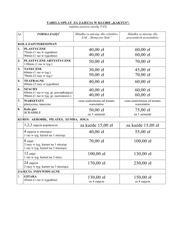 TABELA OPŁAT ZA ZAJĘCIA W KLUBIE „KAKTUS”: (opłata zawiera stawkę VAT) FORMA ZAJĘĆ Lp. Składka za miesiąc dla członków S.M. „Słoneczny Stok” Składka za miesiąc dla pozostałych uczestników KOŁA ZAINTERESOWAŃ 1. PLASTYCZNE 75min (1 raz w tygodniu) 90min (1 raz w tygodniu) 40,00 zł 40,00 zł 60,00 zł 60,00 zł 2. PLASTYCZNE ARTYSTYCZNE 120min (1 raz w tyg.) 50,00 zł 70,00 zł 3. TANECZNE 60min (1 raz w tyg.) 70min (2 razy w tyg.) 30,00 zł 50,00 zł 45,00 zł 70,00 zł 4. TEATRALNE 60min (2 razy w tygodniu) 40,00 zł 60,00 zł 6. SZACHY 60min (1 raz w tyg. gr. początkująca) 90min (1 raz w tyg. gr. zaawansow.) 40,00 zł 40,00 zł 60,00 zł 60,00 zł 7. WARSZTATY plastyczne, taneczne cena uzależniona od tematu warsztatów cena uzależniona od tematu warsztatów 8. Koła gier SCRABBLE 50,00 zł 75,00 zł za 1 semestr za 1 semestr KURSY: AEROBIK, PILATES, ZUMBA, JOGA 1,2,3 zajęcia pojedyncze 4 zajęcia w miesiącu 1 raz w tyg. karnet na 1 miesiąc 8 zajęć 2 razy w tyg. karnet na 1 miesiąc 1 raz w tyg. karnet na 2 miesiące 12 zajęć za każde 15,00 zł za każde 15,00 zł 40,00 zł 55,00 zł 70,00 zł 100,00 zł 100,00 zł 130,00 zł 170,00 zł 230,00 zł 130,00 zł 150,00 zł za 4 zajęcia za 4 zajęcia 1 raz w tyg. karnet na 3 mies. 24 zajęcia 2 razy w tyg. karnet na 3 miesiące ZAJĘCIA INDYWIDUALNE 1. GITARA 45min (1 raz w tygodniu)