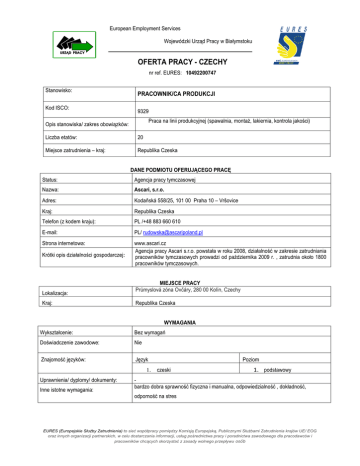 European Employment Services Wojewódzki Urząd Pracy w Białymstoku OFERTA PRACY - CZECHY nr ref. EURES: 10492200747 Stanowisko: Kod ISCO: PRACOWNIK/CA PRODUKCJI 9329 Praca na linii produkcyjnej (spawalnia, montaż, lakiernia, kontrola jakości) Opis stanowiska/ zakres obowiązków: Liczba etatów: 20 Miejsce zatrudnienia – kraj: Republika Czeska DANE PODMIOTU OFERUJĄCEGO PRACĘ Status: Agencja pracy tymczasowej Nazwa: Ascari, s.r.o. Adres: Kodaňská 558/25, 101 00 Praha 10 – Vršovice Kraj: Republika Czeska Telefon (z kodem kraju): PL /+48 883 660 610 E-mail: PL/ [email protected] Strona internetowa: www.ascari.cz Agencja pracy Ascari s.r.o. powstała w roku 2008, działalność w zakresie zatrudniania pracowników tymczasowych prowadzi od października 2009 r. , zatrudnia około 1800 pracowników tymczasowych. Krótki opis działalności gospodarczej: Lokalizacja: Kraj: MIEJSCE PRACY Průmyslová zóna Ovčáry, 280 00 Kolín, Czechy Republika Czeska WYMAGANIA Wykształcenie: Bez wymagań Doświadczenie zawodowe: Nie Znajomość języków: Język 1. czeski Uprawnienia/ dyplomy/ dokumenty: Inne istotne wymagania: Poziom 1. podstawowy bardzo dobra sprawność fizyczna i manualna, odpowiedzialność , dokładność, odporność na stres EURES (Europejskie Służby Zatrudnienia) to sieć współpracy pomiędzy Komisją Europejską, Publicznymi Służbami Zatrudnienia krajów UE/ EOG oraz innych organizacji partnerskich, w celu dostarczania informacji, usług pośrednictwa pracy i poradnictwa zawodowego dla pracodawców i pracowników chcących skorzystać z zasady wolnego przepływu osób WYNAGRODZENIE I WARUNKI ZATRUDNIENIA Wysokość pensji brutto: 18 000 – 26 000 Wysokość pensji netto: http://www.vypocet.cz/cista-mzda Waluta, w jakiej wypłacana jest pensja: Korona czeska Rodzaj stawki wynagrodzenia: miesięczna • Stałe dodatki za pracę w weekendy, noce i święta Premie: Dodatkowe świadczenia • Zakwaterowanie: • Wyżywienie: • Podróż: • Inne • Dofinansowanie 1500 Kč do zakwaterowania • Dofinansowanie do wyżywienie na zakładowej stołówce • Koszt pierwszego dojazdu do pracy pokrywa pracodawca • Koszt badania lekarskiego pokrywa pracodawca Nazwa firmy, z którą zostanie podpisana umowa: Ascari, s.r.o. Rodzaj umowy: umowa o pracę z agencja pracy tymczasowej Wymiar czasu pracy Pełen etat Czas trwania umowy: czas nieokreślony (3 miesięczny okres próbny) Liczba godzin tygodniowo: 37,5 Praca na zmiany: system dwuzmianowy Po-Cz (od 6.30-17.10, od 18.30 do 05:10) Data rozpoczęcia: od zaraz Inne informacje: - SPOSÓB SKŁADANIA WNIOSKU Wymagane dokumenty: CV (w tytule maila proszę dopisać „EURES- OPERÁTOR VÝROBY) Język, w którym muszą być sporządzone przedkładane dokumenty: polski Do kogo należy wysłać dokumenty: do agencji Gdzie należy wysłać dokumenty: [email protected] Dane teleadresowe doradcy EURES lub przedstawiciela pracodawcy: Monika Rudowska, mail: [email protected], tel.: 0048 883 660 610 KOORDYNATOR Wojewódzki Urząd Pracy w Opolu WAŻNOŚĆ Data publikacji: 21.04.2016 Termin przedkładania podań o pracę / zakończenia ważności oferty: Do odwołania Uprzejmie informujemy, że Agencja Pracy Tymczasowej Ascari s.r.o. oświadczyła, że działa zgodnie przepisami prawa obowiązującymi na terenie Republiki Czeskiej. EURES (Europejskie Służby Zatrudnienia) to sieć współpracy pomiędzy Komisją Europejską, Publicznymi Służbami Zatrudnienia krajów UE/ EOG oraz innych organizacji partnerskich, w celu dostarczania informacji, usług pośrednictwa pracy i poradnictwa zawodowego dla pracodawców i pracowników chcących skorzystać z zasady wolnego przepływu osób Uprzejmie informujemy, że pracodawca skontaktuje się wyłącznie z wybranymi kandydatami. Urząd Pracy dokłada wszelkich starań, aby oferty pracy będące w zasobach urzędu, były rzetelne i wiarygodne. Ponieważ wszystkie oferty pracy pochodzą od osób trzecich Urząd Pracy zastrzega, że odpowiedzialność za ewentualne rozbieżności pomiędzy warunkami pracy zaprezentowanymi w niniejszej ofercie a warunkami zaproponowanymi przez potencjalnego pracodawcę ponosi pracodawca. Stosunek pracy z pracodawcą zagranicznym będzie zawarty w ramach prawa obowiązującego w kraju zatrudnienia. Oznacza to, że wszelkie roszczenie z tytułu nie wywiązywania się pracodawcy z warunków zawartych w umowie o pracę, dochodzić można wyłącznie w sądzie pracy w kraju zatrudnienia. W sytuacjach losowych pomoc polskich placówek konsularnych ogranicza się do ewentualnego udzielenia doraźnej pomocy (np. kredytu na zakup biletu powrotnego do Polski ). Na podstawie ustawy o ochronie danych osobowych z dnia 29 sierpnia 1997 r. (Dz. U. z 2014 r., poz.1182 ze zm.) informujemy, że administratorem danych osobowych wskazanych w dokumentach przekazanych w odpowiedzi na ofertę pracy jest pracodawca zagraniczny/ Wojewódzki Urząd Pracy w Opolu, ul. Głogowska 25C, 45-315 Opole Dane osobowe wskazane dobrowolnie w ww. dokumentach będą przetwarzane i udostępniane publicznym służbom zatrudnienia, pracodawcom lub podmiotom reprezentującym pracodawców do celów związanych z pośrednictwem pracy w ramach sieci EURES, na podstawie ustawy z dnia 20 kwietnia 2004 r. o promocji zatrudnienia i instytucjach rynku pracy (Dz. U. z 2015 r. , poz. 149 z póź. zm.) przez okres konieczny do osiągnięcia celu określonego w przedmiotowej ustawie. Osobie, której dane osobowe dotyczą przysługuje prawo dostępu do ich treści i prawo ich poprawiania. Więcej ofert pracy za granicą: www.eures.europa.eu www.eures.praca.gov.pl www.eures.wup.opole.pl EURES (Europejskie Służby Zatrudnienia) to sieć współpracy pomiędzy Komisją Europejską, Publicznymi Służbami Zatrudnienia krajów UE/ EOG oraz innych organizacji partnerskich, w celu dostarczania informacji, usług pośrednictwa pracy i poradnictwa zawodowego dla pracodawców i pracowników chcących skorzystać z zasady wolne
