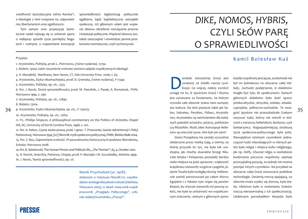 wiedliwość dystrybucyjna Johna Rawlsa16, a ideologie z nimi związane to, odpowiednio, libertarianizm oraz egalitaryzm. Tym samym owe propozycje teoretyczne nadal wpisują się w schemat sporu o najlepszy sposób życia pomiędzy bogatymi i wolnymi, a wspomniane koncepcje sprawiedliwości legitymizują politycznie egalitarny bądź kapitalistyczny porządek społeczny. Ich głównym celem jest wspierać ideowo określone rozwiązania prawne i instytucje polityczne. Wspierać ideowo, tzn. także zaszczepiać i utwierdzać pewne przekonania normatywne, czyli wychowywać. DIKE, NOMOS, HYBRIS, CZYLI SŁÓW PARĘ O SPRAWIEDLIWOŚCI Kamil Bolesław Kuś Przypisy: 1. Arystoteles, Polityka, przeł. L. Piotrowicz, (różne wydania), 1275a. 2. Ibidem, 1310a, takie rozumienie wolności stanowi zalążek współczesnych ideologii. 34 3. H. Mansfield, Manliness, New Haven, CT, Yale University Press 2006, s. 63. 4. Arystoteles, Etyka nikomachejska, przeł. D. Gromska, (różne wydania), V 1134a. 5. Arystoteles, Polityka, op. cit., 1323. 6. Por. J. Rawls, Teoria sprawiedliwości, przeł. M. Panufnik, J. Pasek, A. Romaniuk, PWN, Warszawa 1994, s. 290. 7. Arystoteles, Polityka, op. cit., 1289a. 8. Ibidem, 1310a. 9. Arystoteles, Etyka nikomachejska, op .cit., V 1131a25. 10. Arystoteles, Polityka, op. cit., 1281a. 11. P.L. Phillips Simpson, A philosophical commentary on the Politics of Aristotle, Chapel Hill, NC, University of North Carolina Press, 1998, s. 201. 12. Por. H. Kelsen, Czysta teoria prawa, przeł. i oprac. T. Przeworski, Gazeta Administracji i Policji Państwowej, Warszawa 1934, [w:] Słownik myśli społeczno-politycznej, PARK, Bielsko-Biała 2004. 13. Por. Z. Rau, Zapomniana wolność. W poszukiwaniu historycznych podstaw liberalizmu, Scholar, Warszawa 2008. 14. Por. R. Sokolowski, The Human Person and Political Life, „The Thomist”, 65, 4, October 2001. 15. R. Nozick, Anarchia, Państwo, Utopia, przeł. P. Maciejko i M. Szczubiałka, Aletheia 1999. 16. J. Rawls, Teoria sprawiedliwości, op. cit. Marek Przychodzeń (ur. 1978): doktorant w Instytucie Filozofii UJ, współredaktor antologii Aktualność wolności (Aletheia, Warszawa 2005), w latach 2004-2008 współpracownik „Przeglądu Politycznego”, członek redakcji kwartalnika „Pressje”. D orobek starożytnej Grecji jest uważany za źródło naszej cywilizacji. Co więcej, należy zwrócić uwagę na to, iż spuścizna Grecji i Rzymu jest uznawana za fundament, na którym wyrosła cała obecnie znana nam europejska kultura. Do dziś postacie takie jak Solon, Sokrates, Perykles, Fidiasz, Arystofanes, Arystoteles są natchnieniem dla kolejnych pokoleń artystów, pisarzy, polityków czy filozofów. Myśli, idee i koncepcje Hellenów są wiecznie żywe. Kim byli oni sami? Dzieci Posejdona nie zostały szczodrze obdarzone przez matkę Gaję, a ziemia, na której przyszło im żyć, nie była tak urodzajna, jak choćby aluwialne brzegi Nilu. Cała Attyka i Peloponez posiadały bardzo mało miejsca na pola uprawne1, większość krajobrazu stanowiły wzgórza i pagórki, jedynie Tesalia była rozległą równią. Hellenowie zostali porozrzucani po całym Morzu Egejskim i z faktem tym wiąże się pewien kłopot, bo chociaż stanowili oni pewną całość, nie była to unitarność we współczesnym znaczeniu. Jednym z głównych spoiw każdej wspólnoty jest język, aczkolwiek nie był on jednakowy na obszarze całej Hellady. Zachodzi podejrzenie, iż dialektów mogło być tyle, ile społeczności. Samych głównych dialektów było dość sporo: jońsko-attyckie, doryckie, eolskie, arkadocypryjskie, północno-zachodnie. Ta mnogość języków nie przeszkadzała Grekom nazywać ludzi, którzy nie mówili w którymś z narzeczy helleńskich, barbaroi, czyli barbarzyńcy. Najpopularniejszą strukturą życia społeczno-politycznego była polis. Niewątpliwe istotnym czynnikiem jednoczącym ludzi mieszkających w różnych poleis była religia i miejsca kultu religijnego, jak np. Delfy. Chociaż relgia w kontekście budowania poczucia wspólnoty zajmuje pryncypialną pozycję, to jednak nie można pomijać innych czynników. Na przykład na obszarze całej Grecji stosowano podobne technologie. Ostatnią rzeczą spajającą, co obecnie może wydać się dziwne, była bieda. Ubóstwo było w mniemaniu Greków rzeczą nierozerwalną z ich społecznością. Ulubionym porzekadłem Hezjoda było Impressje 35 36 twierdzenie, iż „Grecja i bieda to siostry”, a Herodot w swoich Dziejach napisał „[…] bieda jest zawsze wierną towarzyszką Hellady…”. Taki stan rzeczy nie dziwił, ponieważ 90% ówczesnych Hellenów było rolnikami, a ziemia nie była urodzajna i nie dawała dużych plonów. Toteż woda, okalająca Grecję z trzech stron, stała się naj- zaś mógł też wpadać w gniew i wciągać żeglarzy w otchłań głębin morskich. Jednakże ukochał on Greków, i to do tego stopnia, że narażając się samemu Zeusowi, pomógł im zwyciężyć w wojnie trojańskiej. Jako jedyny bóg z Olimpu potrafił jawnie wystąpić przeciwko swojemu starszemu bratu. Ta wspólnota kulturowa, a zwłaszcza zywa się go Starcem, ponieważ jest opiekuńczy (nemertes) i dobroduszny równocześnie […] oraz zna jedynie sprawiedliwe i łaskawe myśli (dikaiai kai heliai)”. Żywioł wody był utożsamiany z prawdomównością, oczyszczeniem i sprawiedliwością. Nereus feruje wyroki za pomocą ordalii, rytuału, w który angażuje się wodę w celu większym przyjacielem Greków. Nie tylko dawała pożywienie, ale i przede wszystkim łączyła. Morze Egejskie jest pełne małych wysepek, na których mieściły się poleis. Grecy raczej nie przewozili towarów drogą lądową, ponieważ nie było dostatecznie dobrej sieci dróg. Większość transportu odbywała się drogą wodną. Wszystkie poleis były usytuowane maksymalnie 90 km od morza, z większości miast-państw morze było widoczne gołym okiem. Woda łączyła, a zaczerpnięta z in