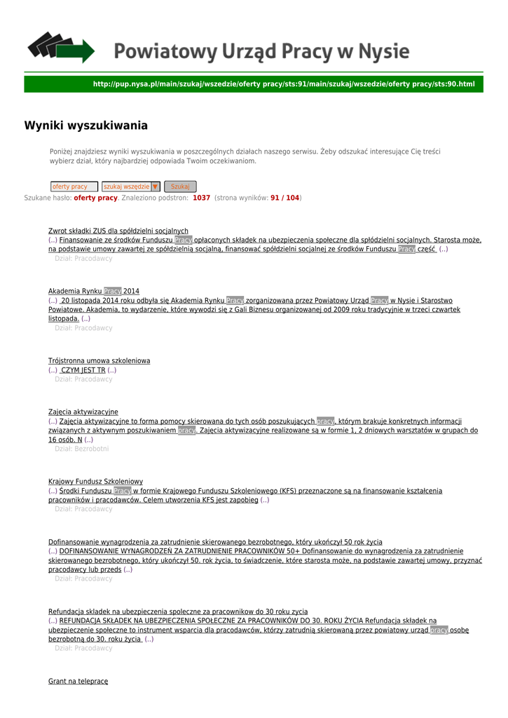 http://pup.nysa.pl/main/szukaj/wszedzie/oferty pracy/sts:91/main/szukaj/wszedzie/oferty pracy/sts:90.html Wyniki wyszukiwania Poniżej znajdziesz wyniki wyszukiwania w poszczególnych działach naszego serwisu. Żeby odszukać interesujące Cię treści wybierz dział, który najbardziej odpowiada Twoim oczekiwaniom. oferty pracy szukaj wszędzie ▼ Szukaj Szukane hasło: oferty pracy. Znaleziono podstron: 1037 (strona wyników: 91 / 104) 901 Zwrot składki ZUS dla spółdzielni socjalnych (..) Finansowanie ze środków Funduszu Pracy opłaconych składek na ubezpieczenia społeczne dla spłódzielni socjalnych. Starosta może, na podstawie umowy zawartej ze spółdzielnią socjalną, finansować spółdzielni socjalnej ze środków Funduszu Pracy część (..) Dział: Pracodawcy 902 Akademia Rynku Pracy 2014 (..) 20 listopada 2014 roku odbyła się Akademia Rynku Pracy zorganizowana przez Powiatowy Urząd Pracy w Nysie i Starostwo Powiatowe. Akademia, to wydarzenie, które wywodzi się z Gali Biznesu organizowanej od 2009 roku tradycyjnie w trzeci czwartek listopada. (..) Dział: Pracodawcy 903 Trójstronna umowa szkoleniowa (..) CZYM JEST TR (..) Dział: Pracodawcy 904 Zajęcia aktywizacyjne (..) Zajęcia aktywizacyjne to forma pomocy skierowana do tych osób poszukujących pracy, którym brakuje konkretnych informacji związanych z aktywnym poszukiwaniem pracy. Zajęcia aktywizacyjne realizowane są w formie 1, 2 dniowych warsztatów w grupach do 16 osób. N (..) Dział: Bezrobotni 905 Krajowy Fundusz Szkoleniowy (..) Środki Funduszu Pracy w formie Krajowego Funduszu Szkoleniowego (KFS) przeznaczone są na finansowanie kształcenia pracowników i pracodawców. Celem utworzenia KFS jest zapobieg (..) Dział: Pracodawcy 906 Dofinansowanie wynagrodzenia za zatrudnienie skierowanego bezrobotnego, który ukończył 50 rok życia (..) DOFINANSOWANIE WYNAGRODZEŃ ZA ZATRUDNIENIE PRACOWNIKÓW 50+ Dofinansowanie do wynagrodzenia za zatrudnienie skierowanego bezrobotnego, który ukończył 50. rok życia, to świadczenie, które starosta może, na podstawie zawartej umowy, przyznać pracodawcy lub przeds (..) Dział: Pracodawcy 907 Refundacja skladek na ubezpieczenia spoleczne za pracownikow do 30 roku zycia (..) REFUNDACJA SKŁADEK NA UBEZPIECZENIA SPOŁECZNE ZA PRACOWNIKÓW DO 30. ROKU ŻYCIA Refundacja składek na ubezpieczenie społeczne to instrument wsparcia dla pracodawców, którzy zatrudnią skierowaną przez powiatowy urząd pracy osobę bezrobotną do 30. roku życia (..) Dział: Pracodawcy 908 Grant na telepracę (..) GRANT NA TELEPRACĘ Grant na telepracę to świadczenie, które starosta może, na podstawie zawartej umowy, przyznać pracodawcy lub przedsiębiorcy na utworzenie stanowiska pracy w formie telepracy. KTO MOŻE PRACOWAĆ W RAMACH GRANTU NA TELEPRACĘ? Starosta może pr (..) Dział: Pracodawcy 909 Zaświadczenie (restrukturyzacja zakładu pracy) (..) (..) Dział: Pliki do pobrania 910 Akademia Rynku Pracy 2013 (..) W dniu 25 listopada 2013 roku w Nyskim Domu Kultury odbyła się Akademia Rynku Pracy.W trakcie Akademii został uruchomiony program "Karta Młodego Przedsiębiorcy" oraz wyłoniona została firma roku 2013. Akademia Rynku Pracy - forum dialogu przedsiębiorcy (..) Dział: Pracodawcy ● ● ● ● ● ● ● ● ● ● ● ● ● ● ● « Pierwsza < Poprzednia 86 87 88 89 90 91 92 93 94 95 96 Następna > Ostatnia »