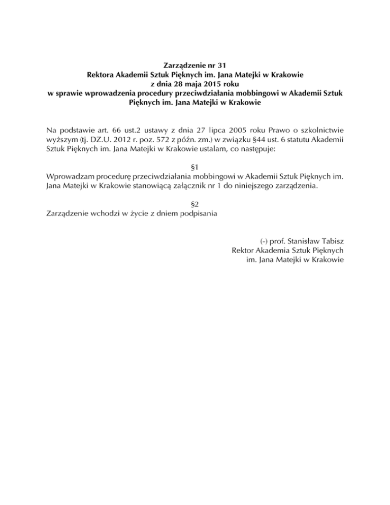Załącznik nr 1 do Zarządzenia Nr 31/2015 Rektora ASP w Krakowie z dnia 28 maja 2015 r. PROCEDURA PRZECIWDZIAŁANIA MOBBINGOWI W AKADEMII SZTUK PIĘKNYCH W KRAKOWIE Tytuł I Zasady i definicje Definicje § 1. Pojęciom używanym w niniejszej strategii nadaje się następujące znaczenie: 1) Kodeks pracy – ustawa z dnia 26 czerwca 1974 r. Kodeks pracy (tekst jednolity Dz. U. z 2014 r. poz. 1502 z późn. zm.); 2) Komisja antymobbingowa - organ, działający w ASP w Krakowie, którego zadaniem jest przeciwdziałanie Mobbingowi oraz sankcjonowanie przypadków Mobbingu. 3) Mąż zaufania – osoba wyznaczona przez Pracodawcę, której zadaniem jest zbieranie danych na temat wszelkich ewentualnych przejawów Mobbingu oraz podejmowanie działań związanych z zapobieganiem, badaniem i sankcjonowaniem Mobbingu. 4) Mediacja - działania podejmowane przez Męża zaufania, podczas których wskazuje on Osobom zainteresowanym możliwe sposoby wyjścia z konfliktu i rozwiązania problemu; 5) Mobbing - działania lub zachowania dotyczące pracownika lub skierowane przeciwko Pracownikowi, polegające na uporczywym i długotrwałym nękaniu lub zastraszaniu Pracownika, wywołujące u niego zaniżoną ocenę przydatności zawodowej, powodujące lub mające na celu poniżenie lub ośmieszenie Pracownika, izolowanie go lub wyeliminowanie z zespołu współpracowników. 6) Moderator – Mąż zaufania działający jako osoba trzecia prowadząca spotkanie Osób zainteresowanych, na którym własne poglądy wypowiadają Osoby zainteresowane i same zmierzają do rozwiązania problemu; 7) Osoba zainteresowana – każda osoba, której stawiany jest zarzut dopuszczenia się Mobbingu i każda osoba mobbowana (ofiara Mobbingu); 8) Pracownik – każda osoba fizyczna świadcząca dla ASP pracę na podstawie umowy o pracę - bez względu na jej rodzaj oraz rodzaj wykonywanej pracy i zajmowane stanowisko; 9) ASP/Pracodawca –Akademia Sztuk Pięknych z siedzibą w Krakowie; 10) Procedura – niniejsza procedura przeciwdziałania mobbingowi w ASP; 11) Skład orzekający – organ składający się z 3 członków Komisji antymobbingowej, w tym Męża zaufania zajmującego się konkretnym przypadkiem Mobbingu, powoływanych do rozstrzygnięcia przypadku Mobbingu przez Przewodniczącego, albo w przypadku jego nieobecności zastępcę Przewodniczącego Komisji antymobbingowej; 12) Zgłoszenie – zgłoszenie zaistnienia przypadku Mobbingu dokonane przez Pracownika, w tym ofiarę lub świadka Mobbingu , zgodnie z Procedurą. Cel i zakres działania Procedury § 2. 1. Postanowienia Procedury mają na celu ochronę Pracowników ASP przed stosowaniem Mobbingu w miejscu pracy lub w związku z pracą oraz w przypadkach wystąpienia Mobbingu. 2. Ochrona, o której mowa w ust. 1, obejmuje wszystkich Pracowników ASP, bez względu na rodzaj wykonywanej pracy lub zajmowane stanowisko. Tytuł II Prawa i obowiązki Pracowników i Pracodawcy Obowiązki Pracodawcy § 3. 1. ASP zobowiązane jest podejmować wszelkie dozwolone przepisami prawa działania, w tym działania opisane w Procedurze, celem zapobiegania Mobbingowi w miejscu pracy lub w związku z pracą wykonywaną przez Pracowników na rzecz ASP. 2. ASP zobowiązana jest podejmować wszelkie, przewidziane przepisami prawa działania, w tym działania opisane w Procedurze, celem niwelowania skutków społecznych Mobbingu, w tym w szczególności podejmować działania interwencyjne i udzielać pomocy ofiarom Mobbingu. 3. ASP jest uprawniona i zobowiązana do podejmowania wszelkich przewidzianych przepisami prawa, w tym w szczególności przepisami Kodeksu pracy, działań wobec osób będących sprawcami Mobbingu. § 4. 1. ASP zobowiązana jest podjąć działania opisane w Procedurze w każdym przypadku dokonania Zgłoszenia. 2. ASP podejmuje działania wskazane w Procedurze również w każdym przypadku powzięcia informacji o zaistnieniu zjawiska Mobbingu z innego źródła aniżeli Zgłoszenie. Uprawnienia i obowiązki Pracowników § 5. 1. Każdy Pracownik, w stosunku do którego podejmowany jest Mobbing ma prawo żądać podjęcia przez Pracodawcę działań zmierzających do przeciwdziałania Mobbingowi i jego skutkom. 2. Skorzystanie przez Pracownika z uprawnienia wskazanego w ust. 1 niniejszego paragrafu w żaden sposób nie wyłącza prawa Pracownika do dochodzenia ochrony prawnej na podstawie obowiązujących przepisów prawa. Skorzystanie przez Pracownika z takich środków ochrony prawnej nie jest również w żaden sposób uzależnione od wcześniejszego zastosowania postanowień Procedury. 3. Każdy z Pracowników, który posiada lub poweźmie informację o przypadkach Mobbingu jest uprawniony do dokonania Zgłoszenia. 4. Pomawianie o Mobbing jest zabronione. Odpowiedzialność za Mobbing § 6. 1. Osoby mobbujące, podlegają odpowiedzialności przewidzianej w przepisach prawa, w tym w szczególności w Kodeksie pracy. 2. Odpowiedzialności, o której mowa w ust. 1 niniejszego paragrafu podlegają również osoby, które pomawiają o stosowanie Mobbingu. Tytuł III Działania prewencyjne Przeciwdziałanie Mobbingowi § 7. 1. ASP prowadzi aktywną politykę przeciwdziałania Mobbingowi, polegającą w szczególności na: 1) podejmowaniu działań prewencyjnych,; 2) podejmowaniu działań interwencyjnych zmierzających do natychmiastowego zaprzestania Mobbingu , w szczególności opisanego w § 16 Procedury. 2. ASP podejmuje działania prewencyjne mające na celu przeciwdziałanie Mobbingowi polegające, w szczególności, na: 1) obowiązkowym przeszkoleniu Pracowników z zakresu problematyki Mobbingu oraz przeciwdziałania temu zjawisku; 2) tworzeniu materiałów informacyjnych na temat Mobbingu oraz udostępnianiu ich Pracownikom. Tytuł IV Organy przeciwdziałające Mobbingowi § 8. W celu przeciwdziałania i sankcjonowania Mobbingu w ASP powołuje się następujące organy: 1) Mąż zaufania; 2) Komisja antymobbingowa. Mąż zaufania § 9. 1. Wybór Męża z