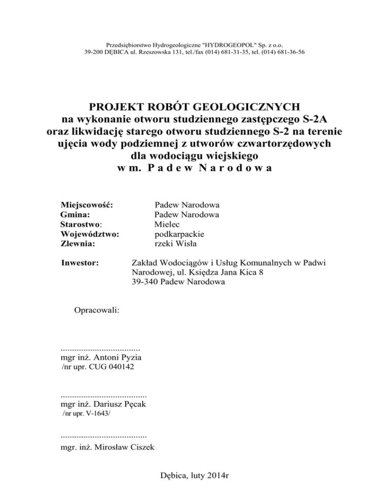 Przedsiębiorstwo Hydrogeologiczne "HYDROGEOPOL" Sp. z o.o. 39-200 DĘBICA ul. Rzeszowska 131, tel./fax (014) 681-31-35, tel. (014) 681-36-56 PROJEKT ROBÓT GEOLOGICZNYCH na wykonanie otworu studziennego zastępczego S-2A oraz likwidację starego otworu studziennego S-2 na terenie ujęcia wody podziemnej z utworów czwartorzędowych dla wodociągu wiejskiego w m. P a d e w N a r o d o w a Miejscowość: Gmina: Starostwo: Województwo: Zlewnia: Inwestor: Padew Narodowa Padew Narodowa Mielec podkarpackie rzeki Wisła Zakład Wodociągów i Usług Komunalnych w Padwi Narodowej, ul. Księdza Jana Kica 8 39-340 Padew Narodowa Opracowali: ................................... mgr inż. Antoni Pyzia /nr upr. CUG 040142 ...................................... mgr inż. Dariusz Pęcak /nr upr. V-1643/ ...................................... mgr. inż. Mirosław Ciszek Dębica, luty 2014r 2 Spis treści: 1. Wstęp 2. Analiza materiałów archiwalnych 2.1. Wykaz wykorzystanych materiałów archiwalnych 2.2. Wykaz wykorzystanych materiałów pomocniczych i literatury 2.3. Analiza materiałów archiwalnych 3. Lokalizacja, morfologia i hydrografia terenu badań 4. Warunki geologiczne i hydrogeologiczne rejonu badań 4.1. Budowa geologiczna 4.2. Warunki hydrogeologiczne 4.3. Jakość wody 5. Projektowane prace wiertniczo-badawcze 5.1. Rozwiązanie zadania geologicznego 5.2. Wiercenie i zafiltrowanie otworu zastępczego 5.3. Badania hydrogeologiczne 5.4. Pobieranie prób gruntu i wody 5.5. Niezbędne prace geodezyjne 5.6. Prace likwidacyjne starego otworu studziennego nr S-2 6. Określenie formy dokumentacji wynikowej badań 7. Określenie wpływu zamierzonych robót geologicznych na obszary chronione, w tym obszary Natura 2000. 8. Opis przedsięwzięć technicznych, technologicznych i organizacyjnych, mających na celu zapewnienie bezpieczeństwa powszechnego, bezpieczeństwa pracy i ochronę środowiska 9. Harmonogram projektowanych robót geologicznych 10. Wnioski i zalecenia Spis załączników: 1. 2. 3. 4. 5. 6. 7. 8. 9. Mapa topograficzna w skali 1:50 000 Mapa topograficzna w skali 1:10 000 Mapa geologiczna Polski w skali 1:50 000 Mapa geologiczno-gospodarcza Polski w skali 1:50 000 Mapa sytuacyjno-wysokościowa w skali 1: 1000 Archiwalne zbiorcze zestawienia wyników wiercenia studni ujęcia Projekt geologiczno - techniczny otworu zastępczego S-2A Projekt likwidacji otworu studziennego S-2 Kserokopia decyzji zatwierdzającej zasoby eksploatacyjne ujęcia wód podziemnych w Padwi Narodowej 10. Wypis i wyrys z rejestru gruntów 3 1. Wstęp Projekt niniejszy opracowany został na zlecenie Zakładu Wodociągów i Usług Komunalnych w Padwi Narodowej, ul. Księdza Jana Kica 8, 39-340 Padew Narodowa. Celem opracowania jest zaprojektowanie prac i badań hydrogeologicznych związanych z wykonaniem otworu studziennego zastępczego nr S-2A na terenie ujęcia wody podziemnej w m. Padew Narodowa dla potrzeb wodociągu wiejskiego. Ujęcie wody podziemnej w m. Padew Narodowa, składa się z wykonanych w 1994r przez P.P.U „Terracon” Sp z o.o. Tarnobrzeg studni wierconych nr S-1, S-2 i S-3. Zasoby eksploatacyjne tego ujęcia zatwierdzone zostały decyzją Urzędu Wojewódzkiego w Tarnobrzegu nr OS.III.7530/65/94/WZ z dnia 16.12.1994r. Sumaryczne zasoby ujęcia wynosiły 61,4 m 3/h, w tym dla poszczególnych studni: dla S-1 QE=24,8 m3/h przy SE=1,8 m dla S-2 QE=21,0 m3/h przy SE=1,8 m dla S-3 QE=15,6 m3/h przy SE=1,4 m Z uwagi na znaczny spadek wydajności studni nr S-1 w 2007 r wykonana została studnia zastępcza nr S-1A udokumentowana w “Dodatku nr 1 do Dokumentacji hydrogeologicznej zasobów wód podziemnych z utworów czwartorzędowych w kat. B w m. Padew Narodowa, dotyczącym wykonania studni zastępczej nr S-1A” przyjętym przez Marszałka Województwa Podkarpackiego. Wydajność eksploatacyjna studni zastępczej nr S-1A ustalona została na poziomie wydajności starej studni nr S-1, tj. 25,0 m3/h, a stara studnia została zlikwidowana. Na podstawie pomiarów i obserwacji prowadzonych podczas eksploatacji ujęcia stwierdzono permanentnie występujące braki wody dla potrzeb wodociągu w m. Padew Narodowa. Braki te były szczególnie duże i b. dotkliwe w okresach letnich, kiedy to wzrasta rozbiór wody. Szacunkowo ustalono, że deficyt wody wynosił w granicach 50 – 60 m 3/h, tj ok. 80 – 98% wielkości ustalonych i zatwierdzonych zasobów eksploatacyjnych istniejącego dotychczas ujęcia. W związku z tym podjęta została decyzja rozbudowy ujęcia. W roku 2009 wykonane zostały przez P.H. Hydrogeopol Dębica dodatkowe otwory studzienne S-4, S-5 i S-6. Udokumentowane one zostały w „DODATKU NR 2 do “Dokumentacji hydrogeologicznej zasobów wód podziemnych z utworów czwartorzędowych w kat. B w m. Padew Narodowa, woj. tarnobrzeskie” – dotyczący wykonania 3-ch dodatkowych studni nr S-4, S-5 i S-6 w ramach rozbudowy ujęcia dla potrzeb wodociągu wiejskiego w Padwi Narodowej” Dodatek ten został przyjęty przez Marszałka Województwa Podkarpackiego zawiadomieniem nr RŚ.IV.WZ.7521-17/09 z dnia 29.06.2009r. (zał.9). Ustalone zostały nowe łączne zasoby ujęcia wynoszące: Qe= 117,9 m3/h przy depresji se= 1,4 - 2,25 m 4 W chwili obecnej notuje się znaczny i systematyczny spadek wydajności otworu studziennego S-2 i w związku z tym zachodzi konieczność podejmowania prac mających na celu przywrócenie pierwotnej wydajności ujęcia. Zanik wydajności przedmiotowego otworu studziennego spowodowany jest prawdopodobnie kolmatacją części czynnej filtra PVC. W celu zapewnienia ciągłej i bezawaryjnej dostawy wody dla potrzeb istniejącego wodociągu wiejskiego, Zakład Wodociągów i Usług Komunalnych w Padwi Narodowej, który jest użytkownikiem ujęcia, zlecił opracowanie niniejszego projektu na wykonanie otworu studziennego S-2A. Zakłada się, że projektowany otwór zastępczy stanowić będzie odtworzenie pierwotnej wydajności ujęcia i w związku z tym ustalone i zatwierdzon